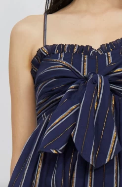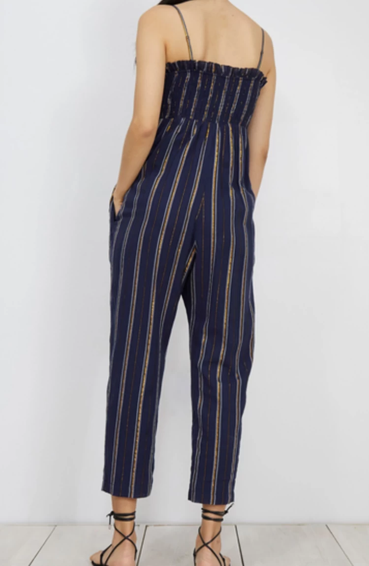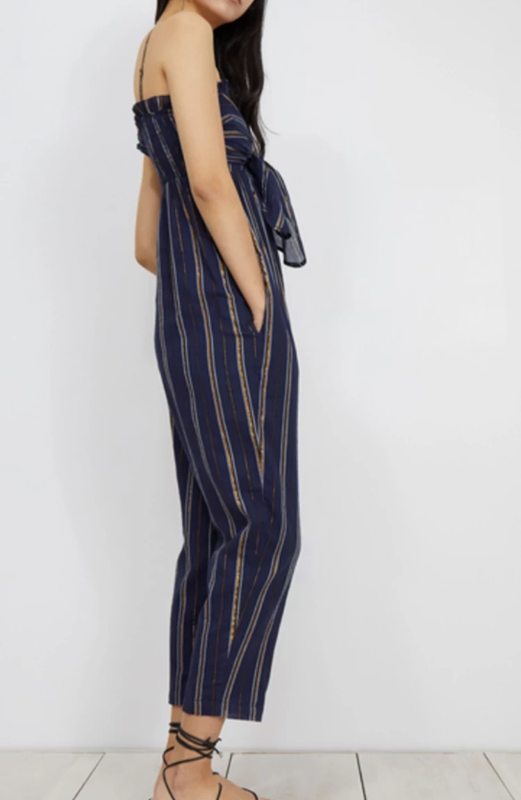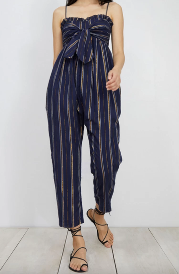 This easy tie-front jumpsuit in vintagey metallic stripes features hidden side pockets, a comfortable fit with tapered leg, adjustable straps and. Knot detail at the bust.