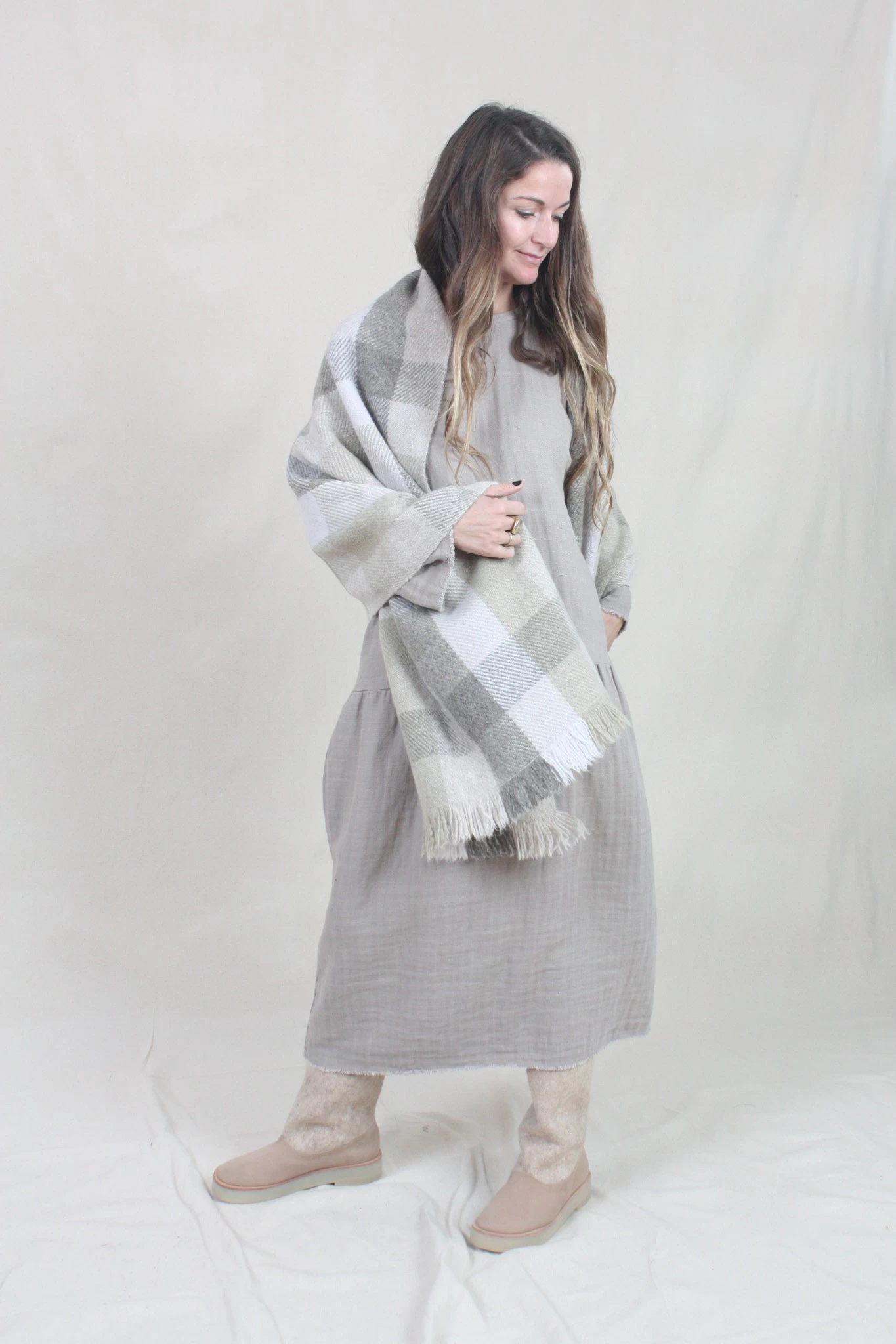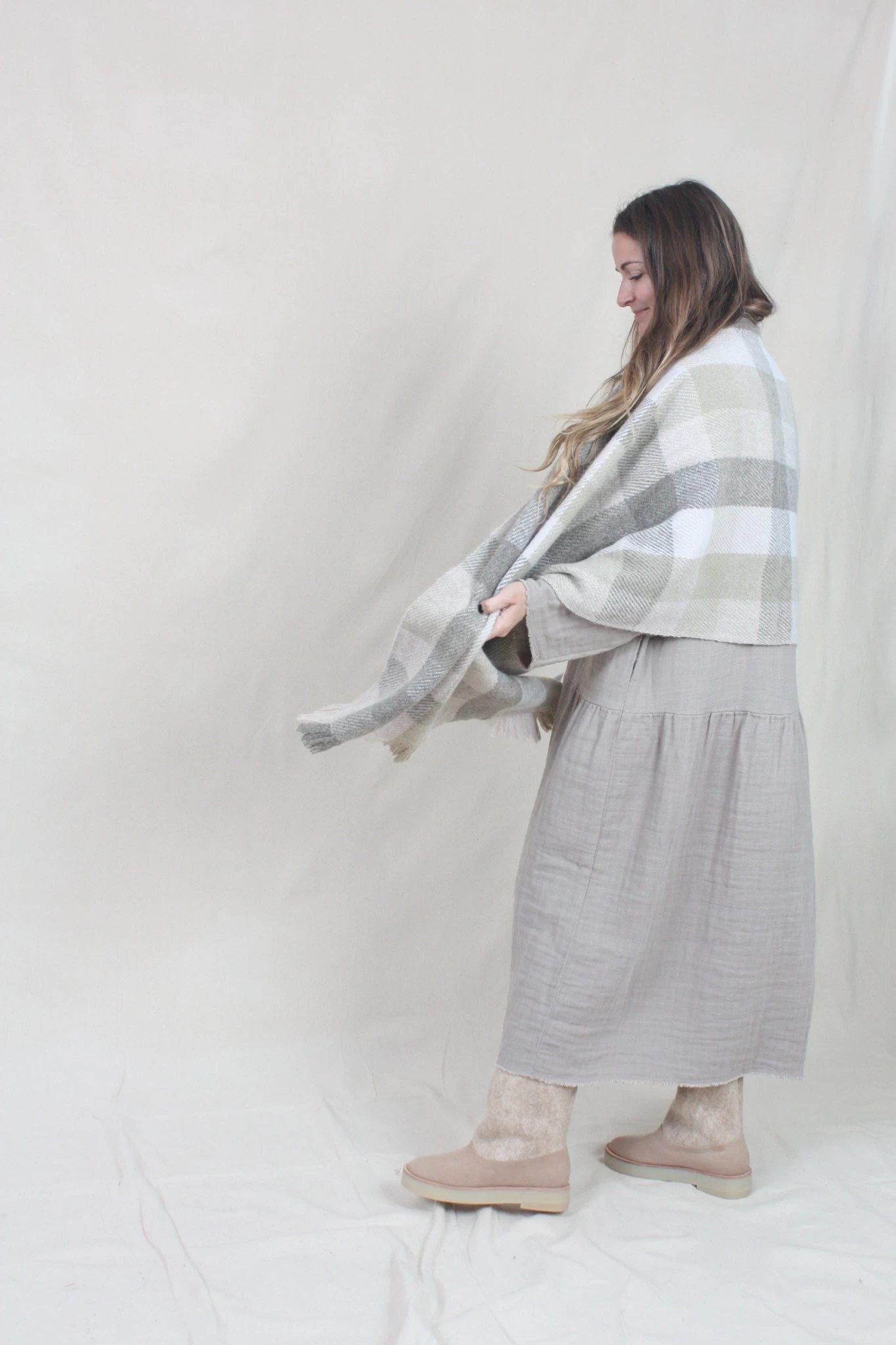 Checker patterned wrap with fringed edge. Softly washed hand.