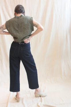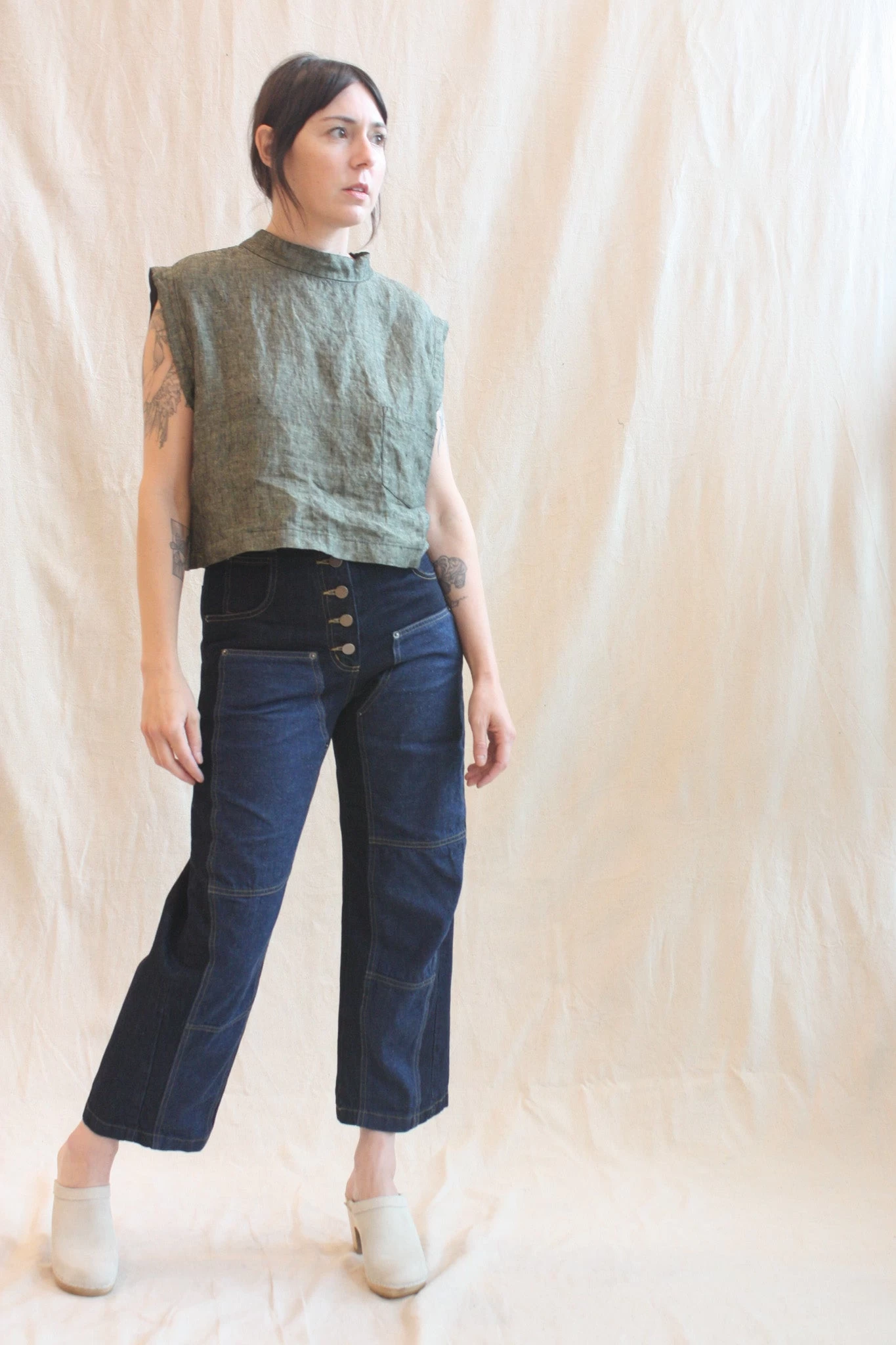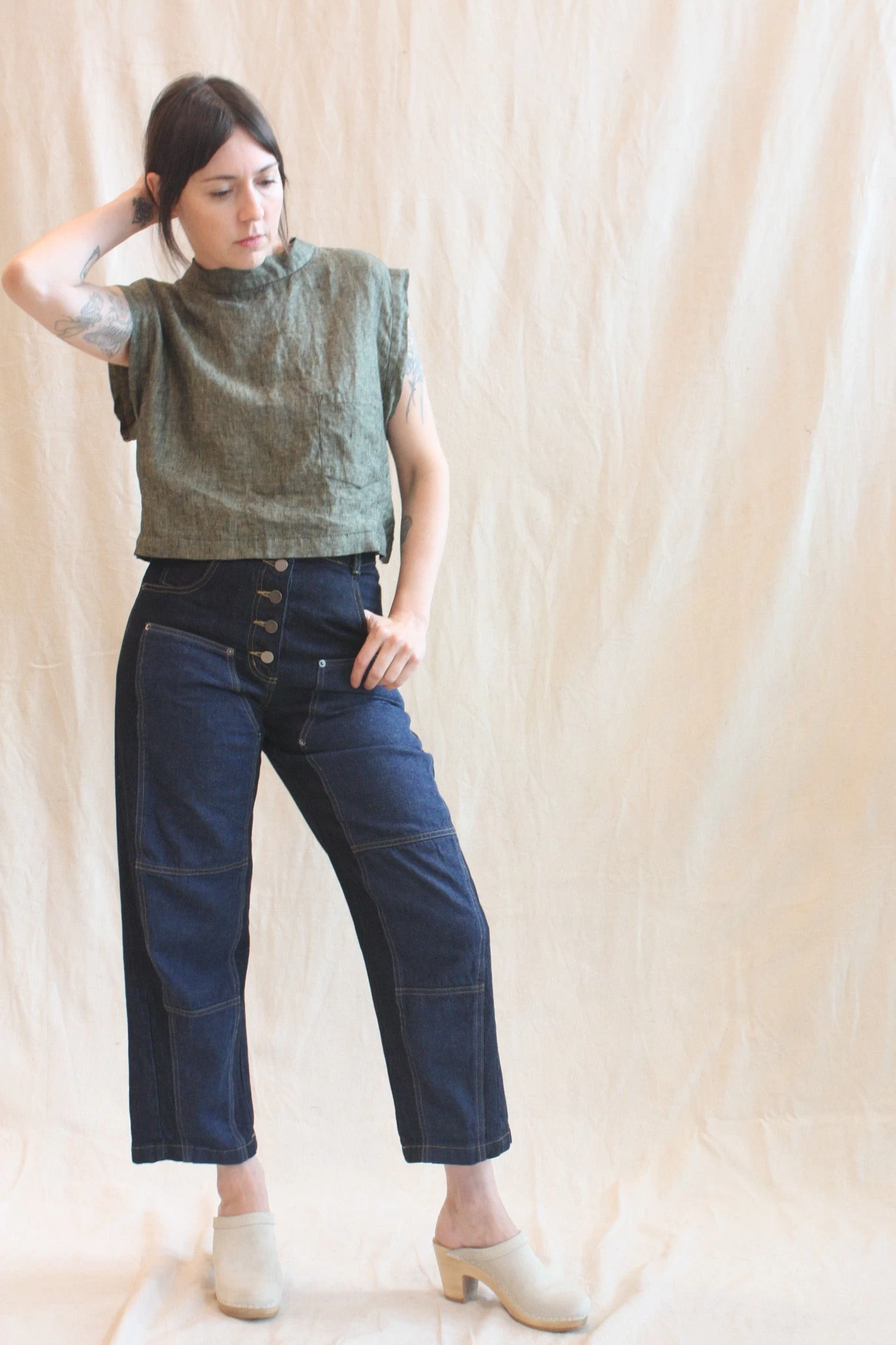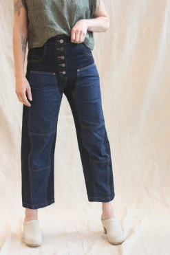A favorite relaxed, elevated carpenter pant with contrasting front patch panels, in medium weight Japanese indigo denim. This style can sit at the lower waist, on your hips, or tighten the back strap to sit higher at your natural waist. Angled darts give the leg a subtle cocoon shape that ends in a slight crop. Mid rise, straight leg, and exposed button fly closure. Five pocket styling. Workwear-inspired front patch panels.