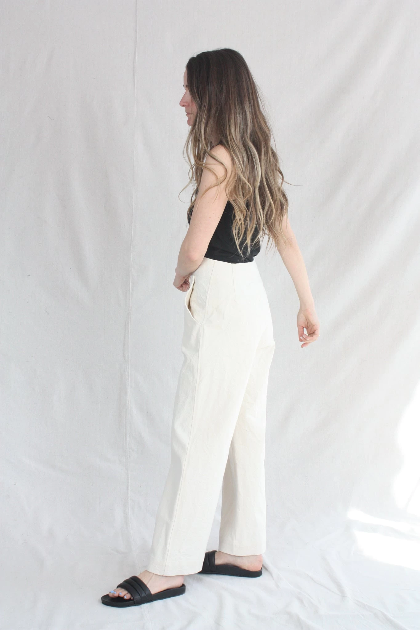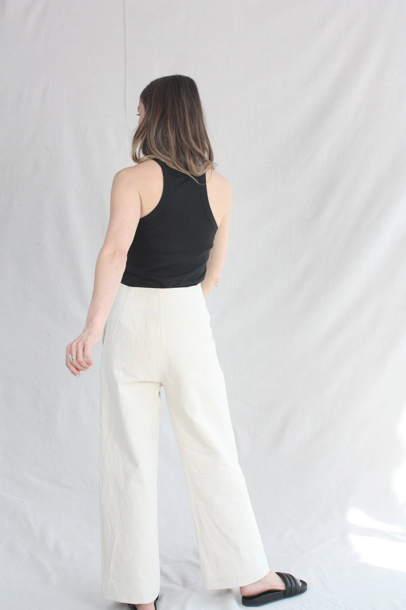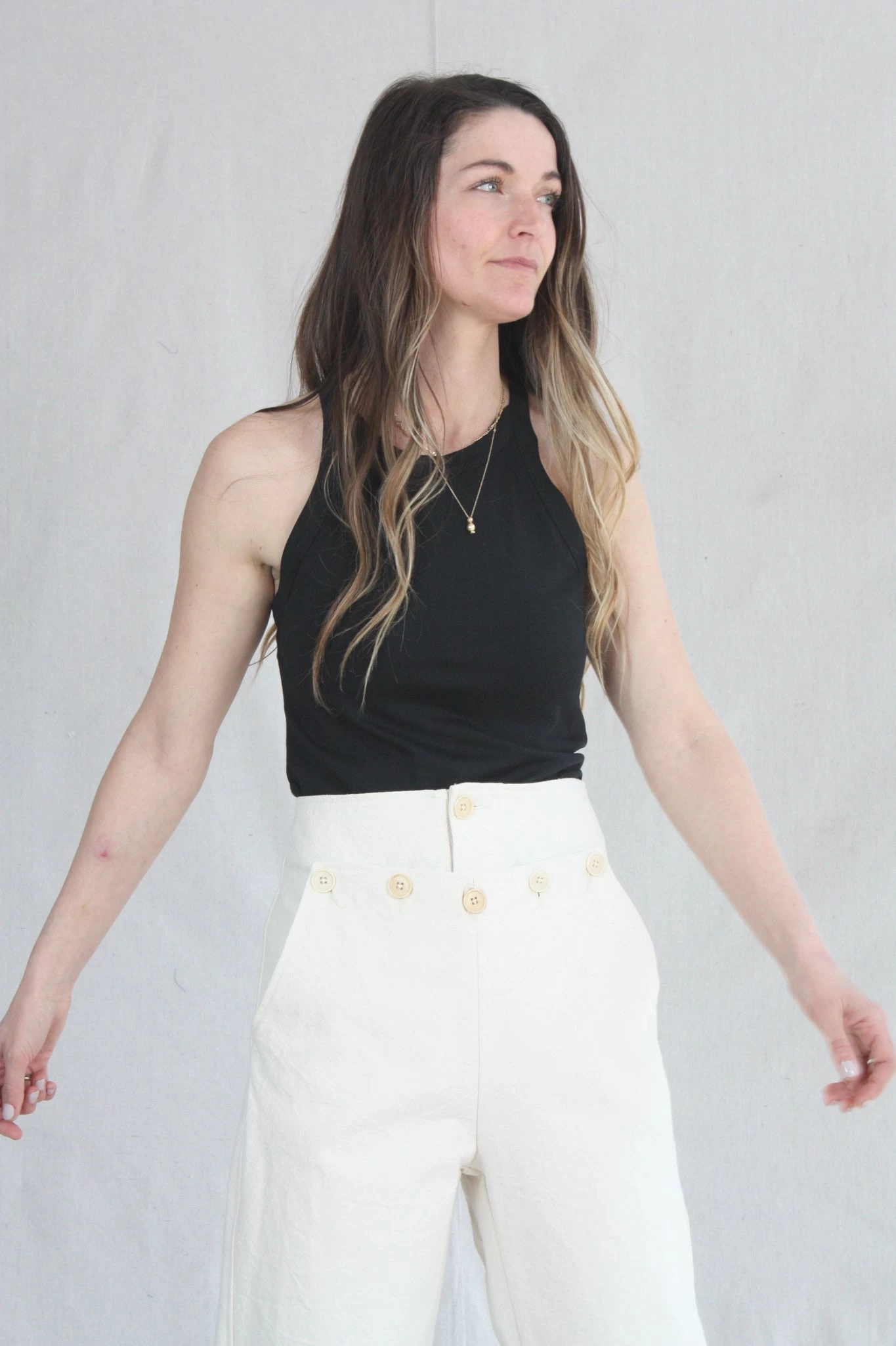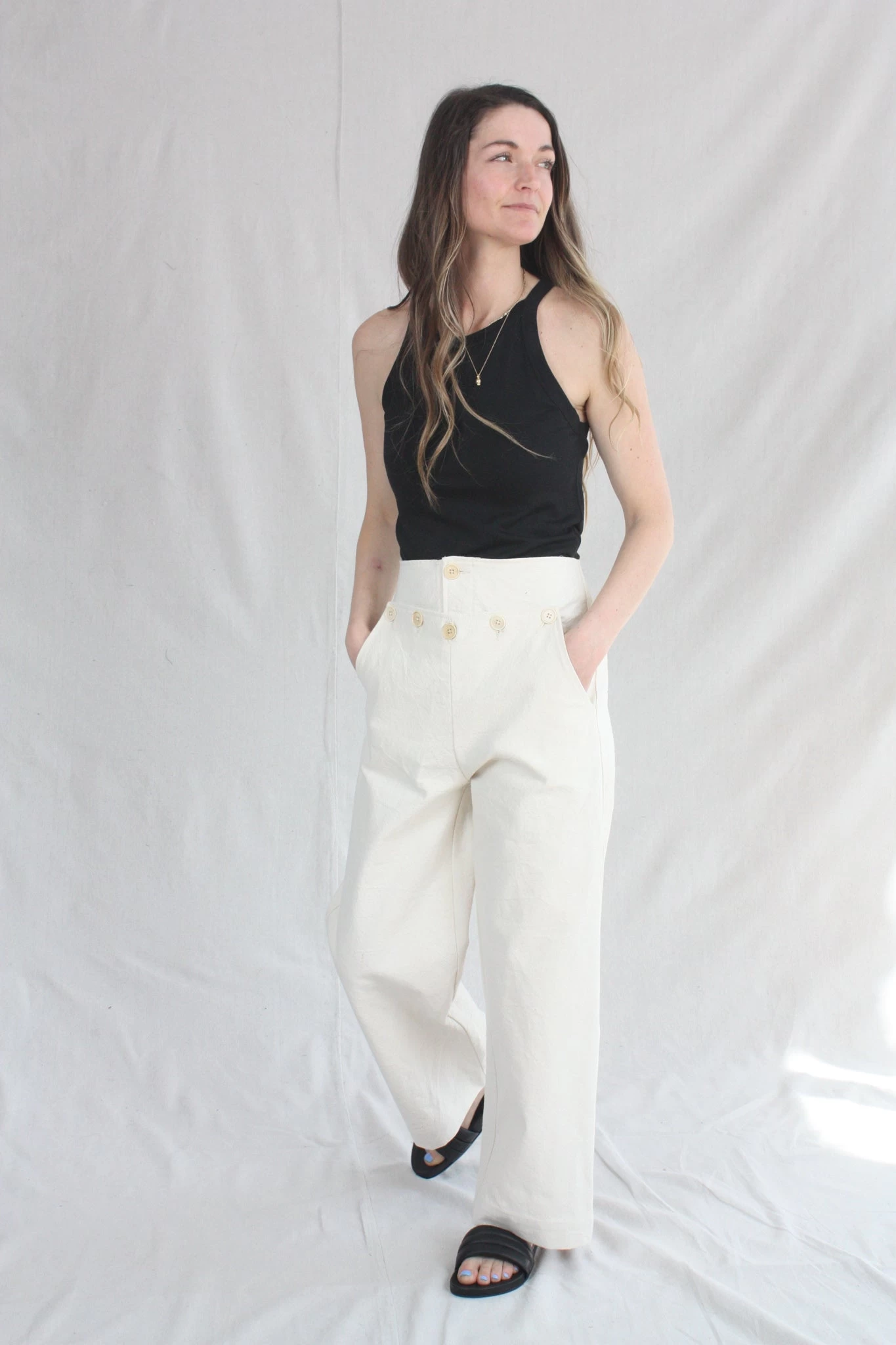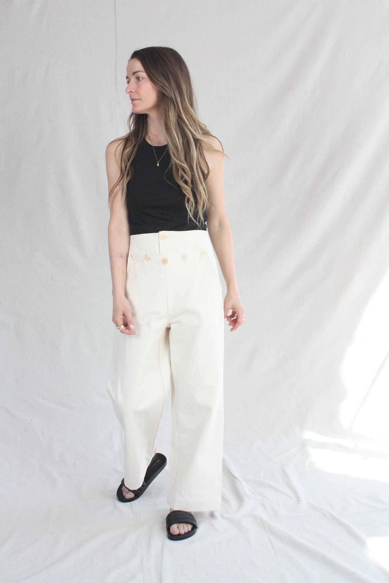 The Hanslo Pant is Caron Callahan’s take on the sailor pant with button detail at the waist that creates kangaroo pockets. The fit is flattering with a high waist and modest wide leg. Features a button fly and no back pockets.Â