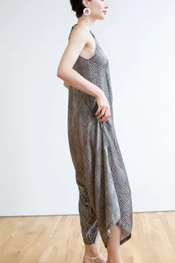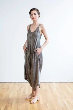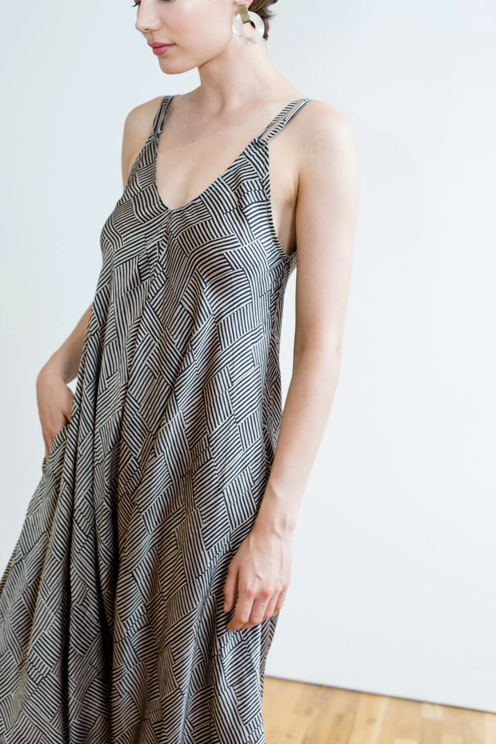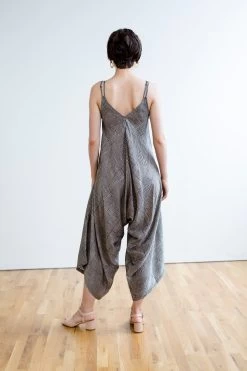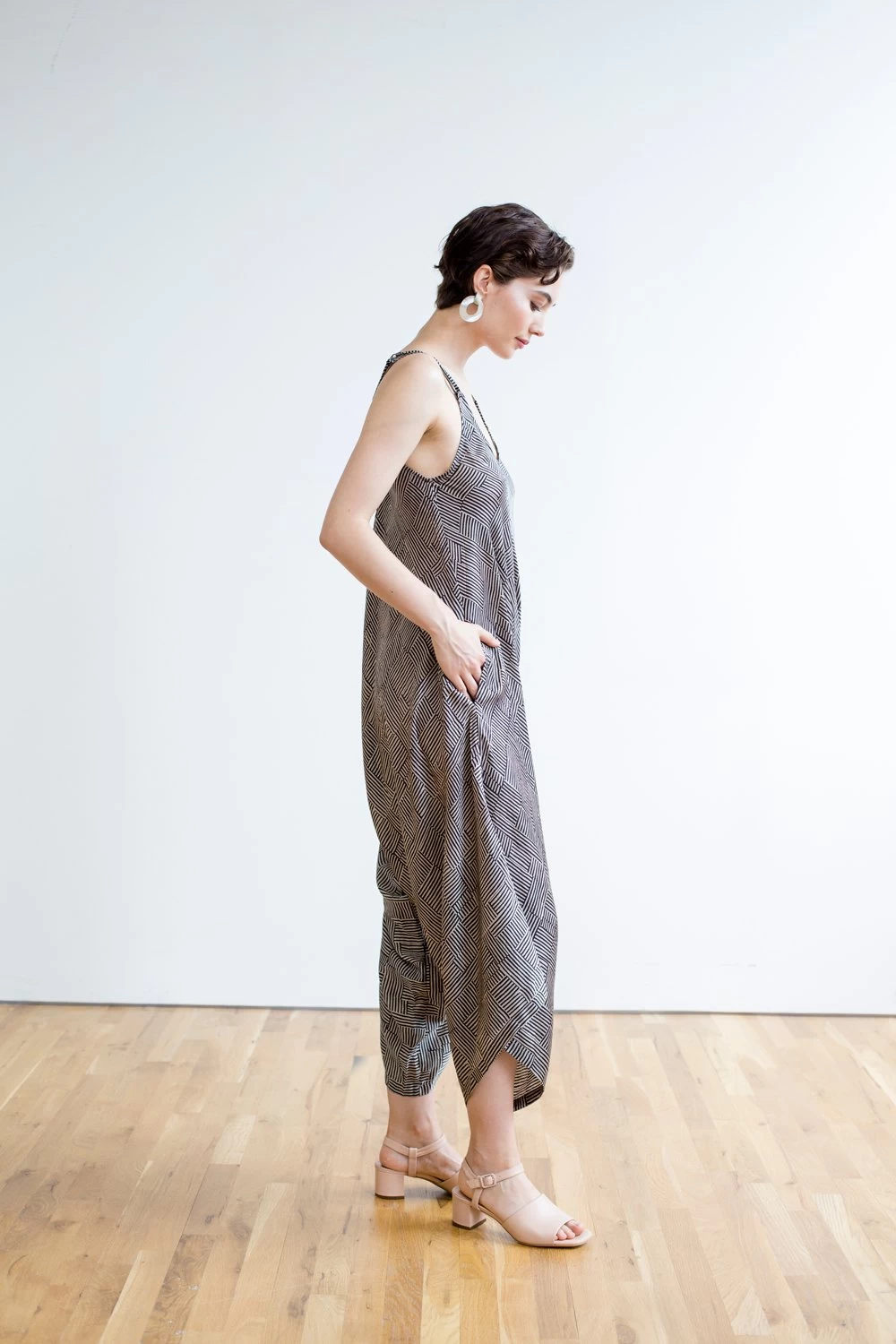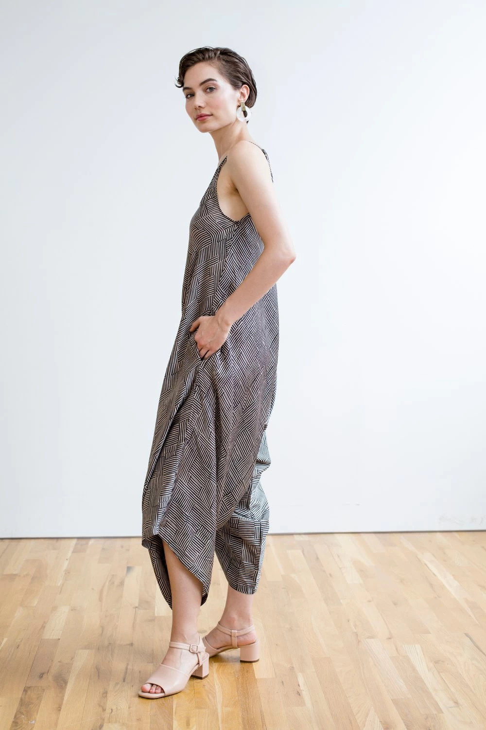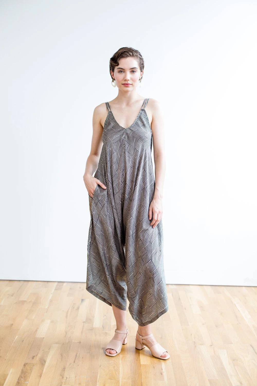 Bias cut jumper that fits comfortably with a low drop crotch. The slanted wide legs fall to mid-calf to ankle length. It features hidden front pockets and double spaghetti straps.