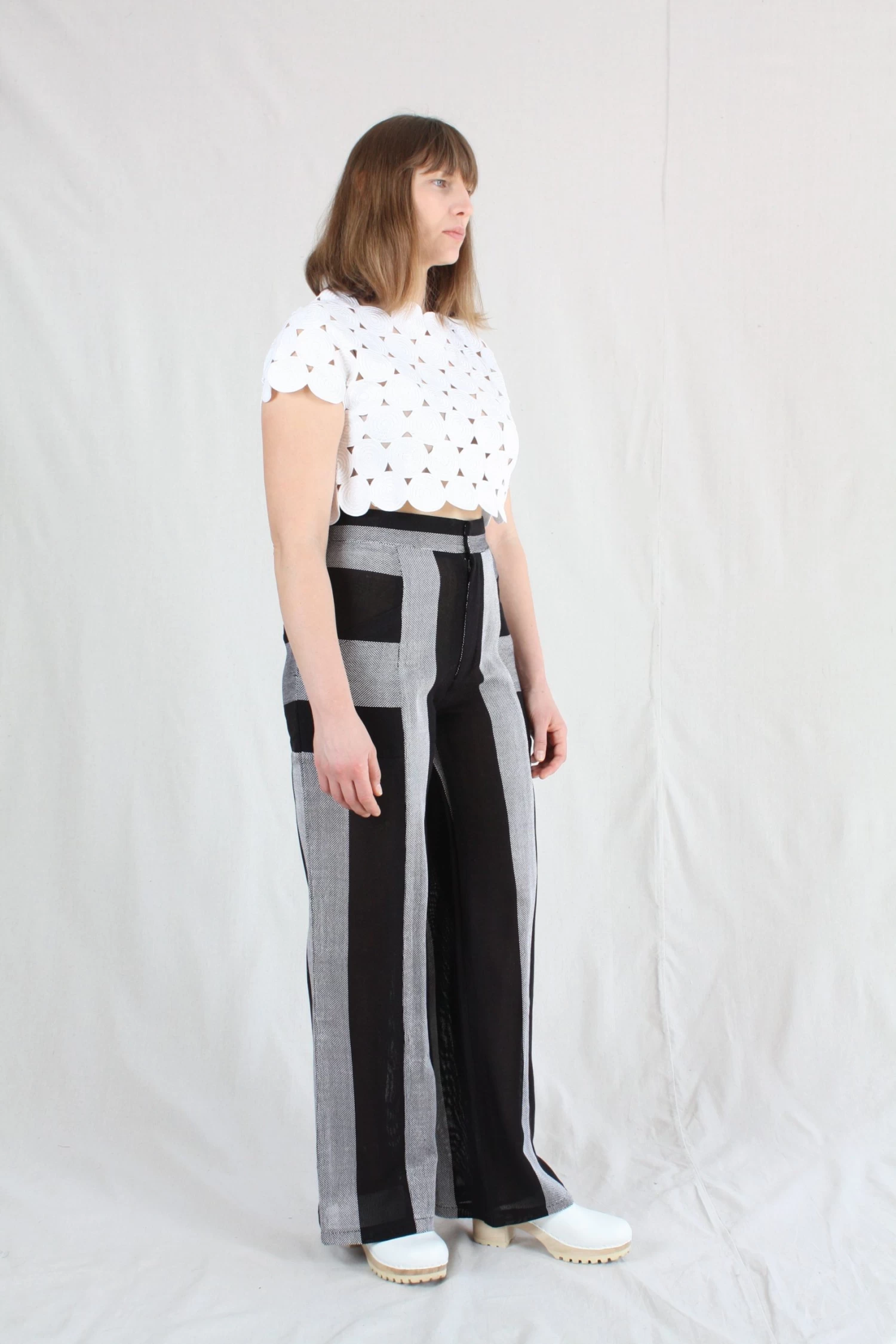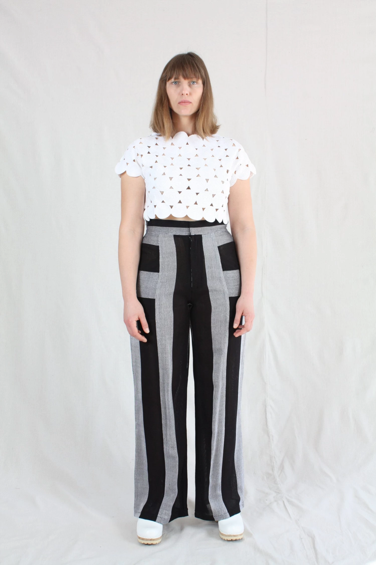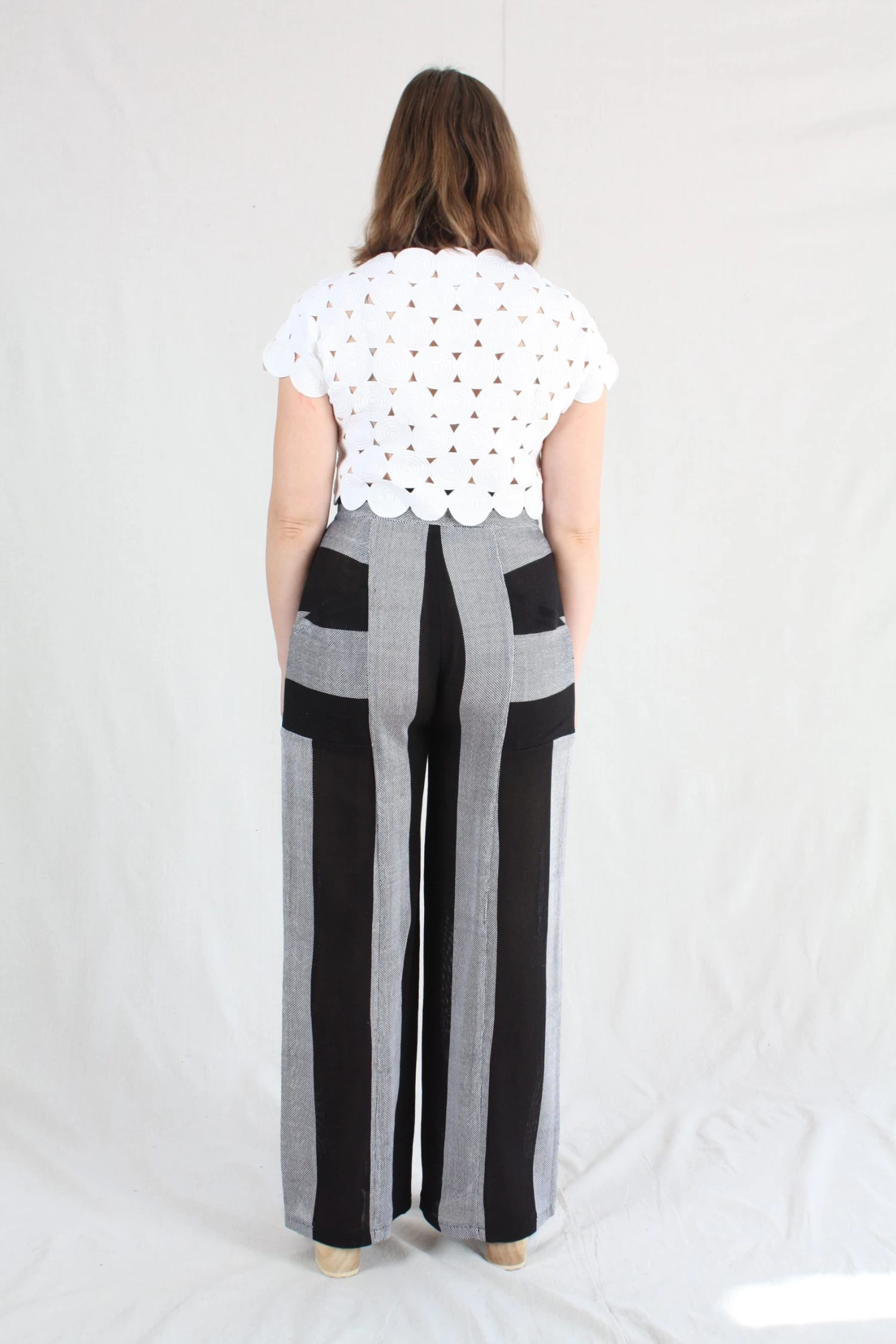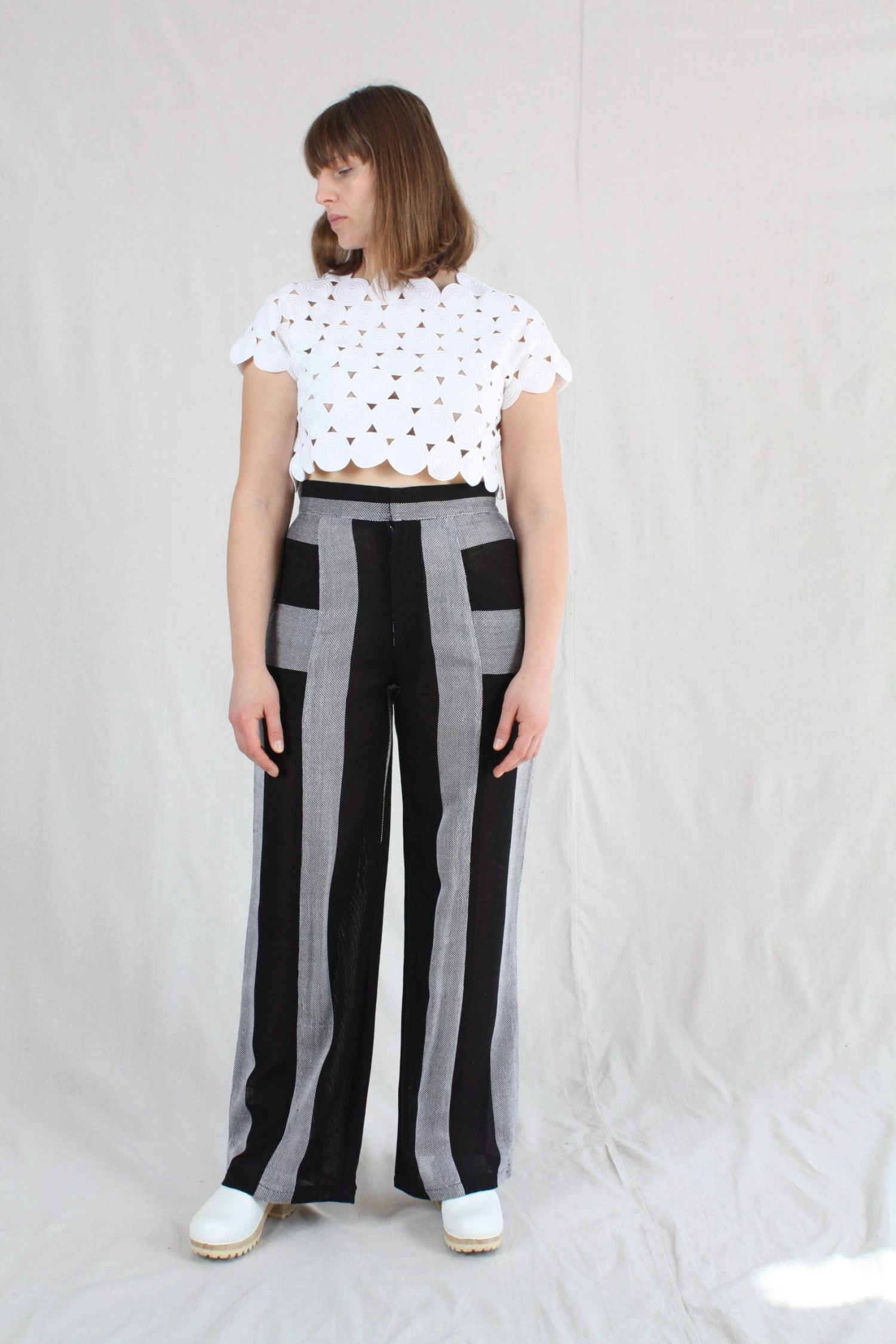 Trouser with a high waist and wide leg in a handwoven cotton mesh.Â