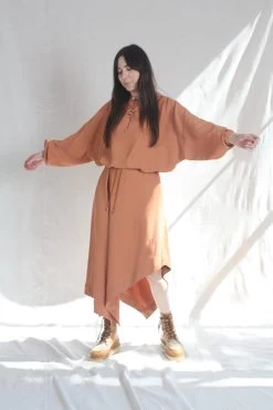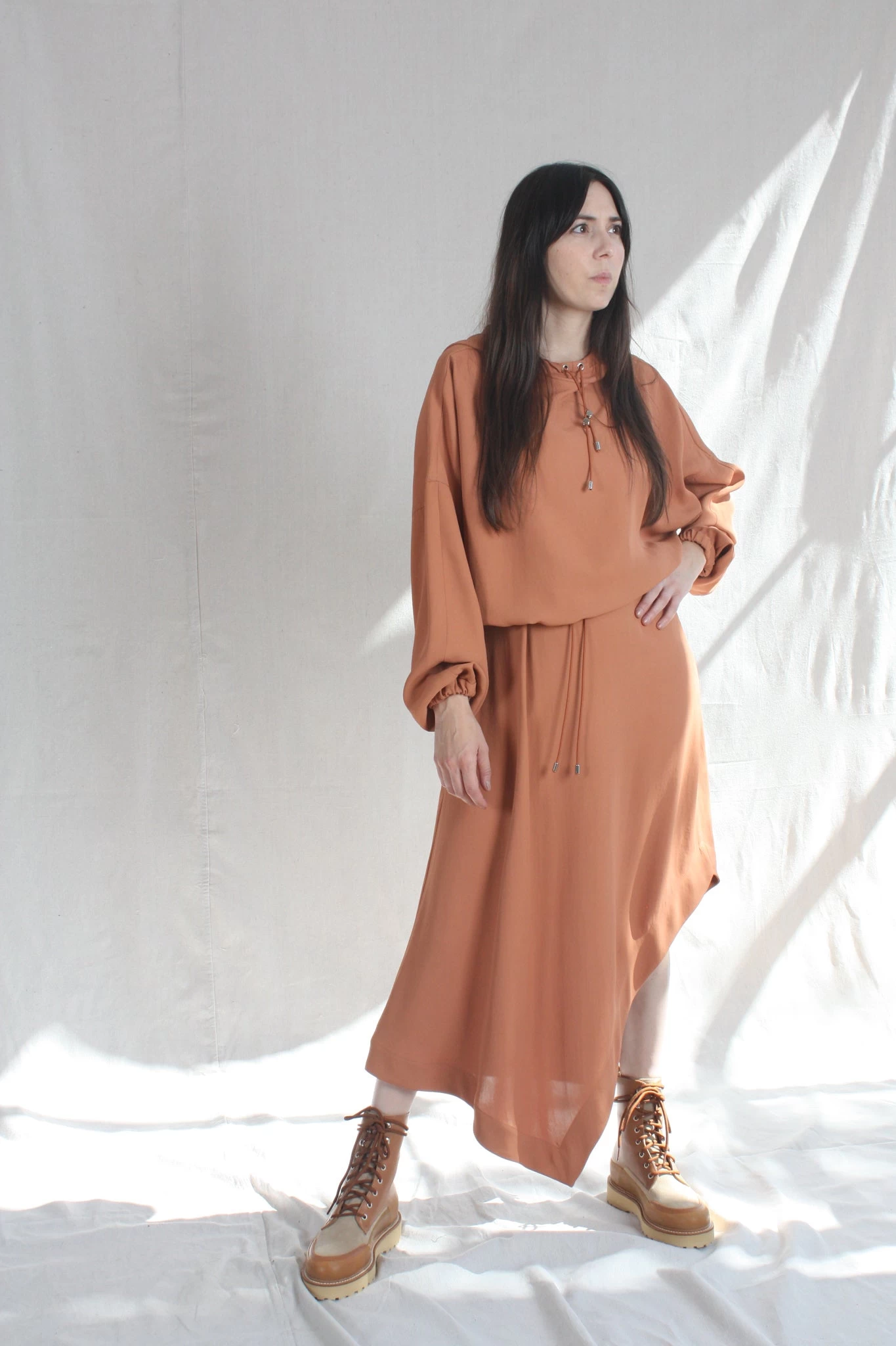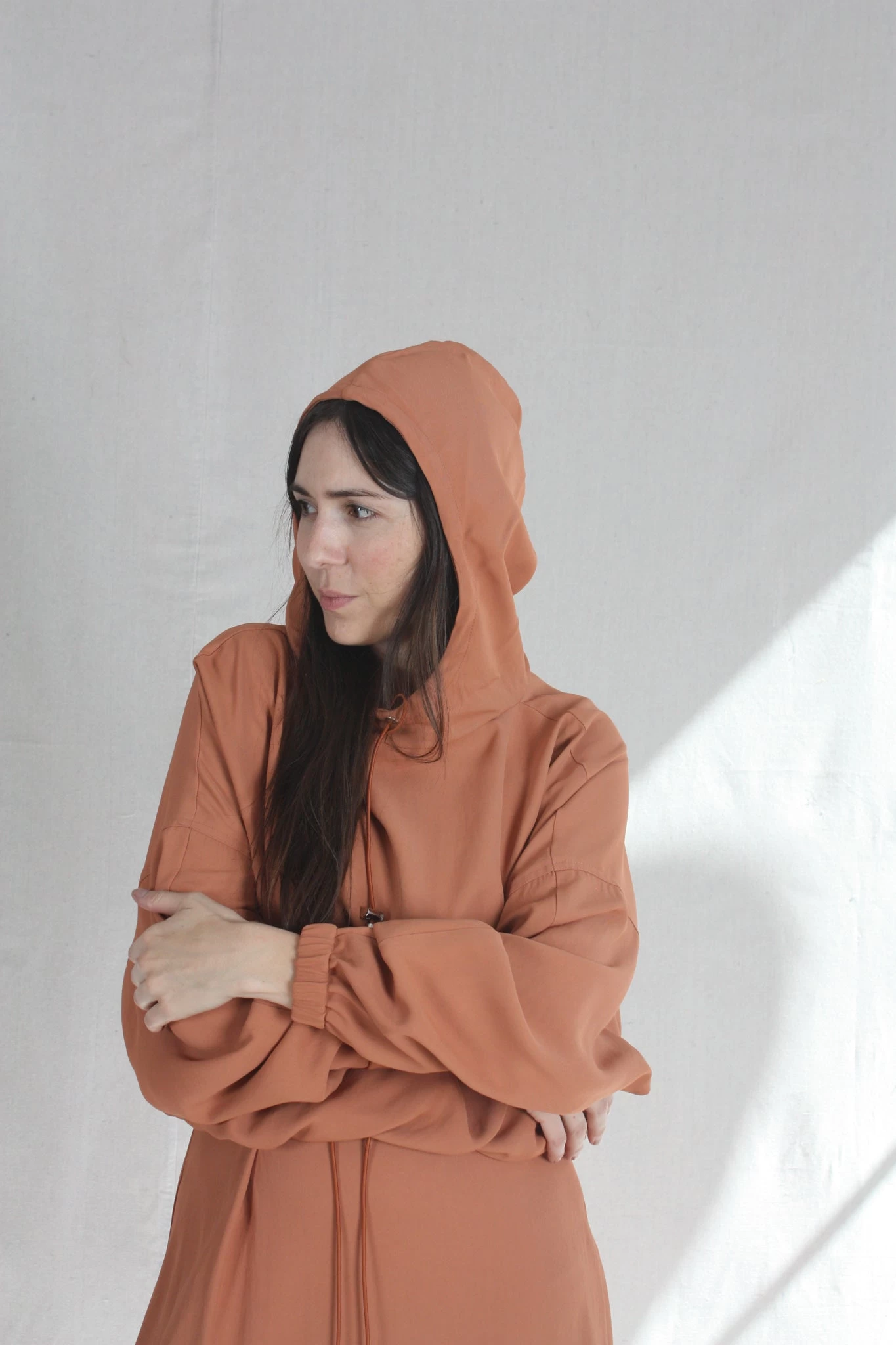 Oversized, slightly cropped hooded pullover with bungee drawcord and silvertone toggles on hood. Encased elastic cuffs at sleeve hem.Â