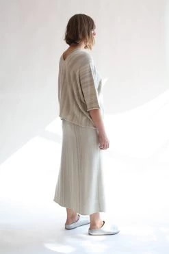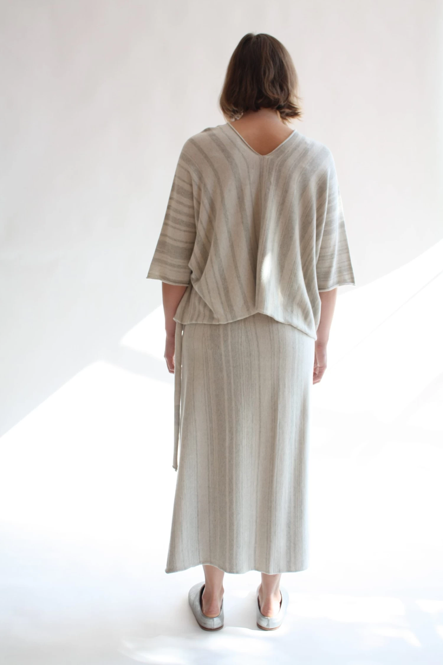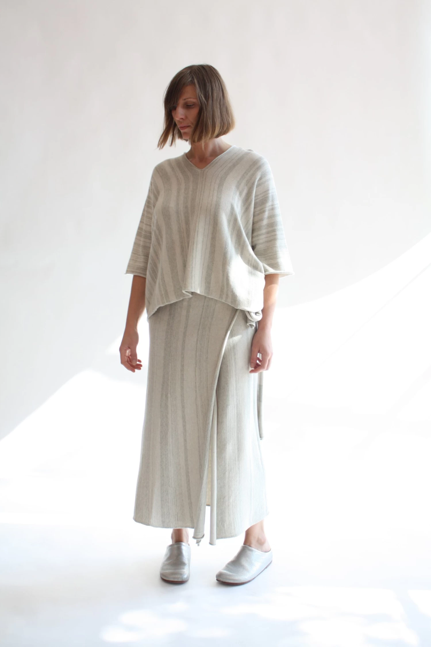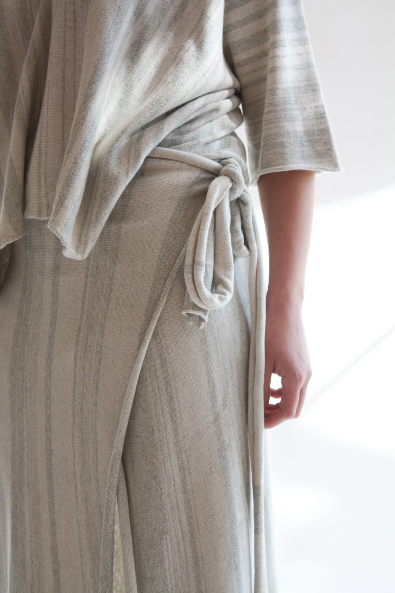 Adjustable Wrap Silhouette. Horizontally knit. Rolled edge belt.
