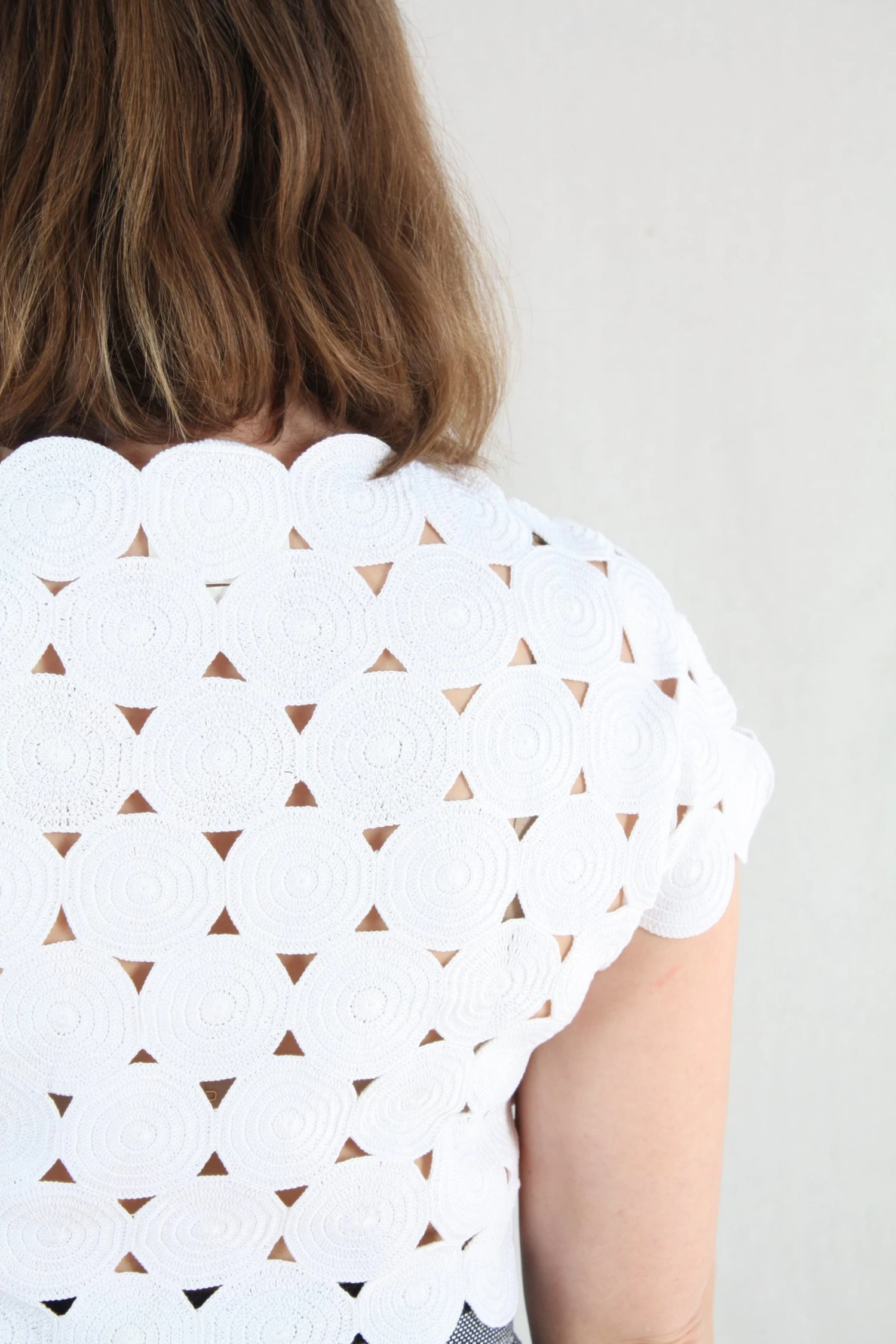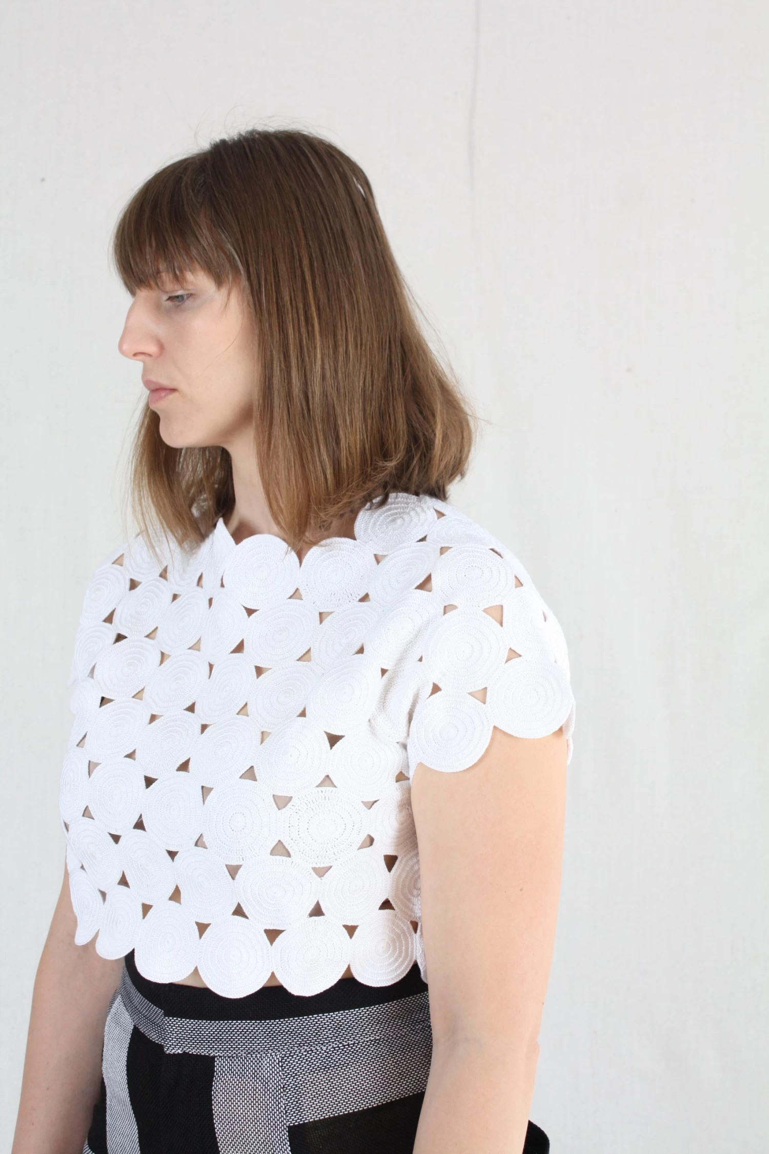 Hand made crochet circles make up this crop tee in optic white. Unlined.