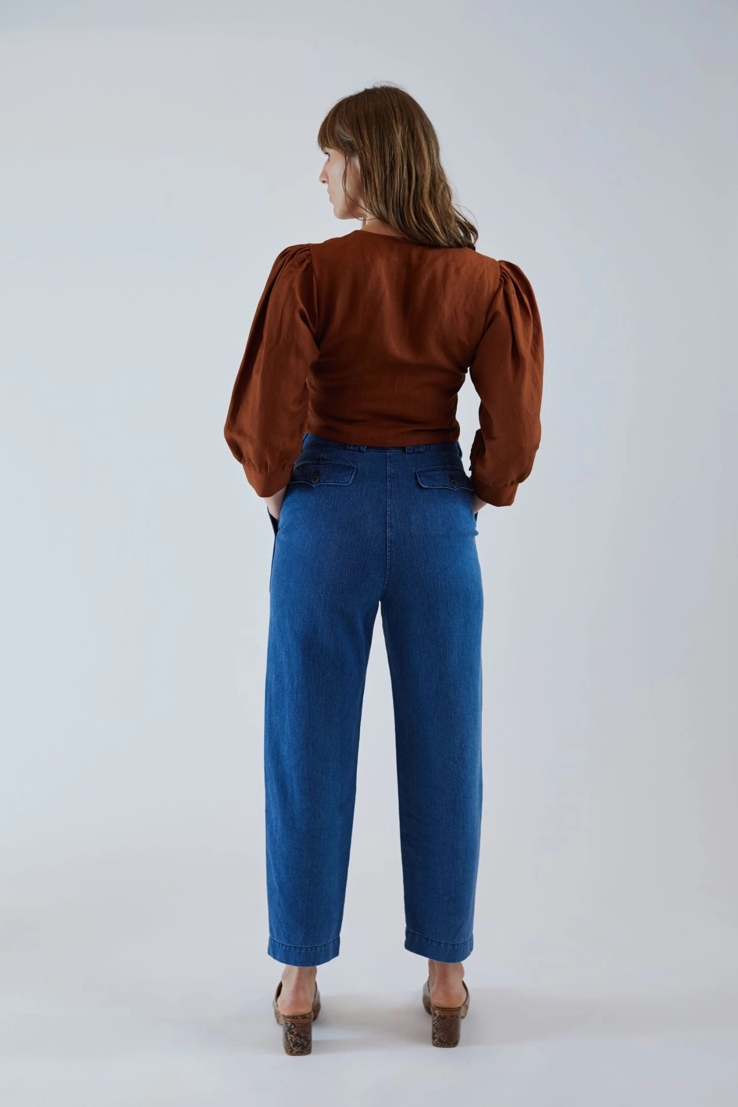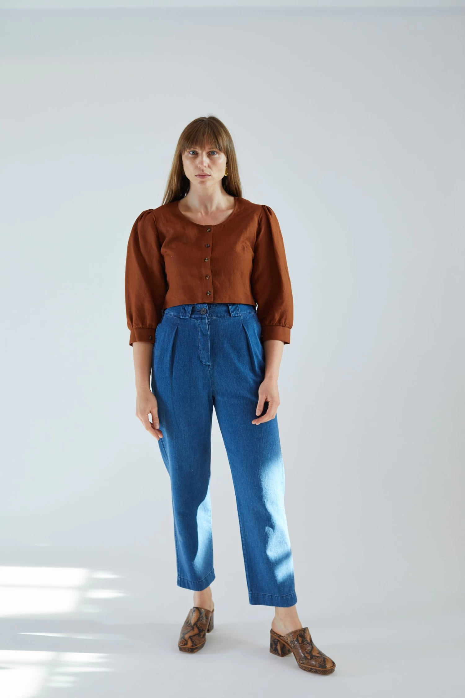 The Jude Blouse is styled slim and straight through the body with voluminous sleeves that taper into a more fitted cuff below the elbow. Closes with bone buttons down the center.