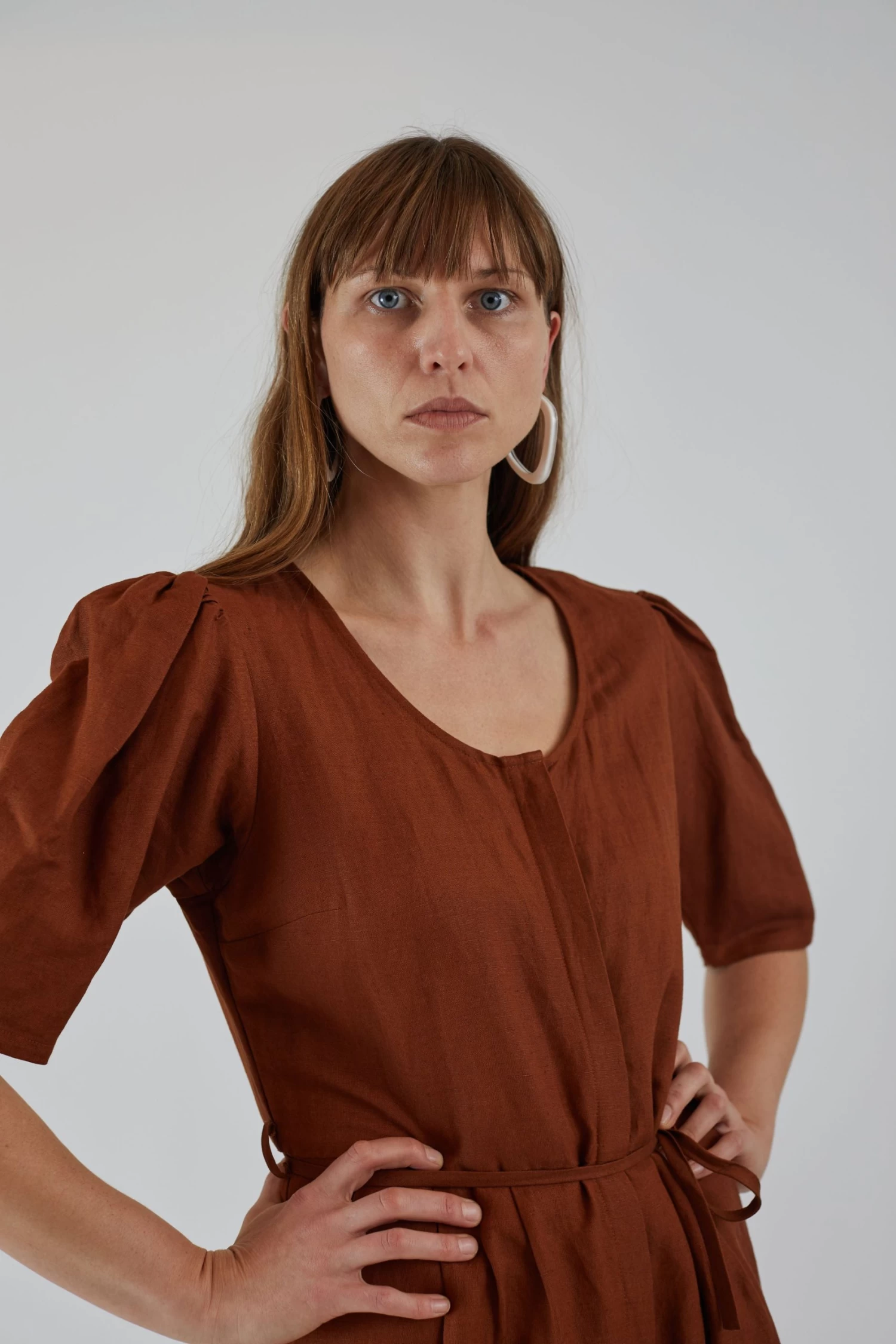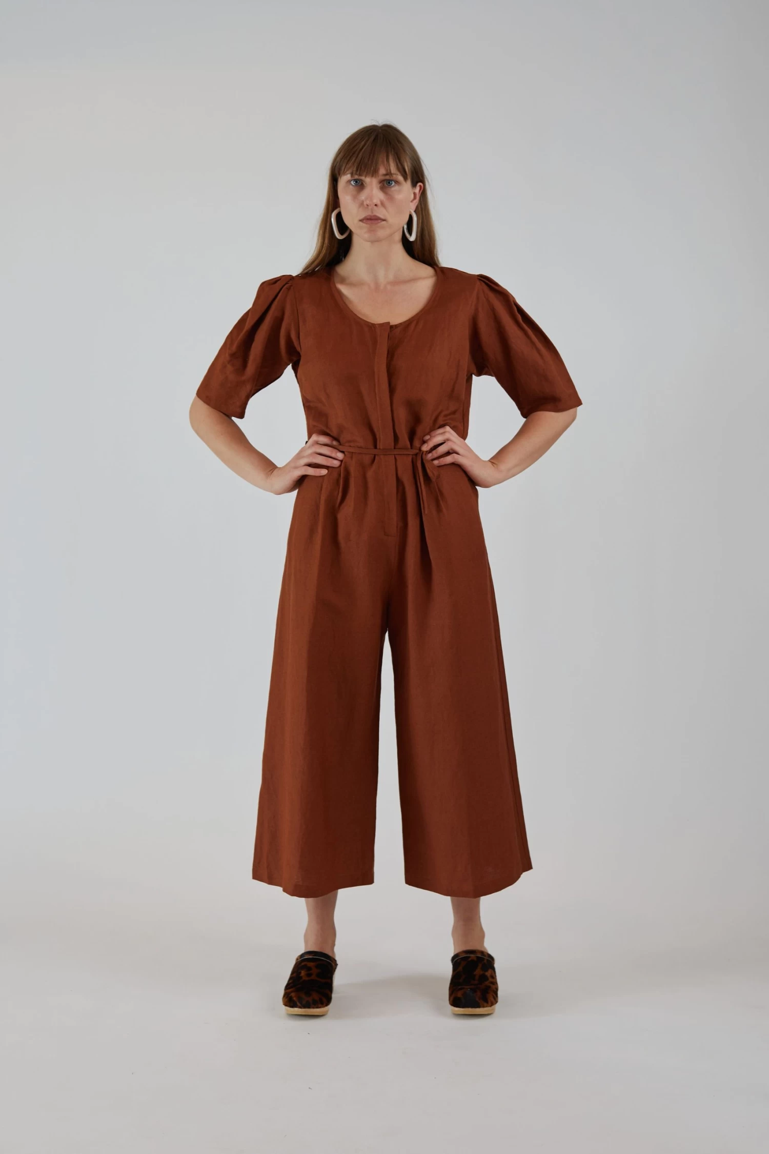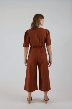 The Jude Pantsuit is styled straight through the body with voluminous sleeves at the shoulder that taper slightly to land right above elbow. The pants open up to a full cropped fit with pleats and pockets. Closes with hidden interior corozo or bone buttons down the center and ties at the waist for an adjustable fit.