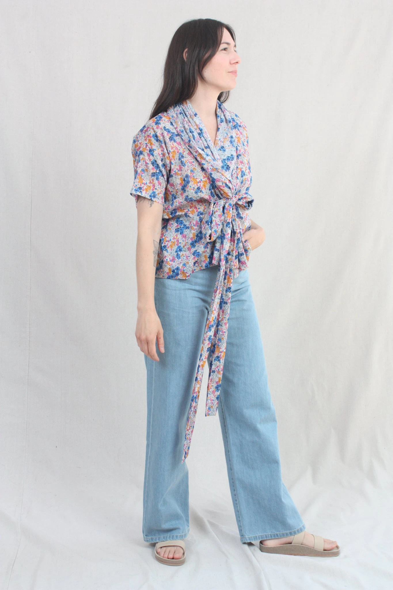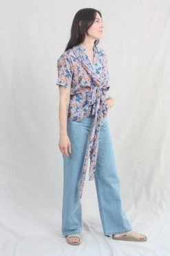 The Julien Top is a playful and unique take on an everyday blouse. Features a scarf neckline with a waist tie closure. Made in an apricot posy voile.