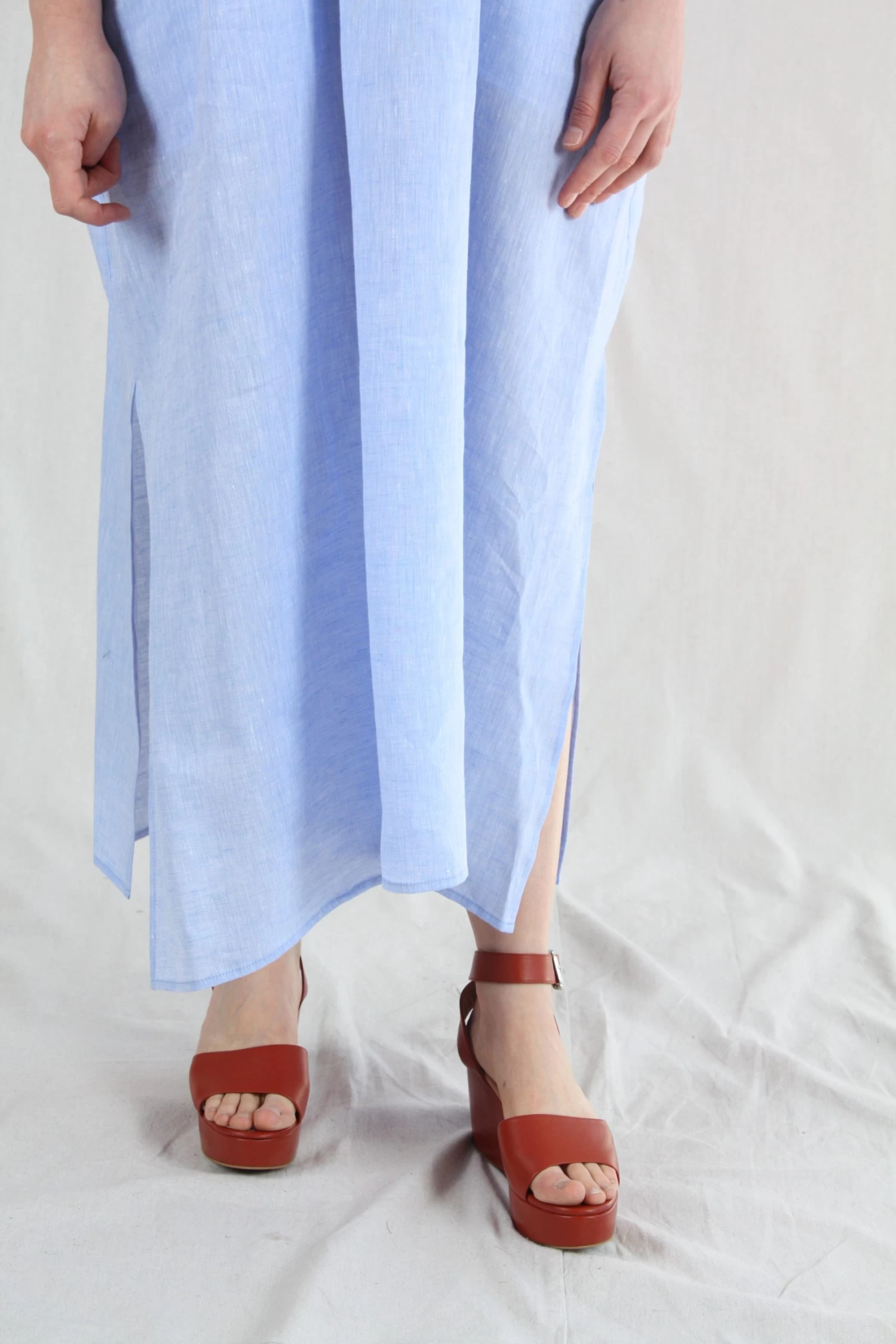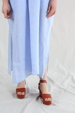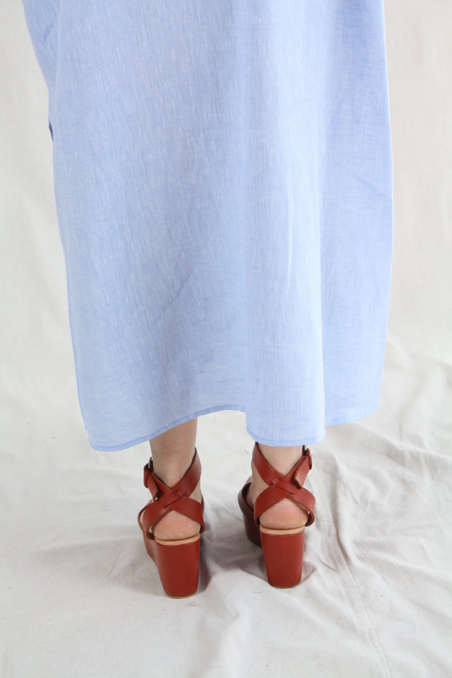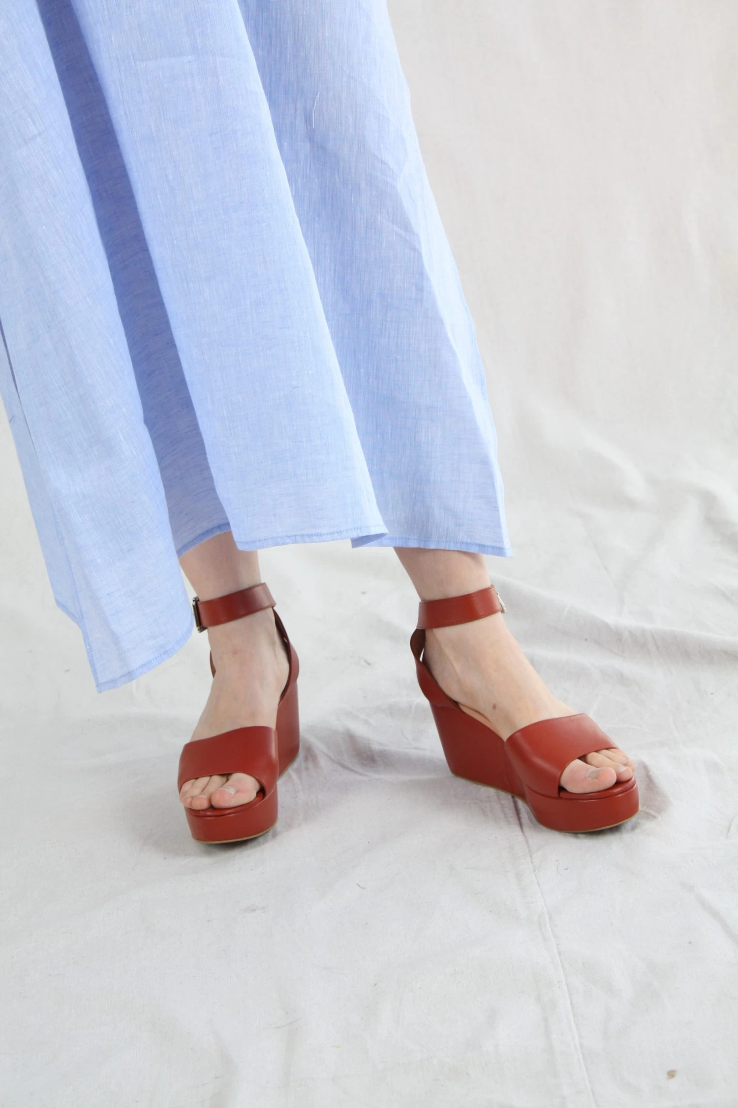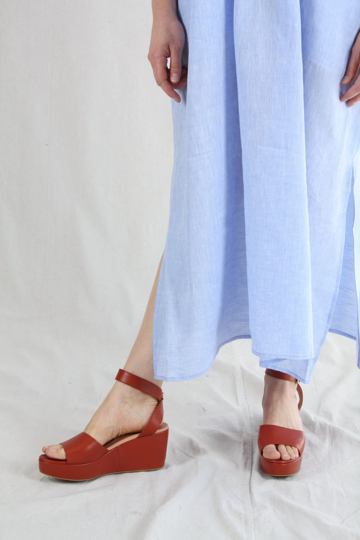 Open toe wedge with ankle strap. Wrapped leather platform. Tonal fabric insole. Wrap around ankle wrap with buckle closure. Lightly treaded rubber sole.