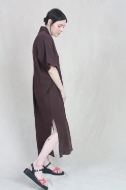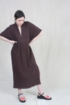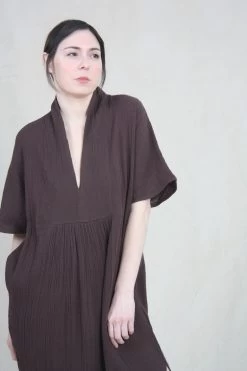 The Kia Shawl Collar Caftan features a v-neckline, gathered darts in front and back, and a clean finish hem.