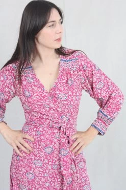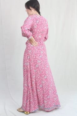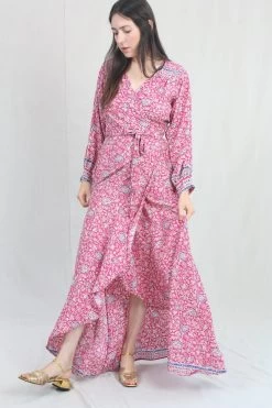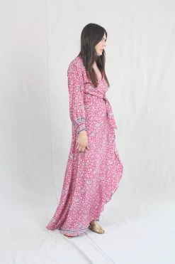 Crossover wrap bodice with wrap closure. Soft gathers at shoulder seams. Long sleeve maxi dress with asymmetric hemline and button closure at wrist.