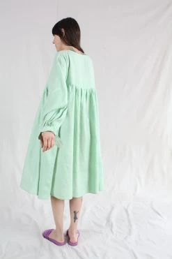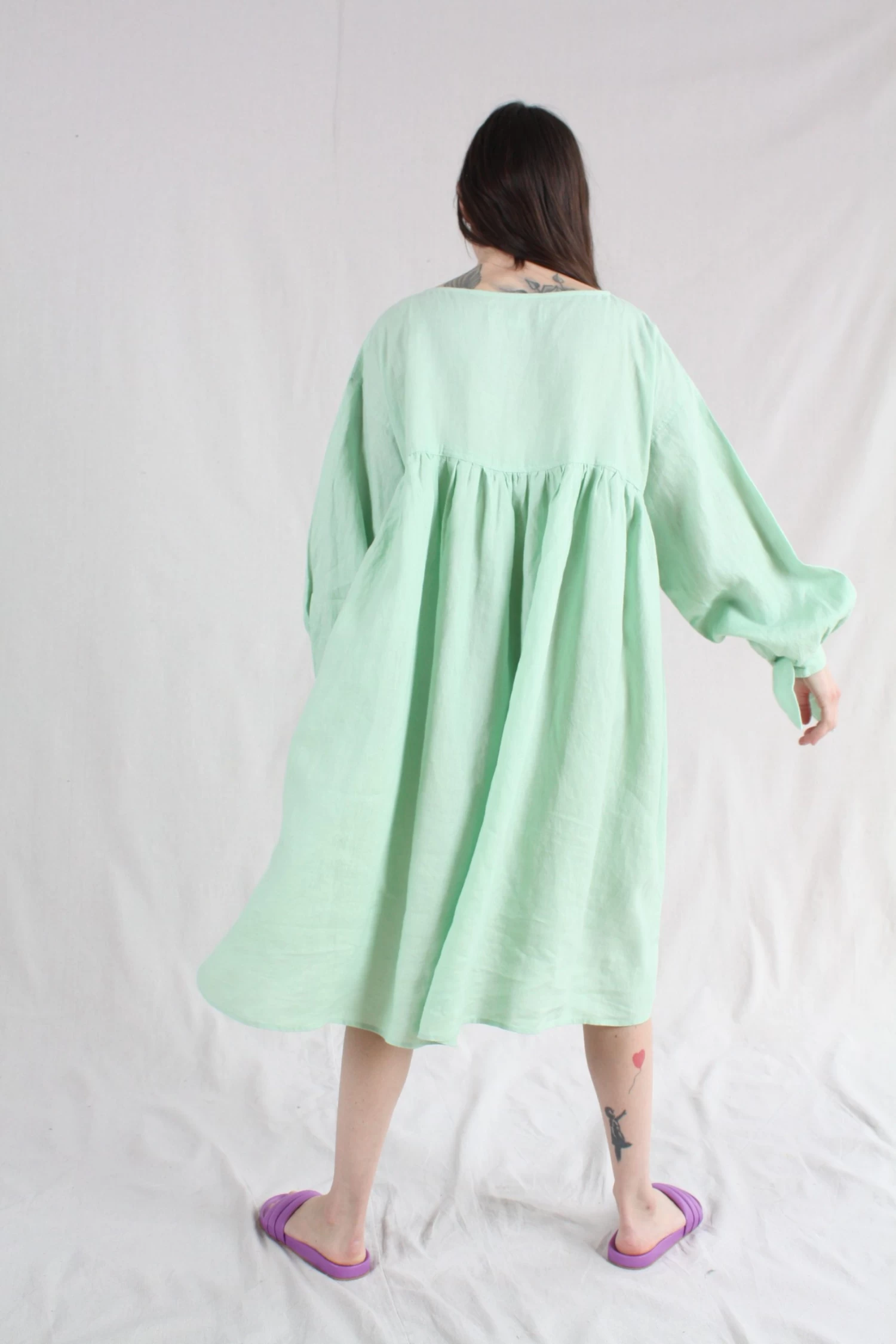 Oversized knee length dress with a wide cut and a round neckline. Gathered under the bust for a flattering fit. With dropped shoulders and lantern sleeves gathered at the cuff with a knot tie. Side pockets.