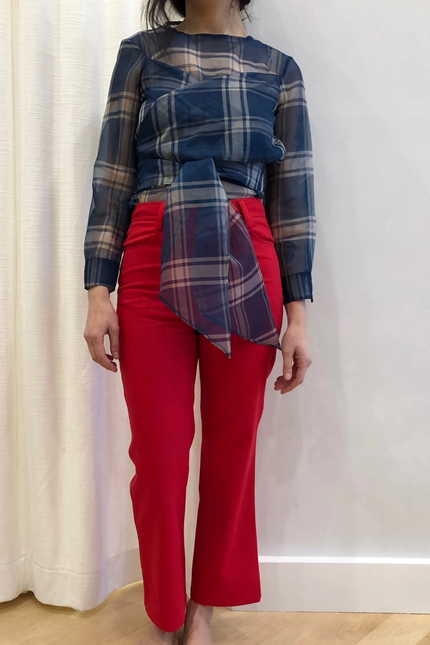 A versatile wrap top that will add the necessary flair to any straight or wide-leg pant. Round neck with back button closure. Cropped sleeves. Cut in a sheer blue/white plaid organza.