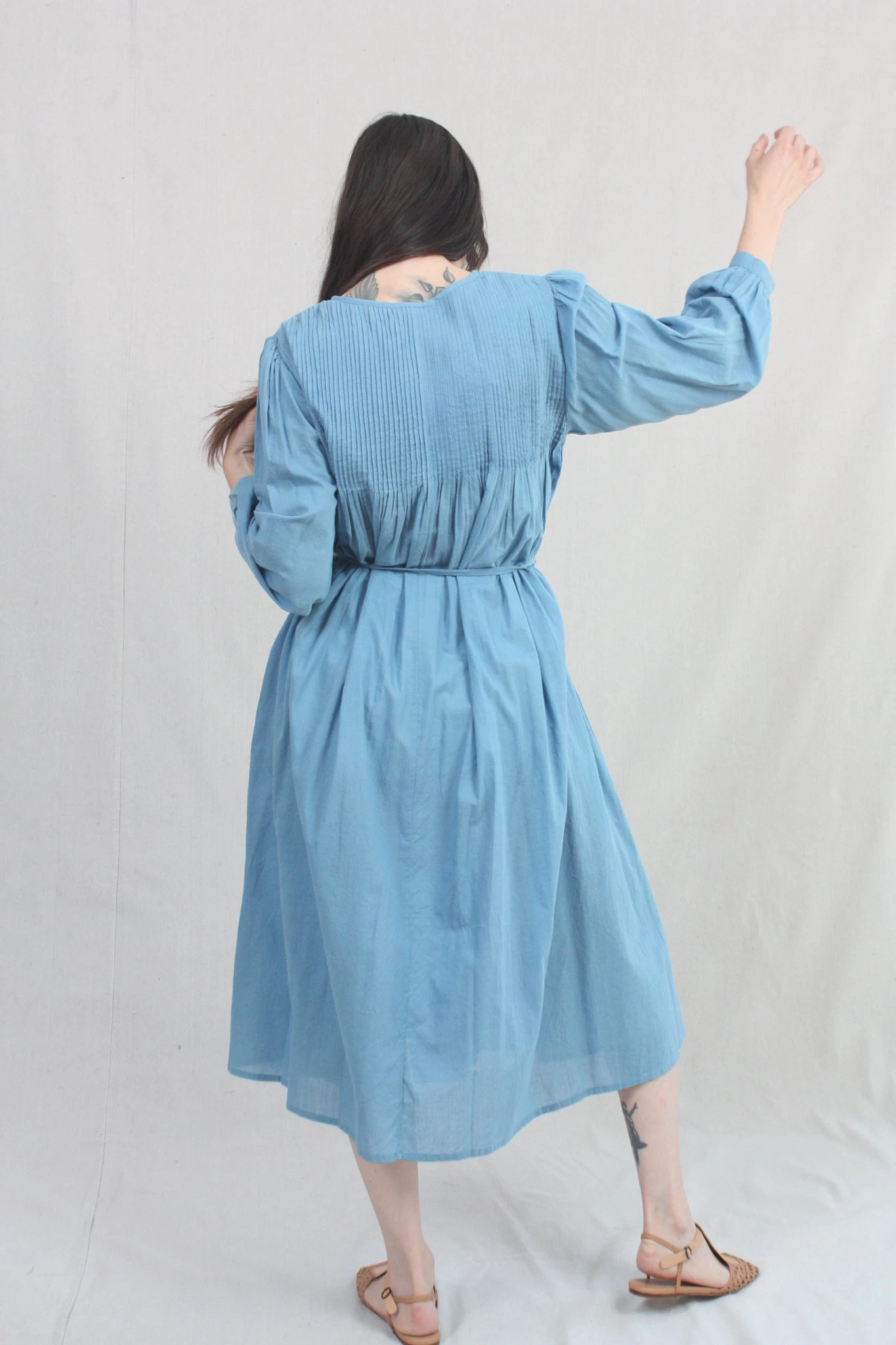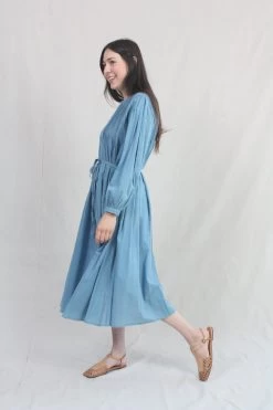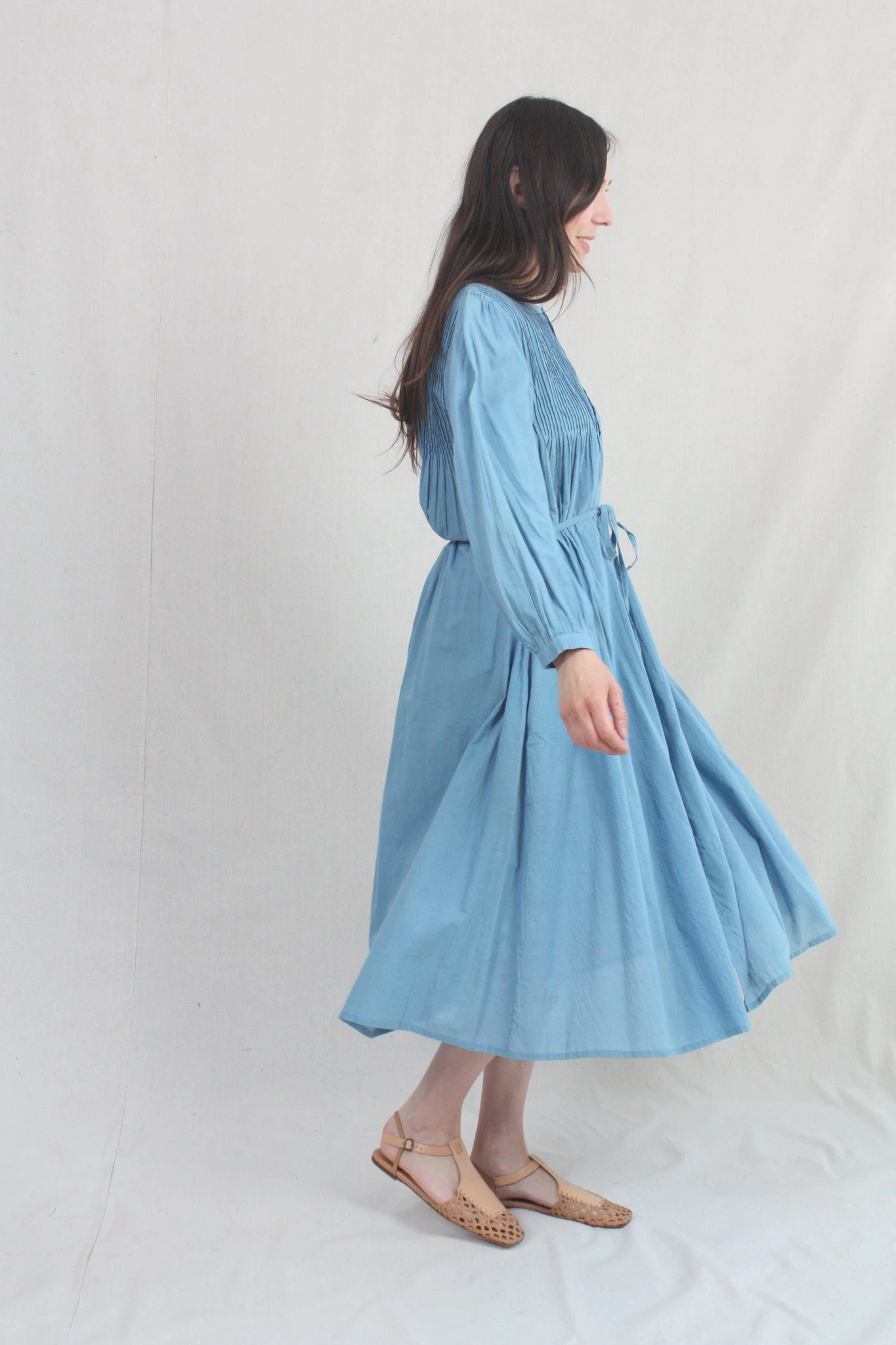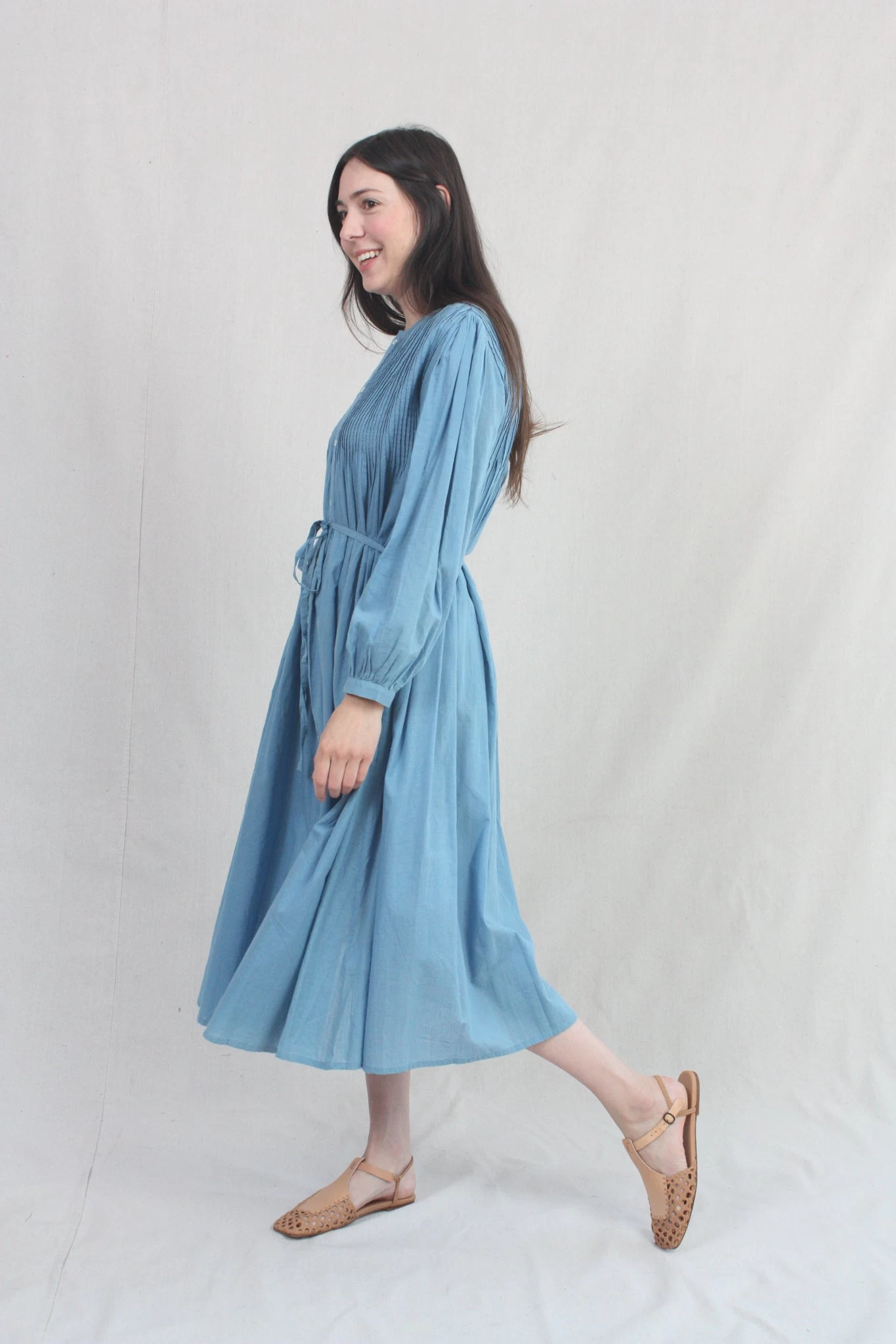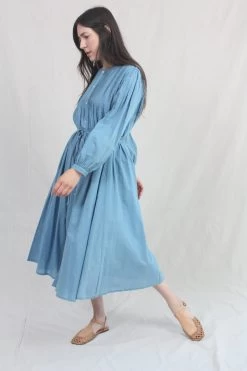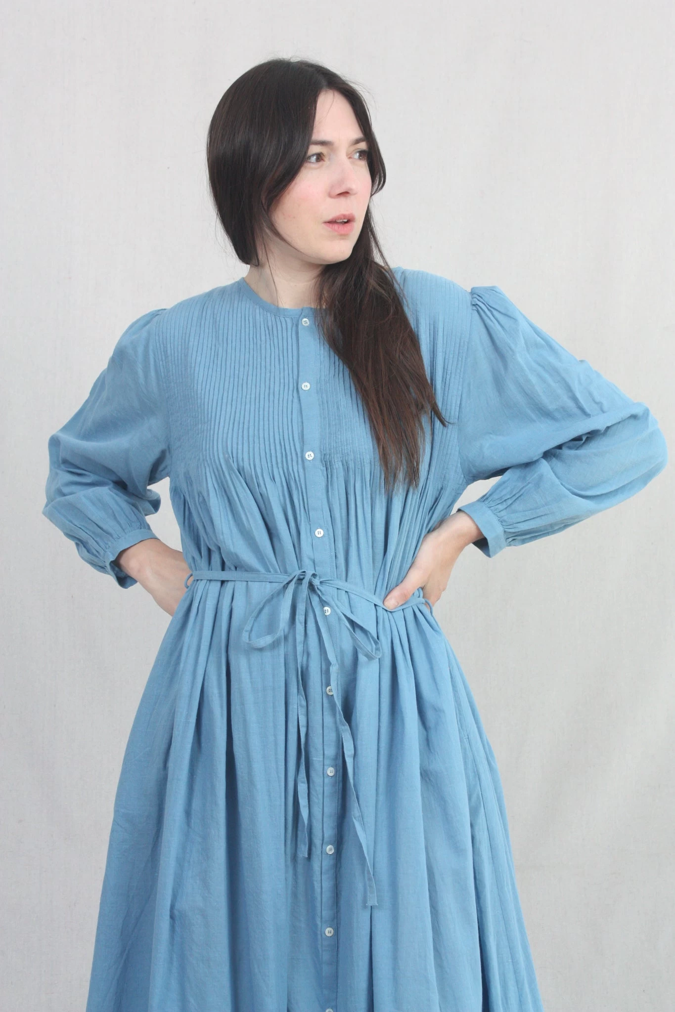 A pintuck dress in featherweight plant-dyed khadi woven cotton. Features button placket at front, side seam pockets, and full sleeve with single button cuff. Optional self-tie at waist.