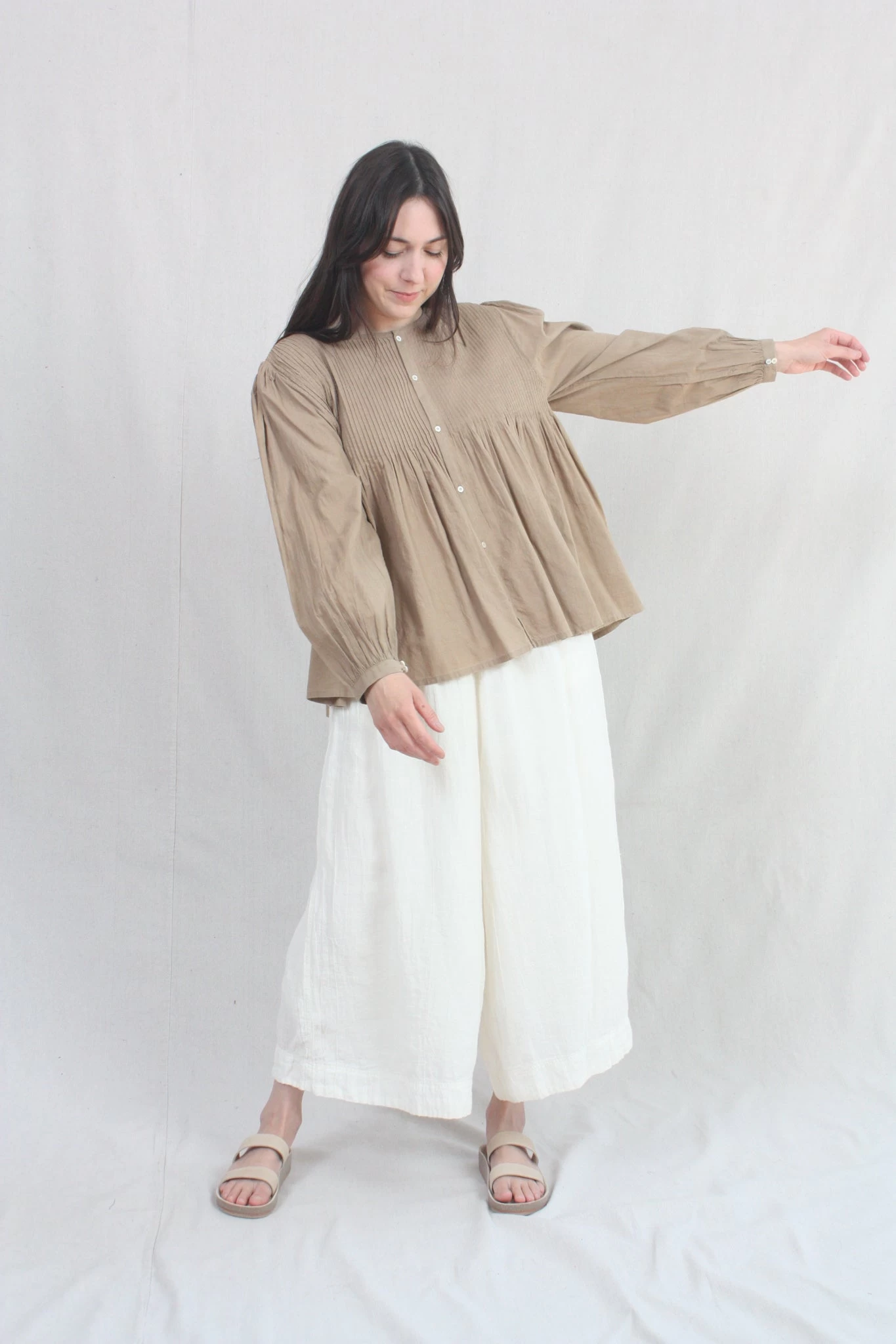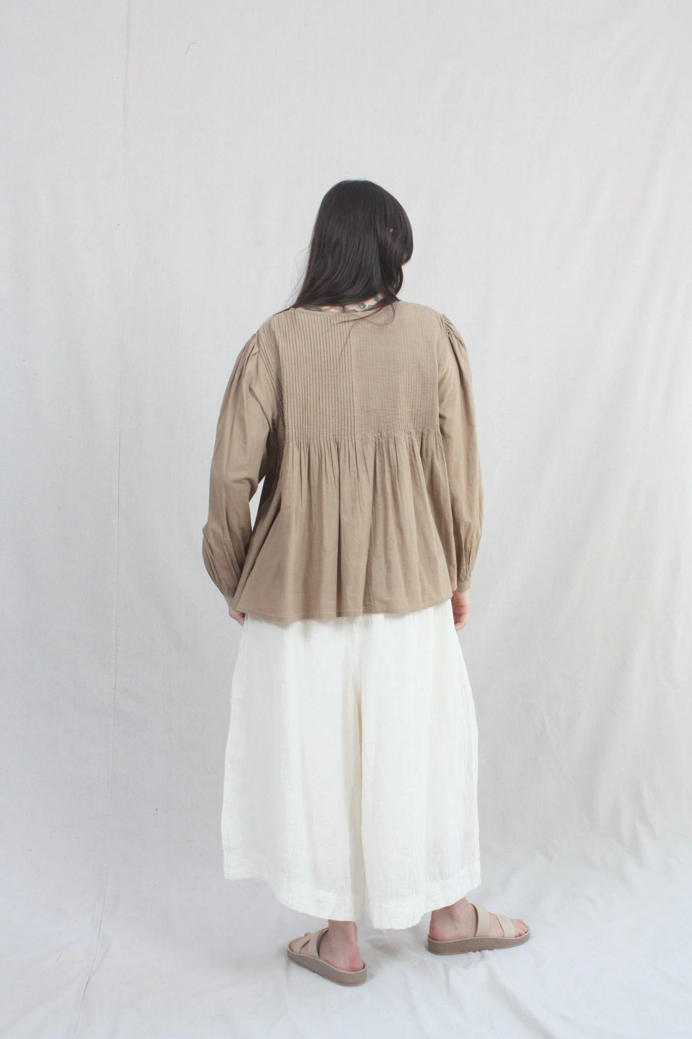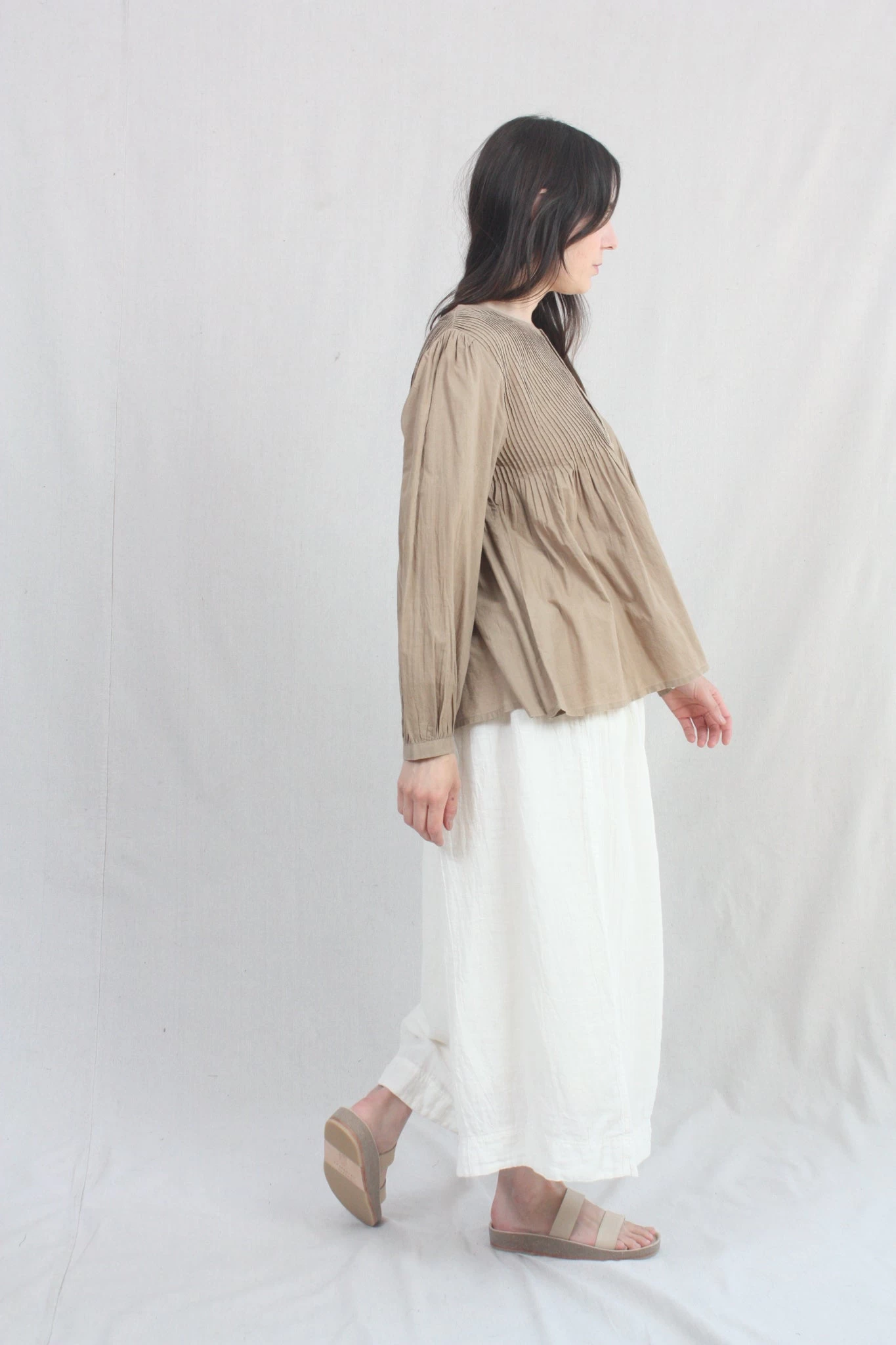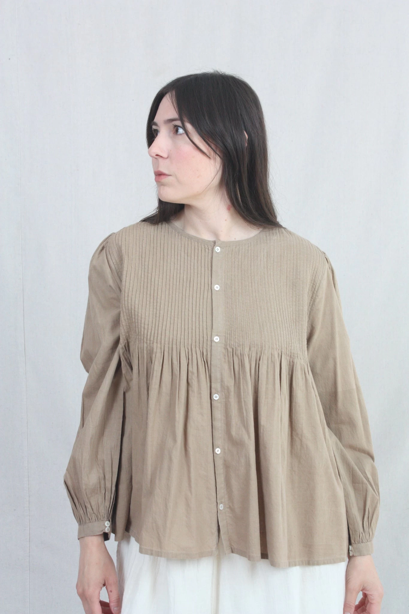 Cotton Khadi shirt hand dyed with plant matter. Pin-tuck detail and mother of pearl buttons.