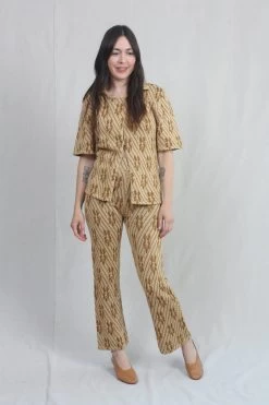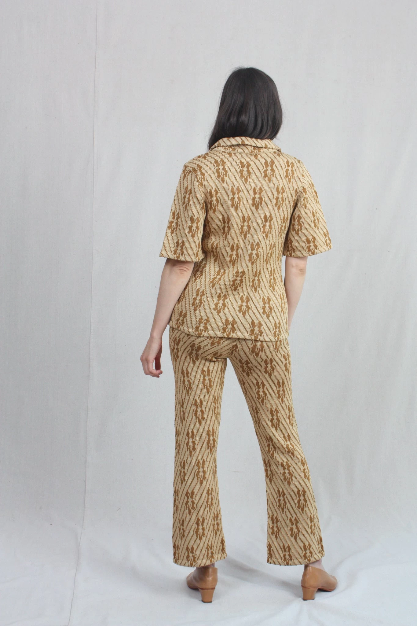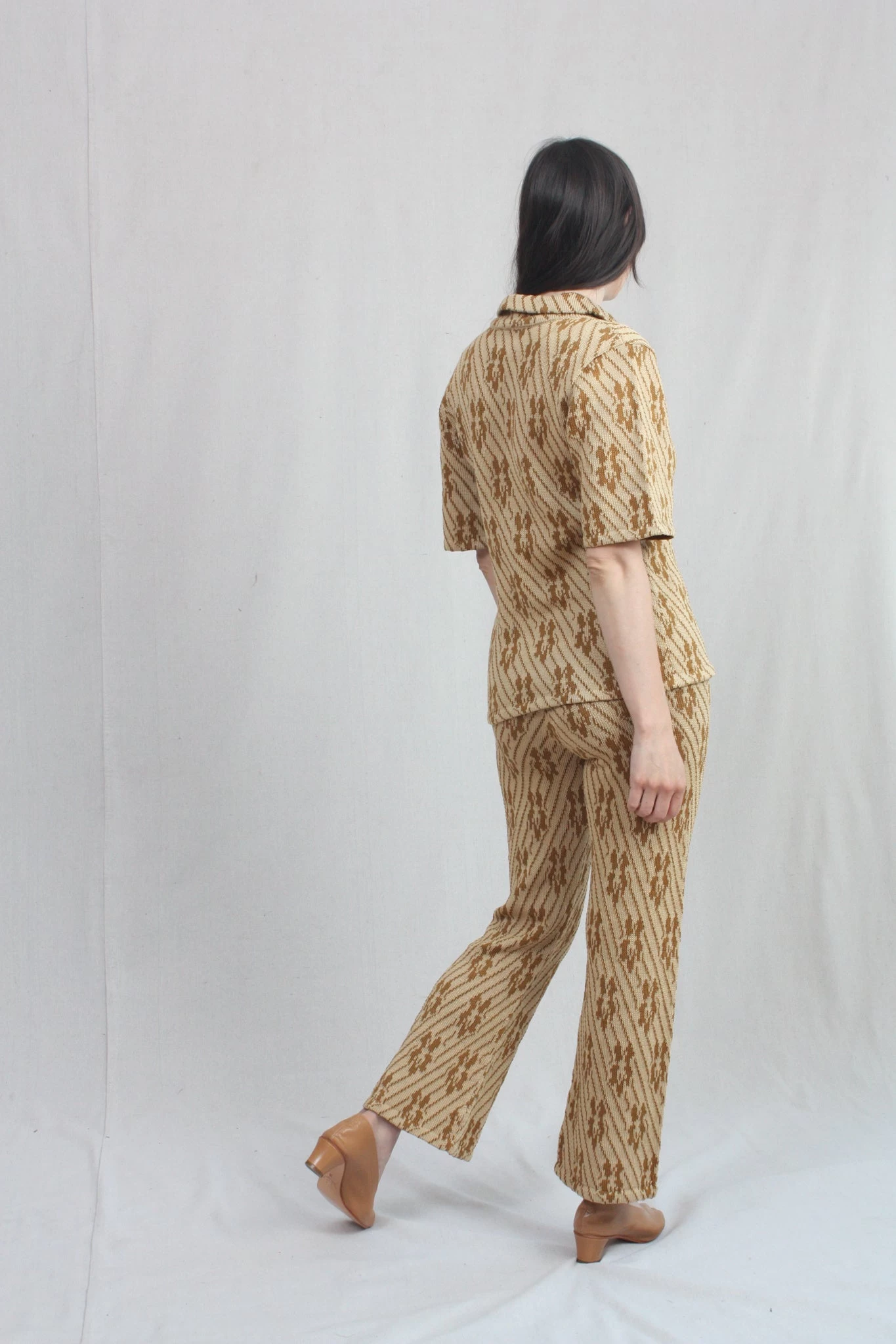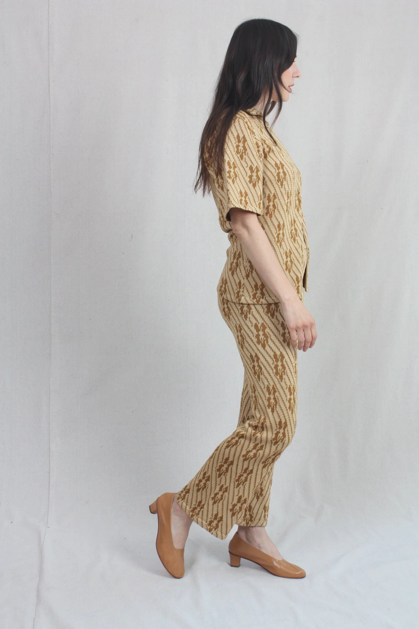 Knit top with a open front and collar in caramel floral. Hook and eye closures.