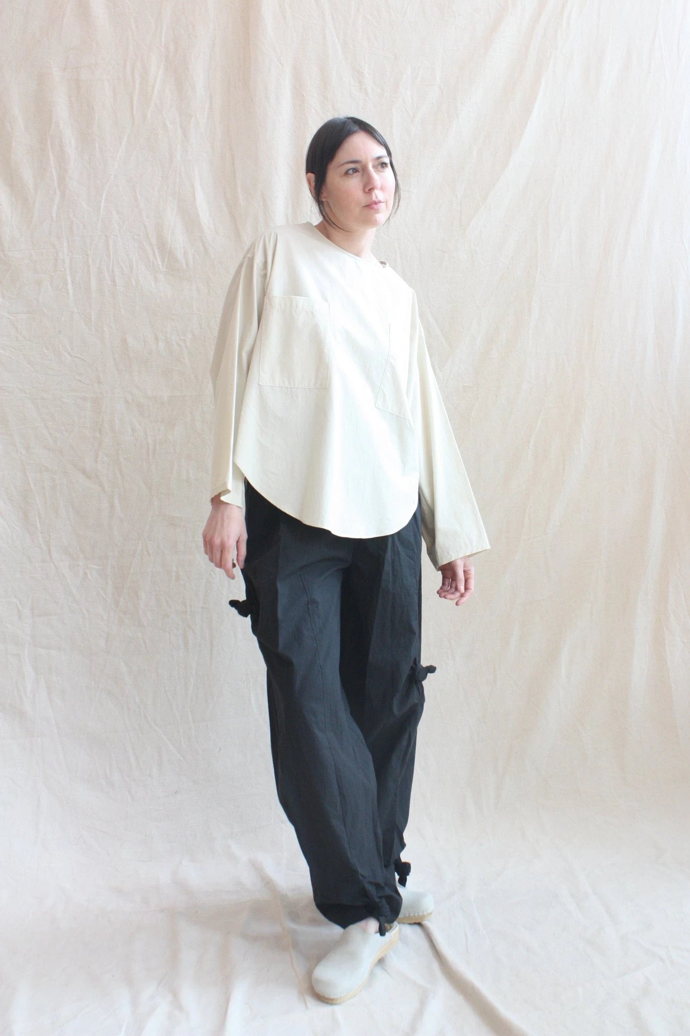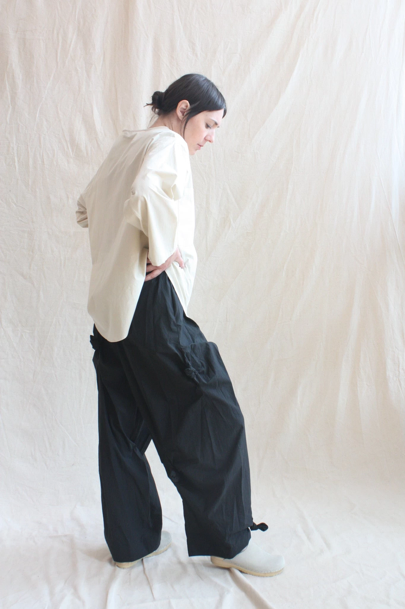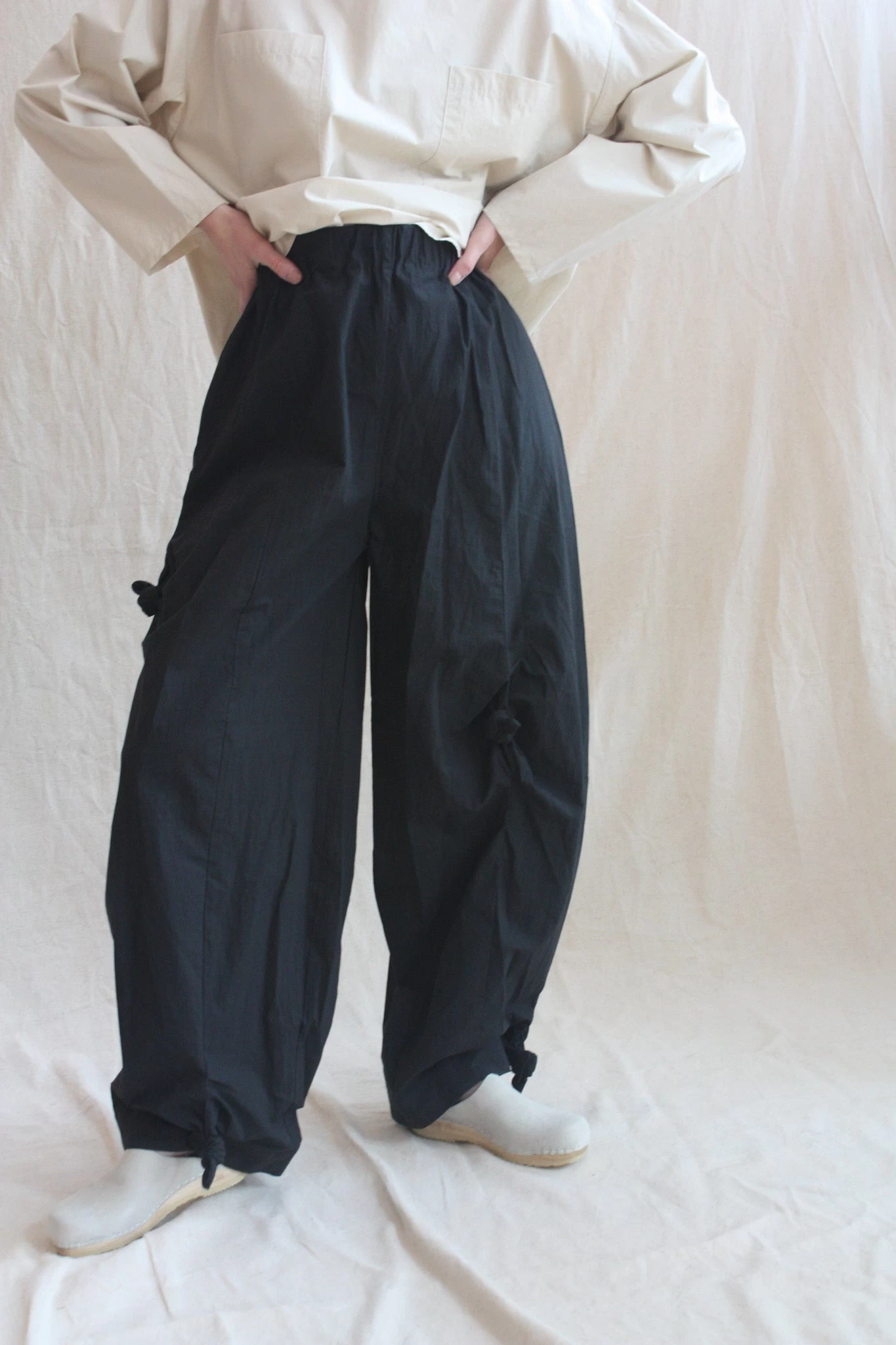 Abstract knot detail that allows adjustable styling. Crisp light fabric weight. Side seam pockets and elastic waist.