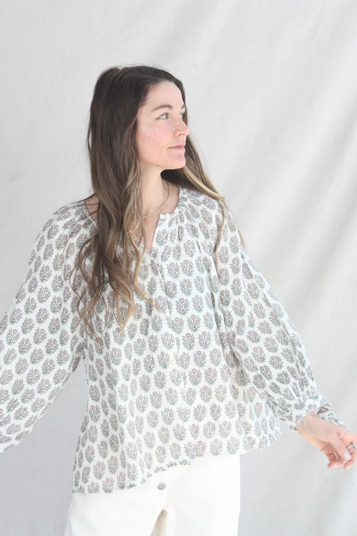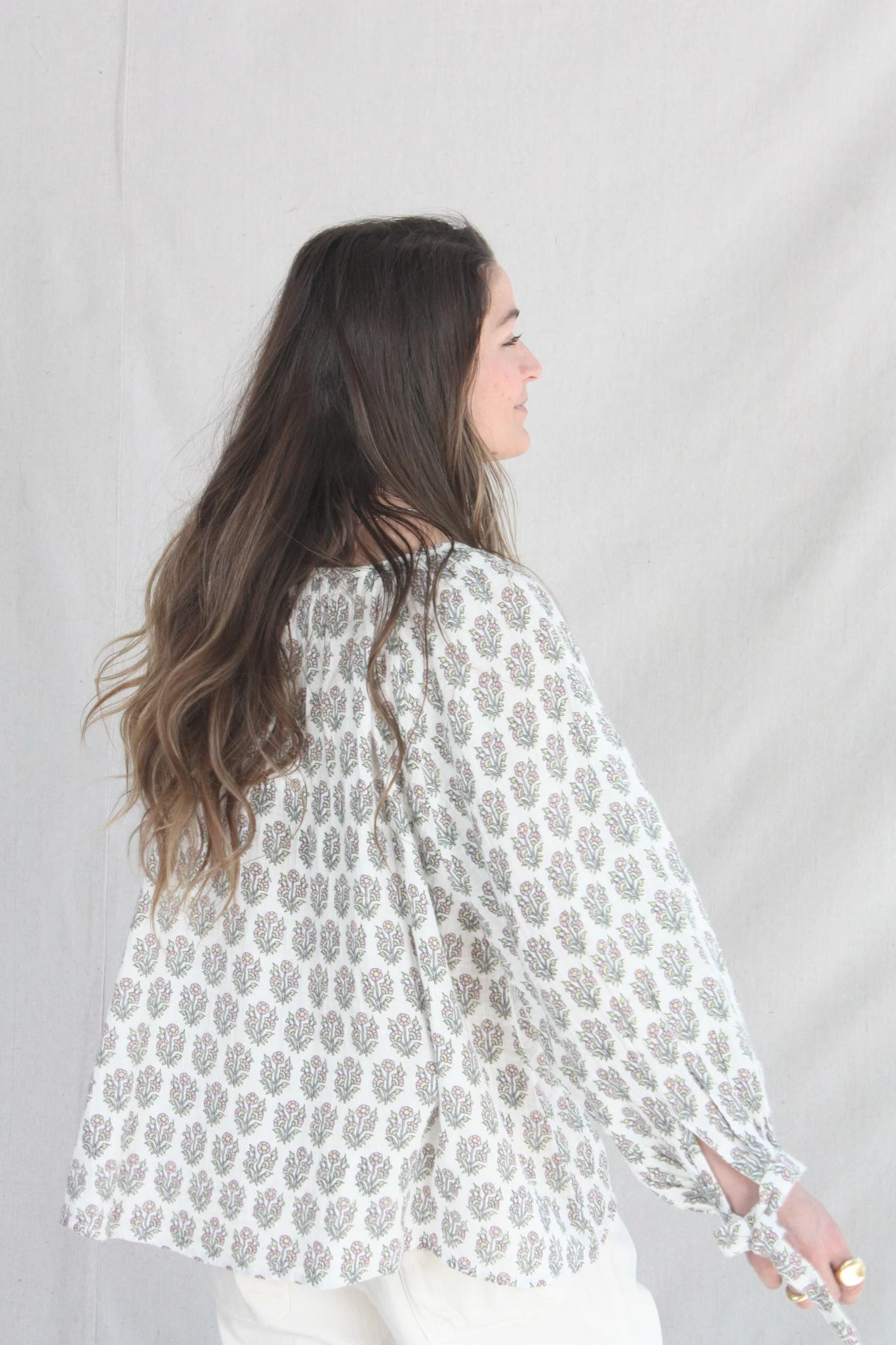 The Laila Blockprint Button Down Blouse is tailored in a soft natural double cloth cotton. This relaxed fitting blouse features a curved neck band, gathers, raglan long-sleeves with self tie cuffs and clean finish hem detail.