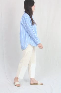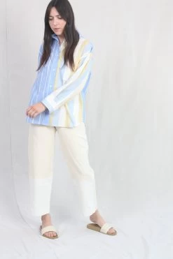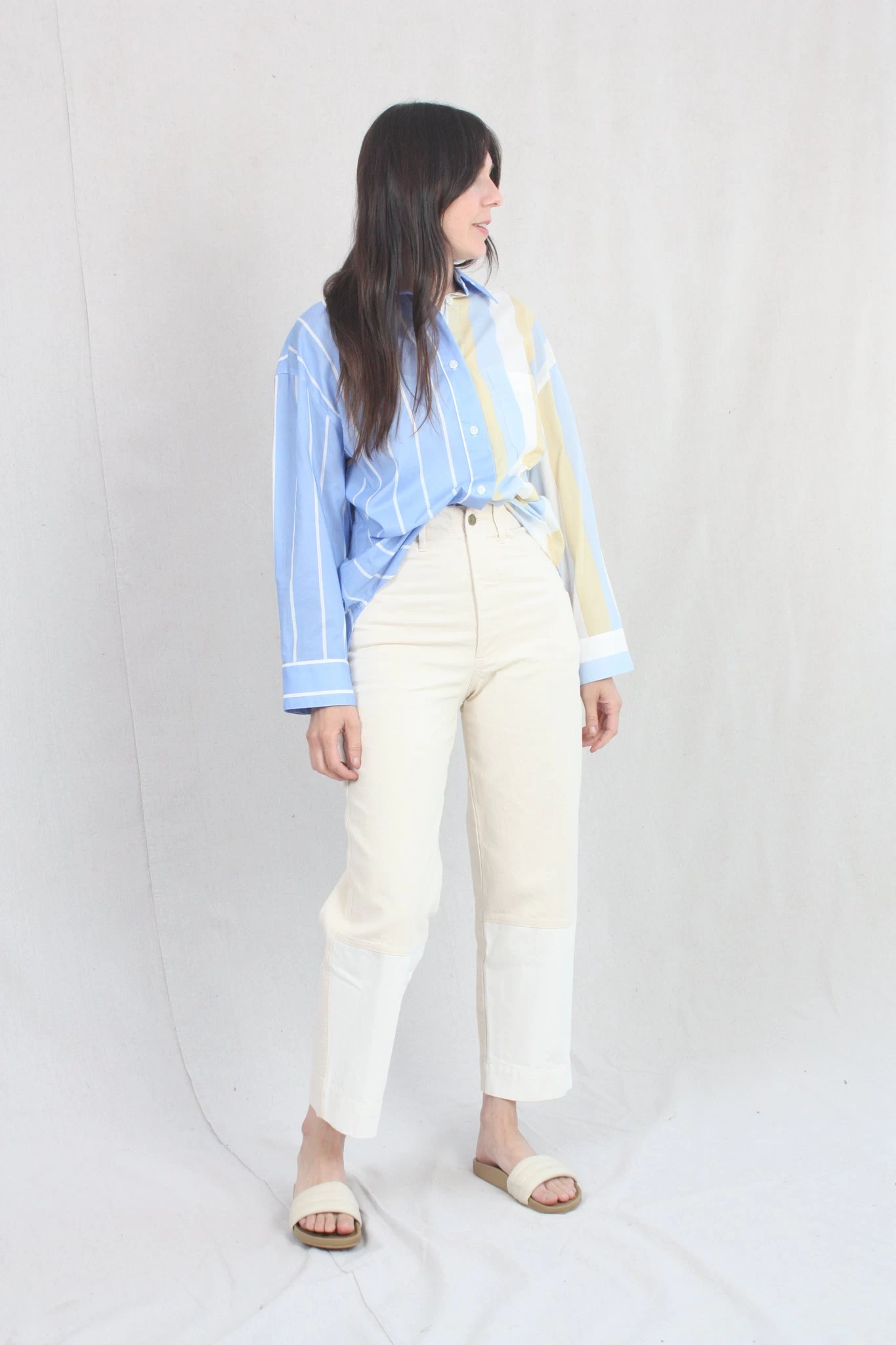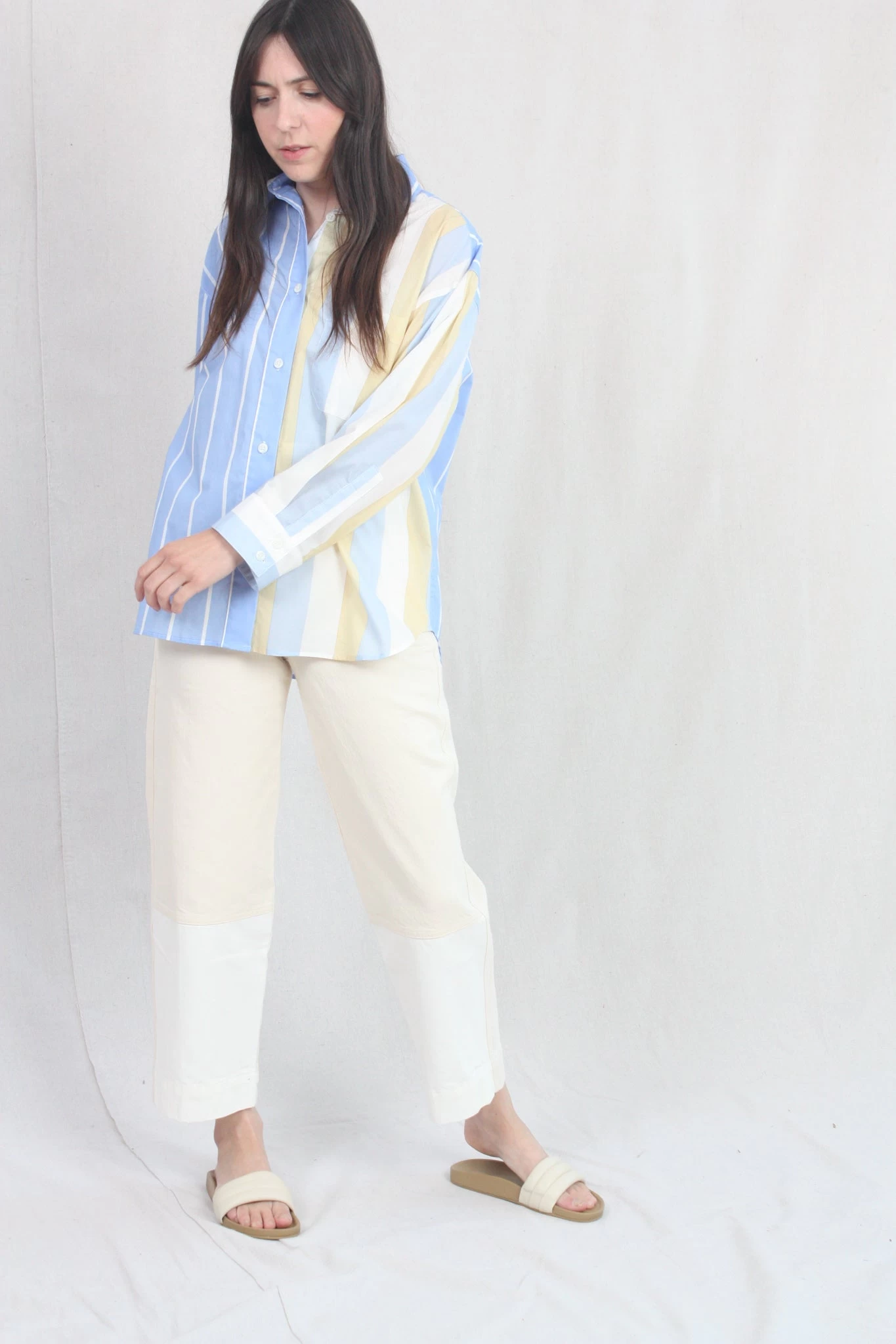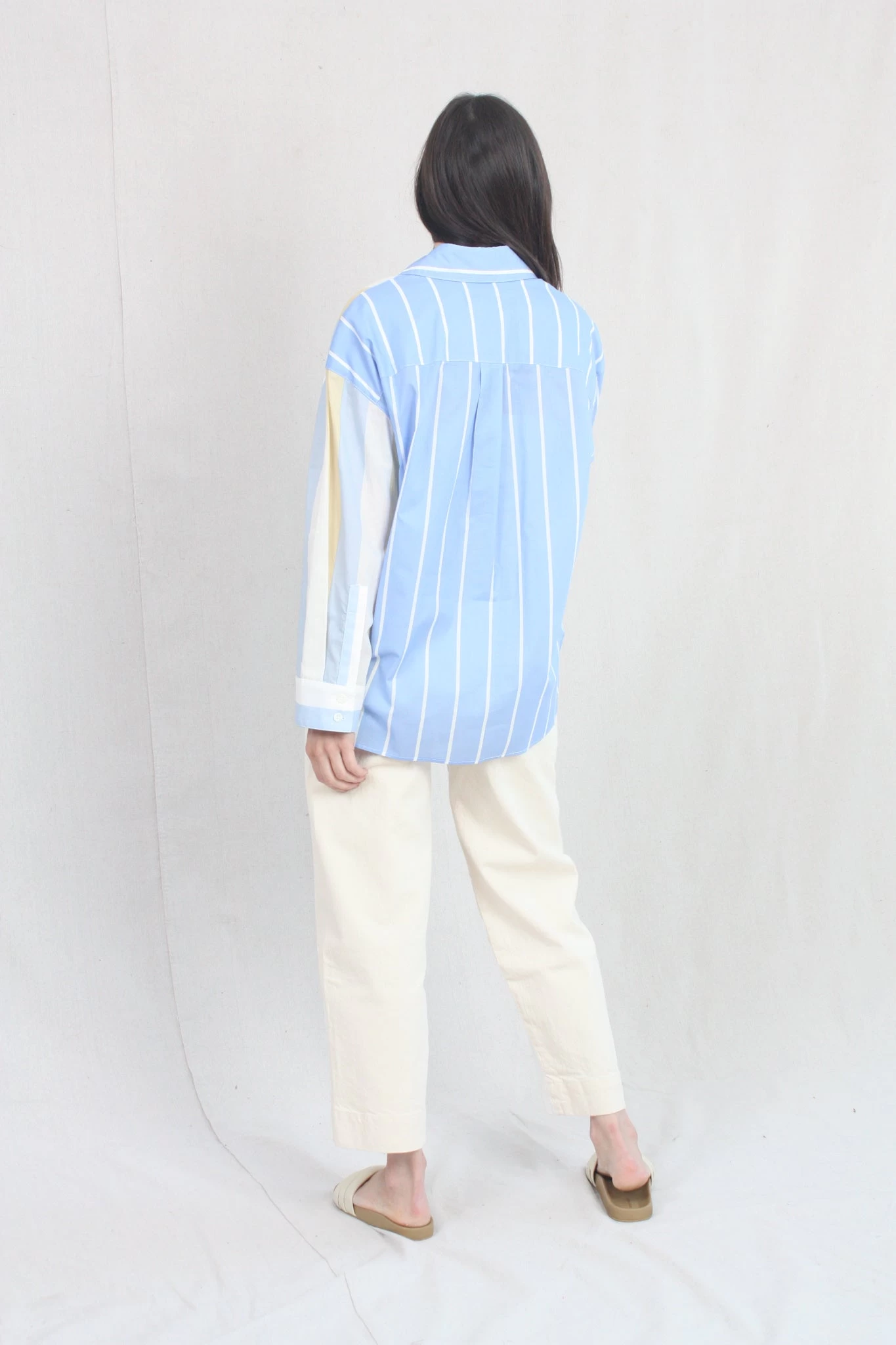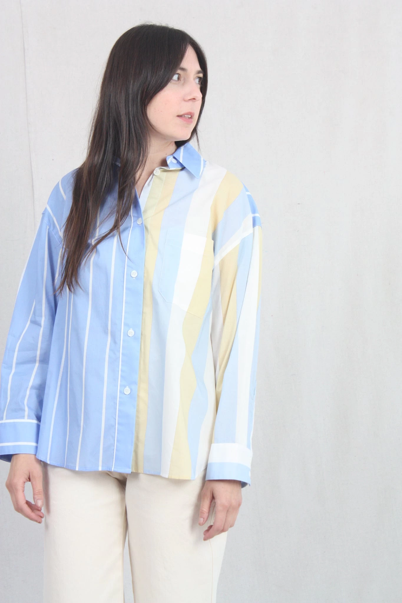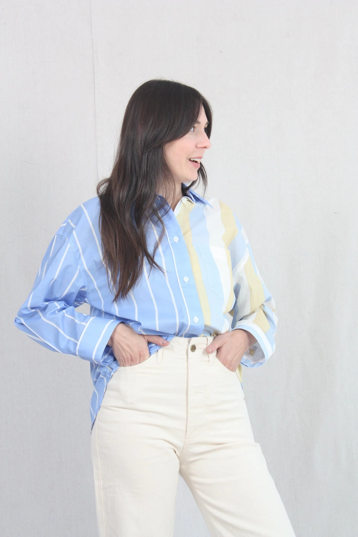 Classic collared button down shirt in crisp striped cotton. Easy to style. Looks great tucked or open as a duster.Â