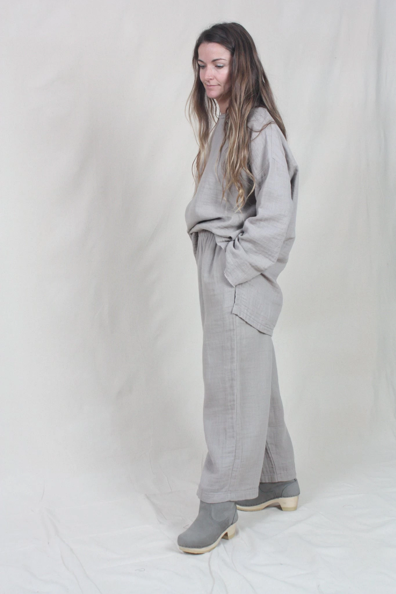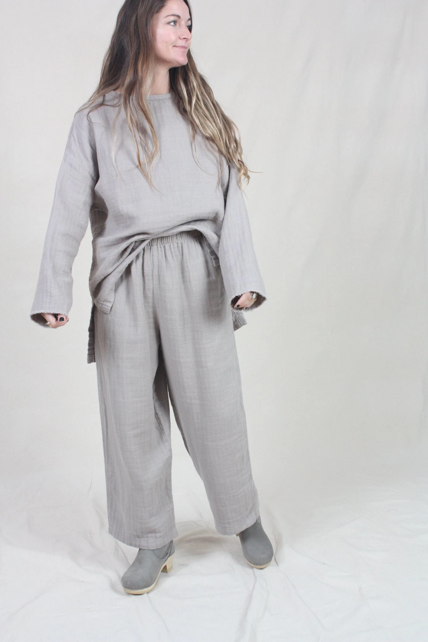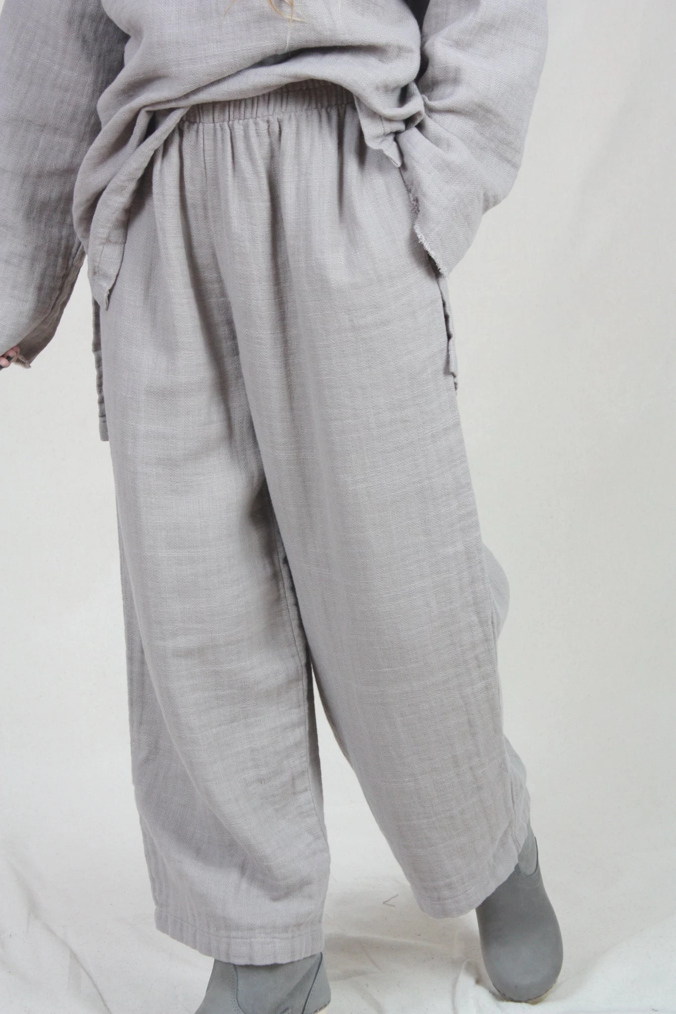 A relaxed pants with an elasticized waistband in textured cotton, linen. Wide leg, drop crotch. Side slip pockets.