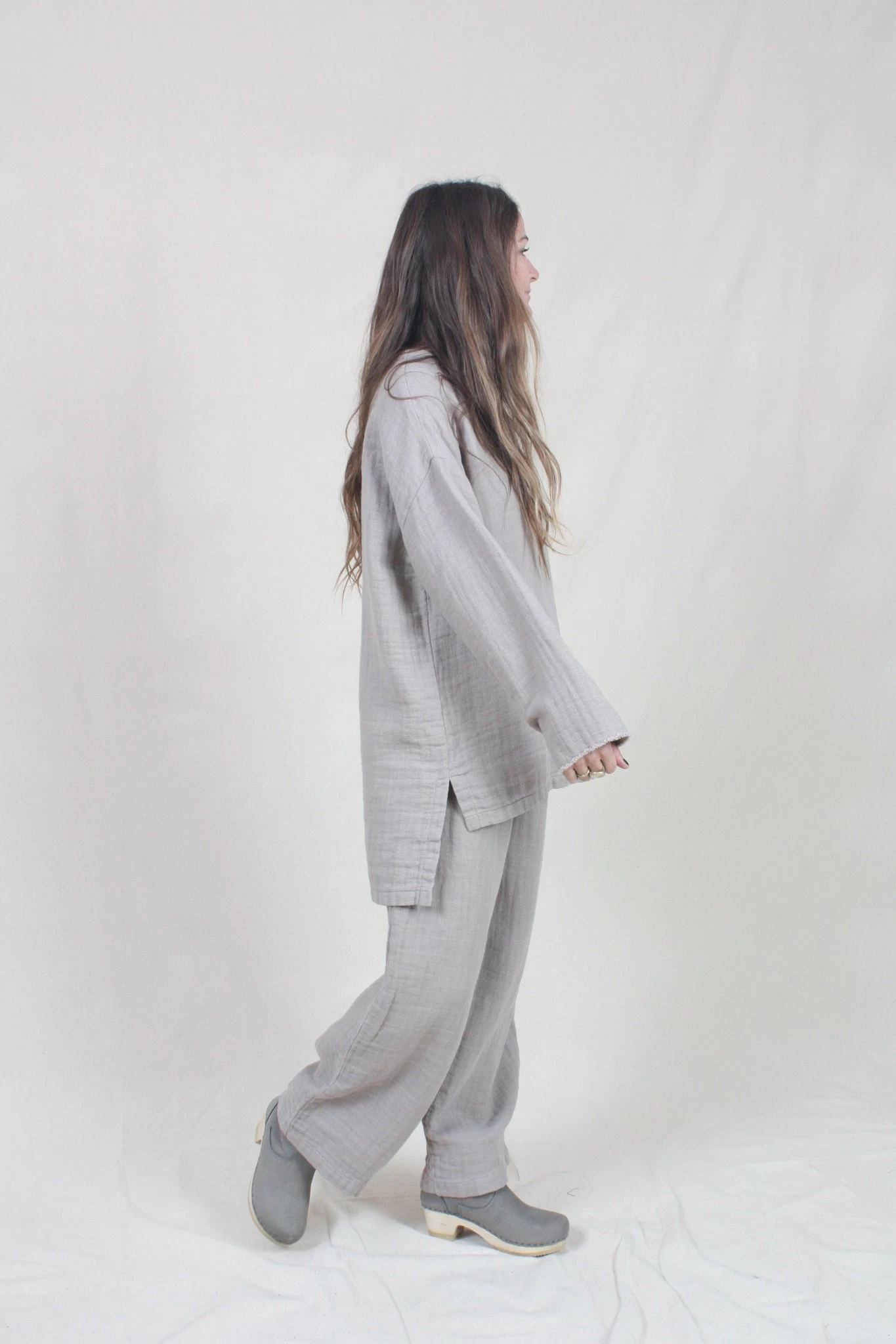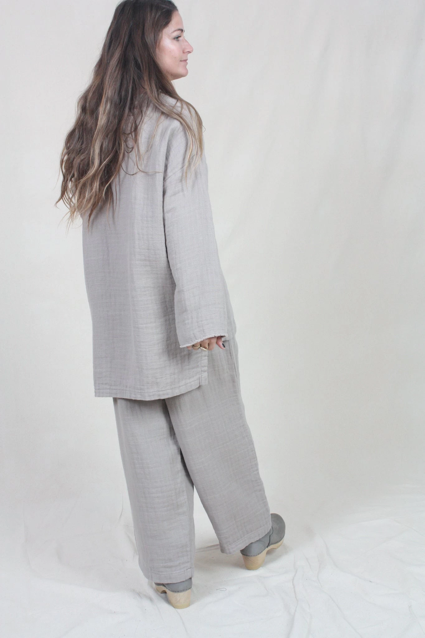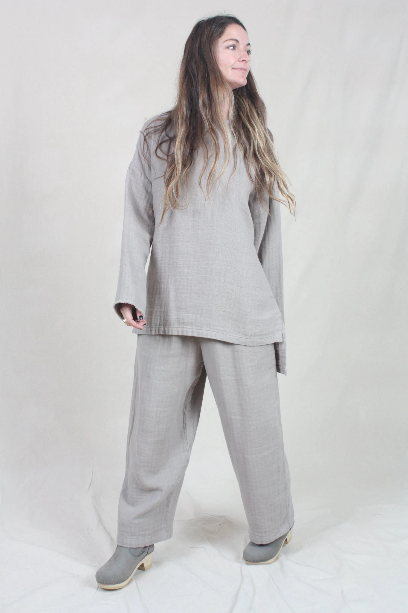 A relaxed pants with an elasticized waistband in textured cotton, linen. Wide leg, drop crotch. Side slip pockets.