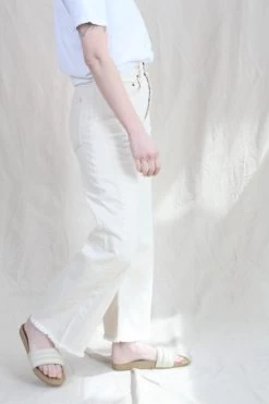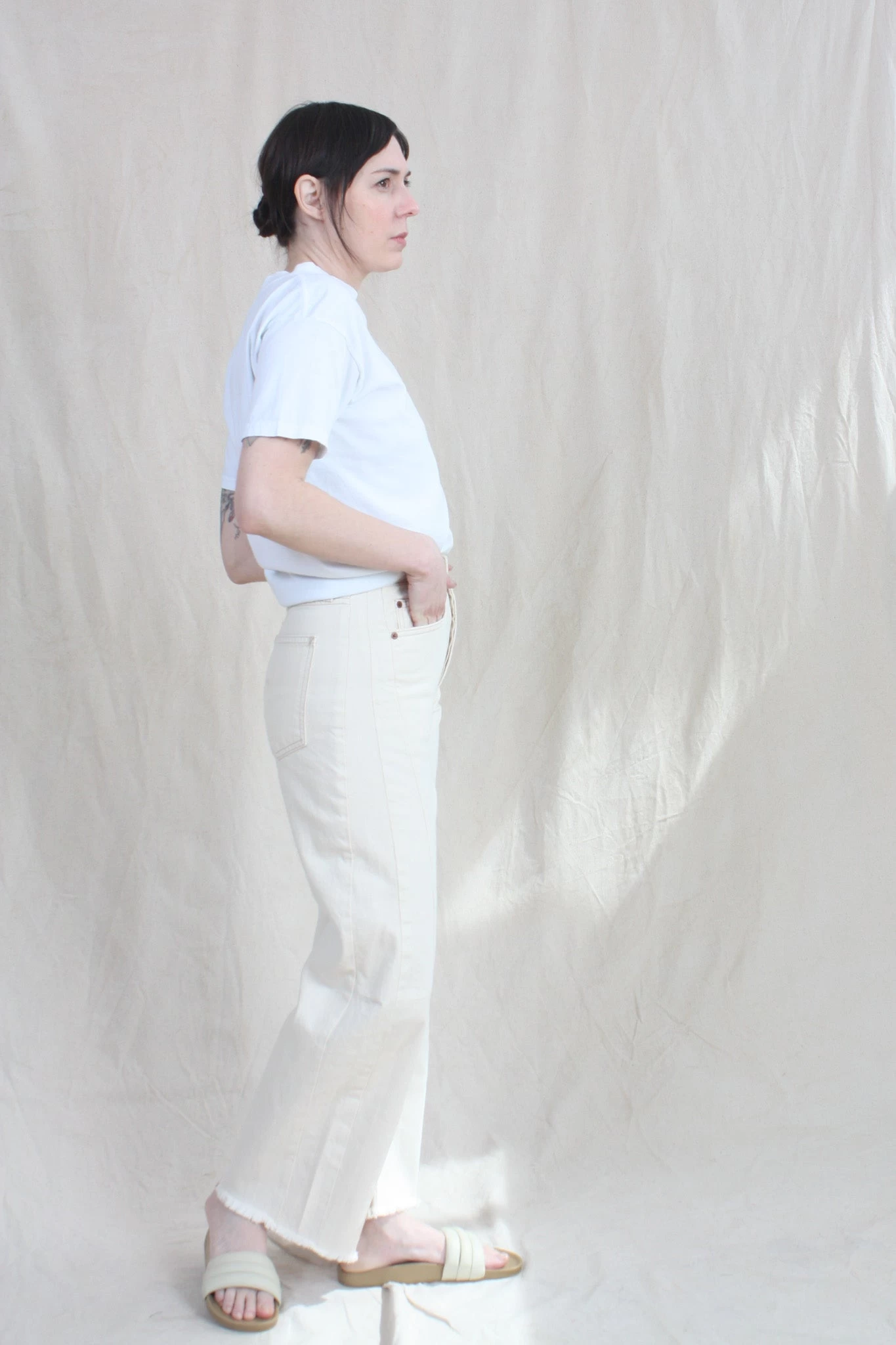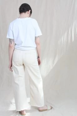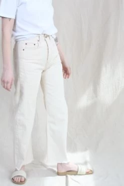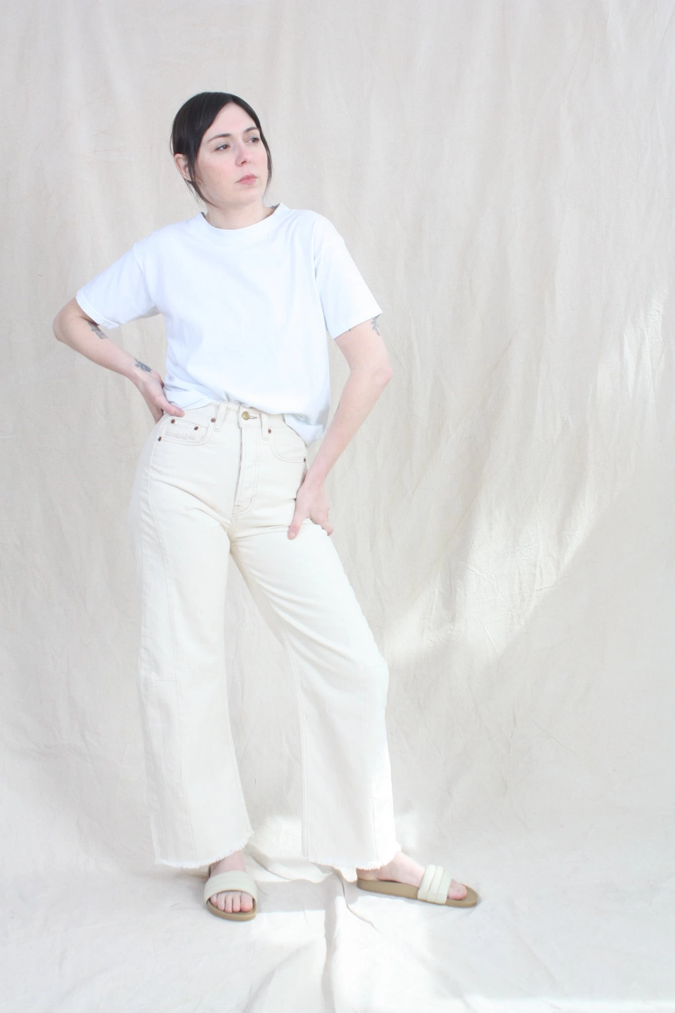 The popular Lasso Jean is cut from light weight natural-state sailcloth denim, rinsed and sun baked for a crisp broken-in look. Designed to sit at the natural waist with a pieced outseam, kinked leg shape and frayed hem. Tan top stitch details accentuate.