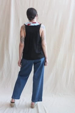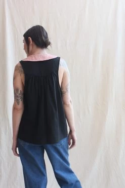 The Lauren Sleeveless Shirt features a one-of-a-kind Chelsea collar pieced from vintage quilts on a light black linen shirt. Super versatile and made with 100% linen and cotton vintage quilts. Looks great on its own or layered over a long sleeve shirt, ideal for all seasons.