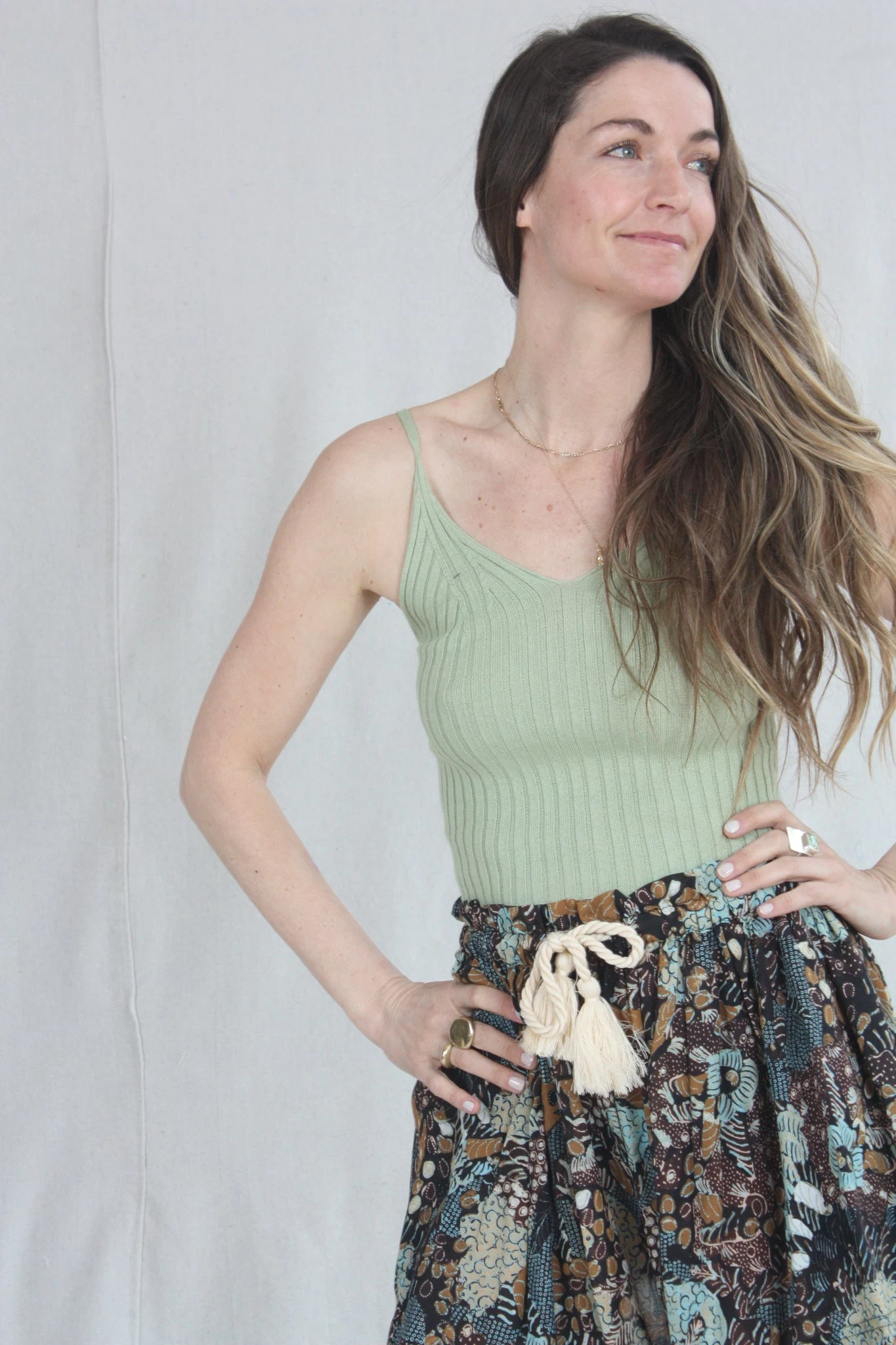 Ribbed tank with fully fashioned fine gauge knitting and slim fit. A perfect choice for layering and cropped to natural waist.