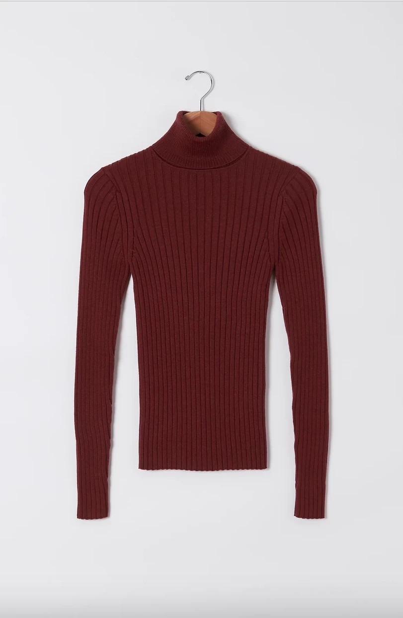 Merino wool ribbed turtleneck is perfect on its own or layered. Slim fitting.