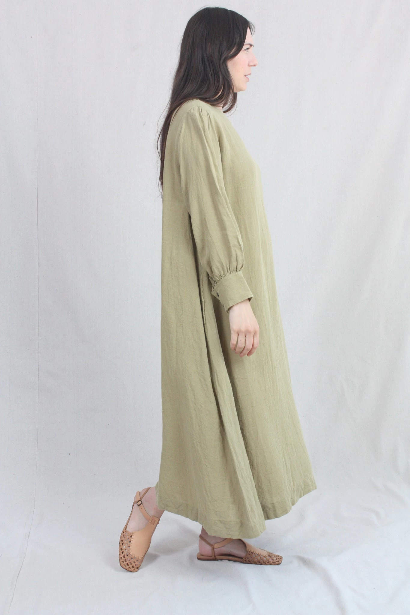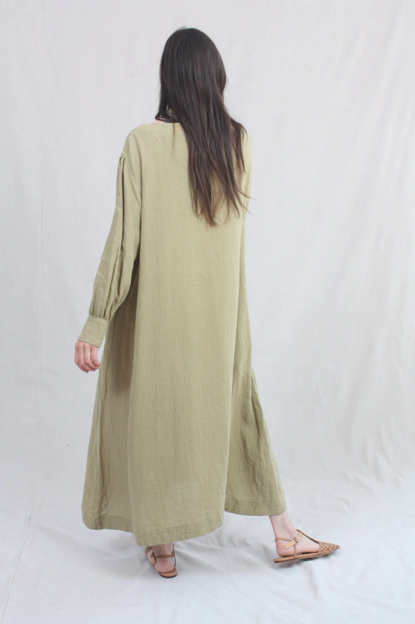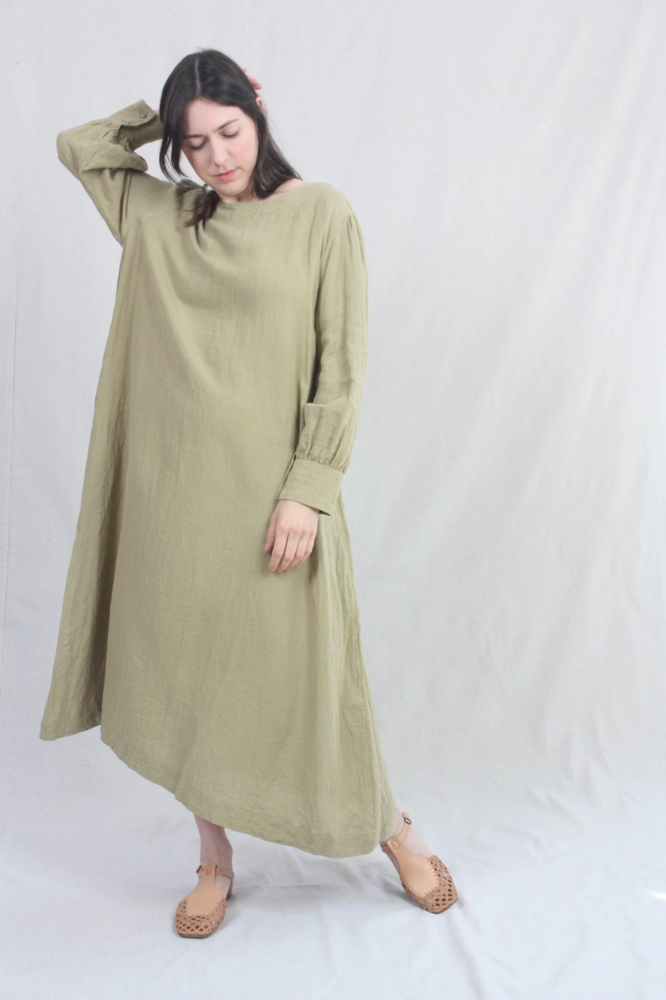 Loose sheath dress in a mid weight linen. Boatneck, dropped, gathered shoulder and gathering at the cuff. Buttons at cuff and side seam pockets.