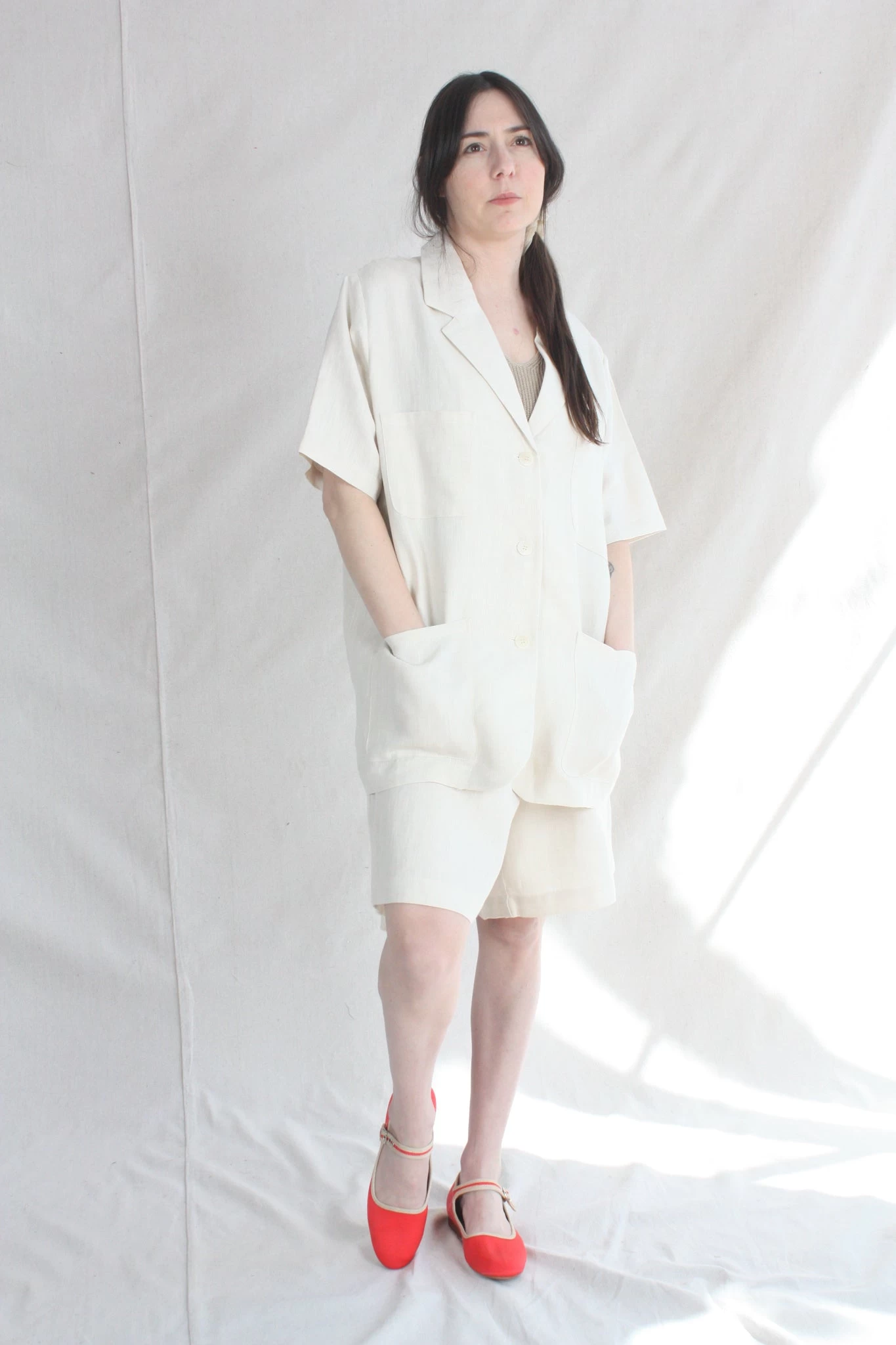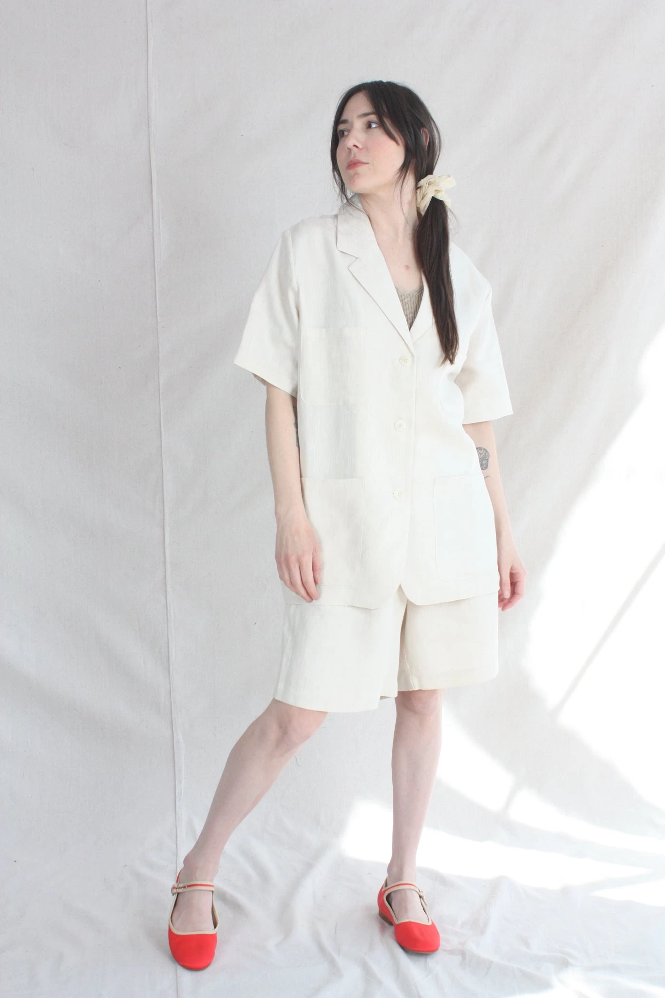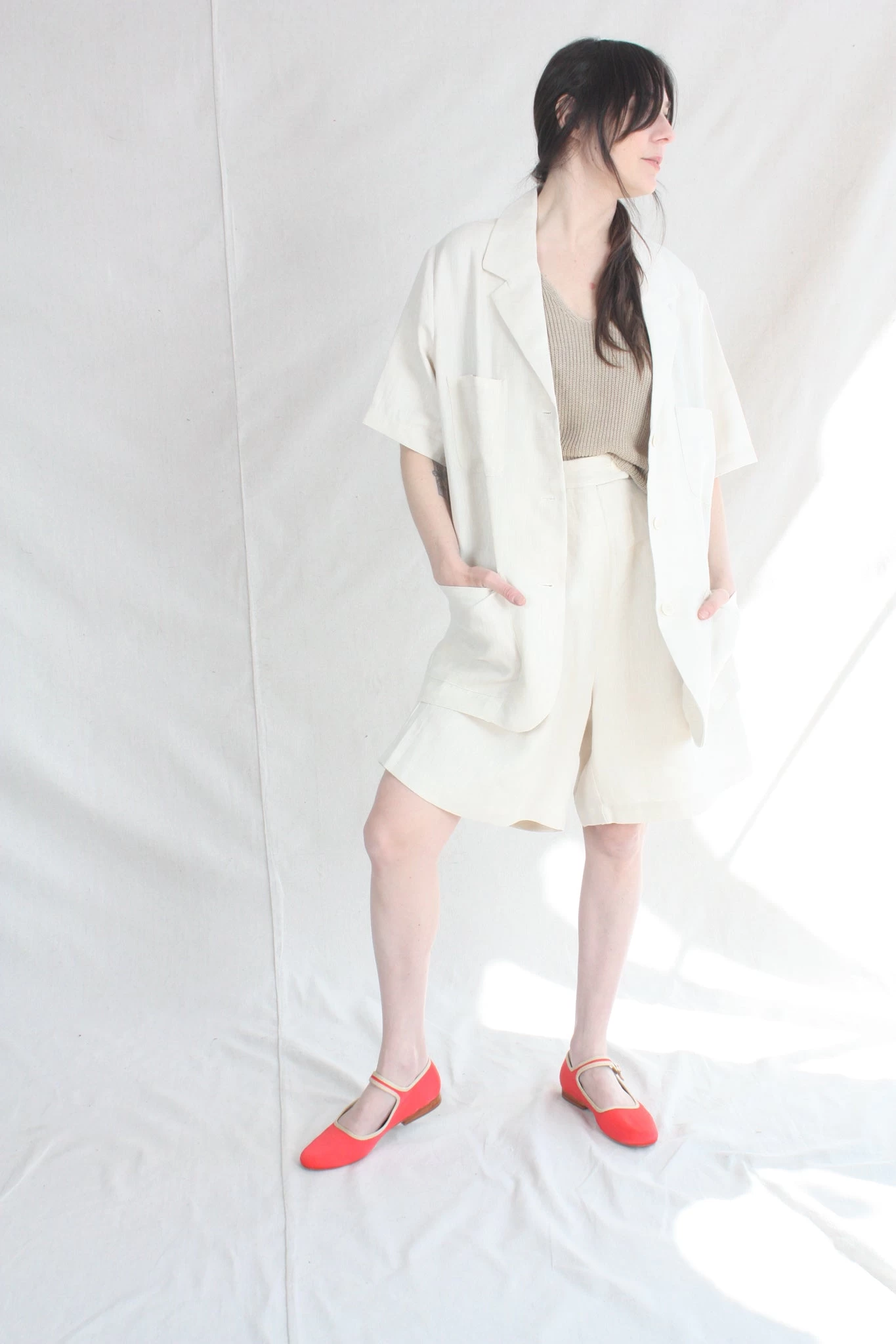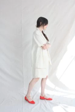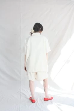 Timeless yet modern, blazer top in a light and airy linen perfect on its own or pair with the Linen Bermuda Short. Loose fit for easy wearing. Blazer collar, button front, three front pockets and short sleeves. This shirt is ethically and carefully manufactured in La Coruña (Spain), crafted from high quality fabric and dyed locally with the latest technology and sustainable methods.