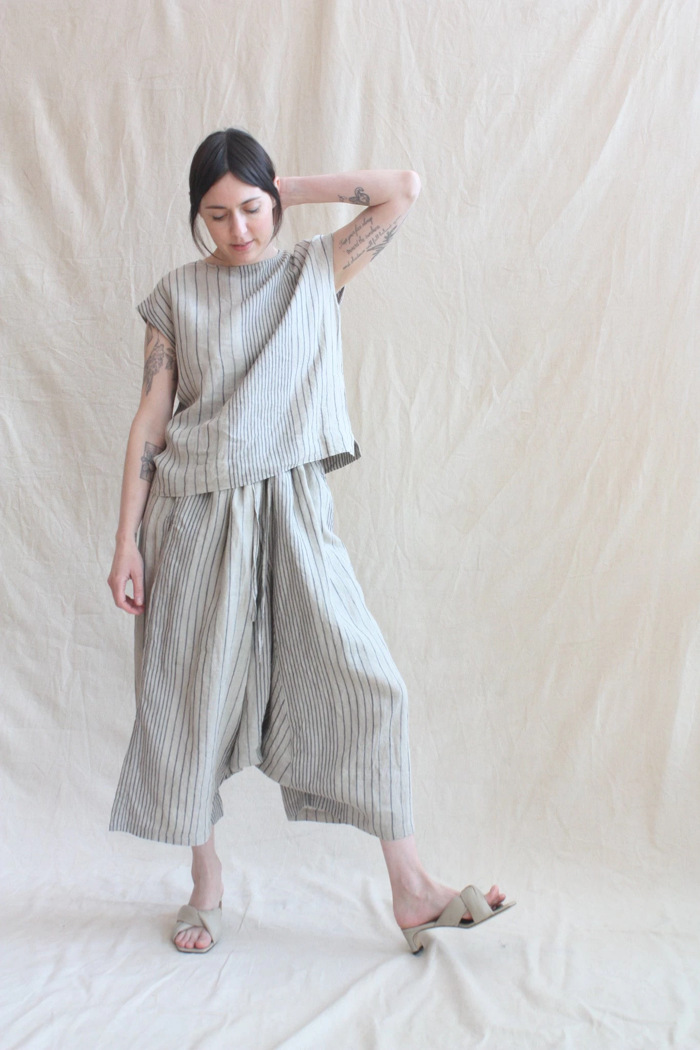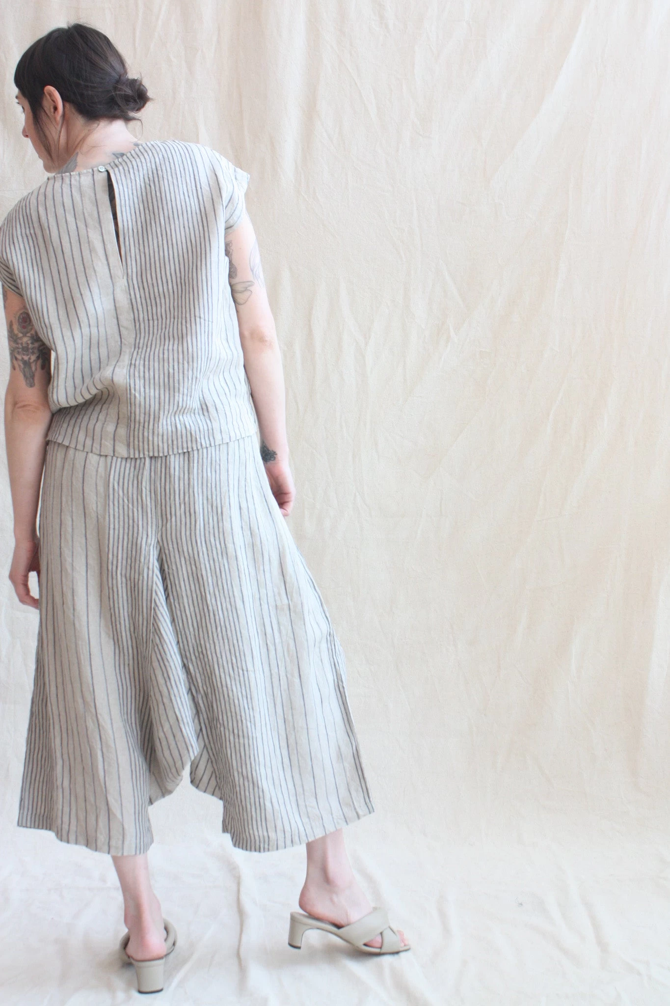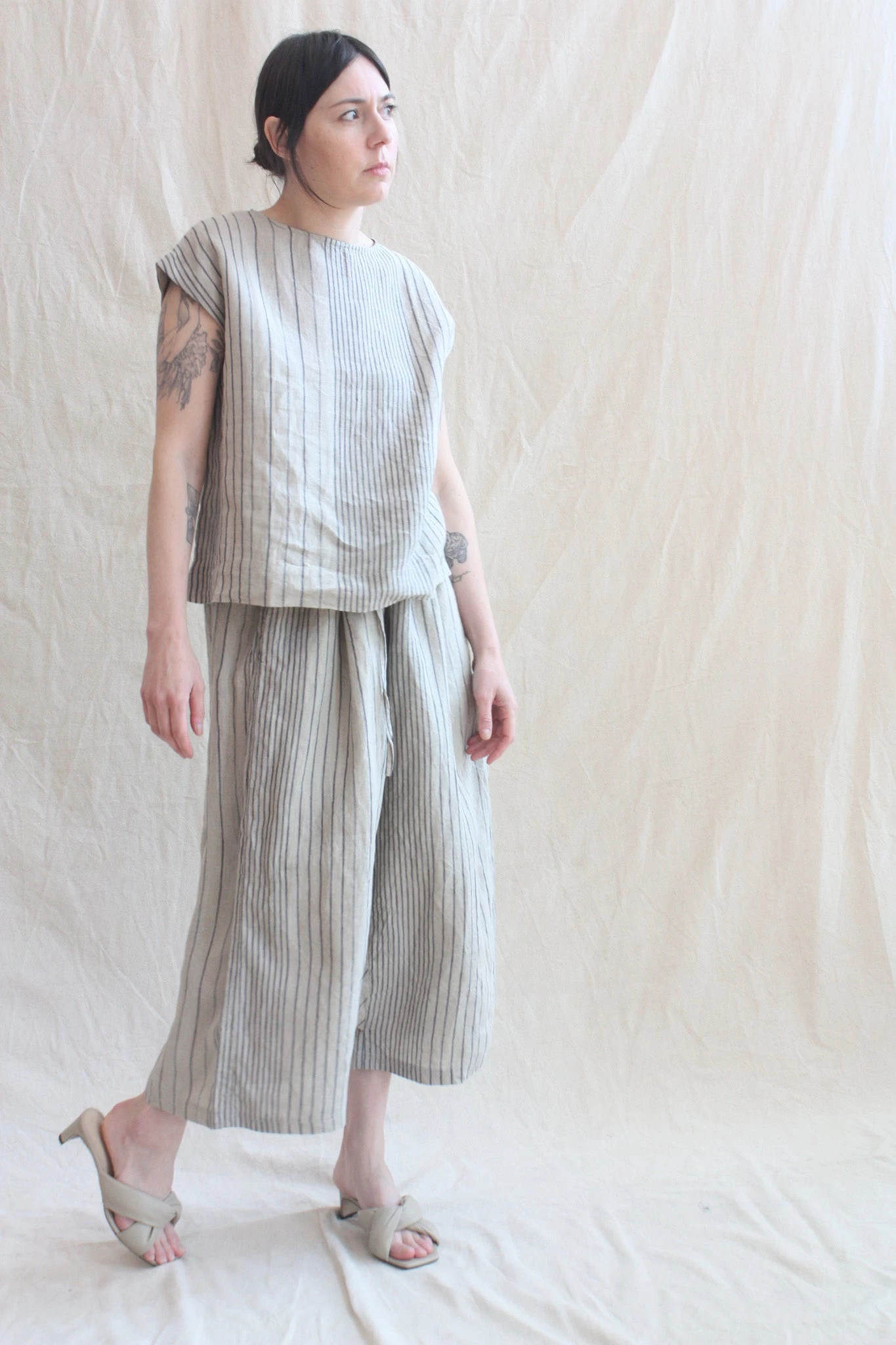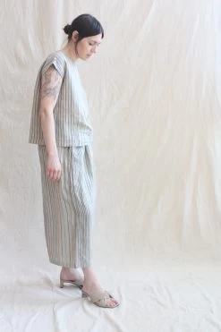 Simple-shaped, sleeveless linen top with button closure at back of neck. Coordinate with the Sarrouel Pant in Random Stripes Natural also from Ichi Antiquités.