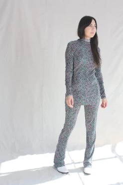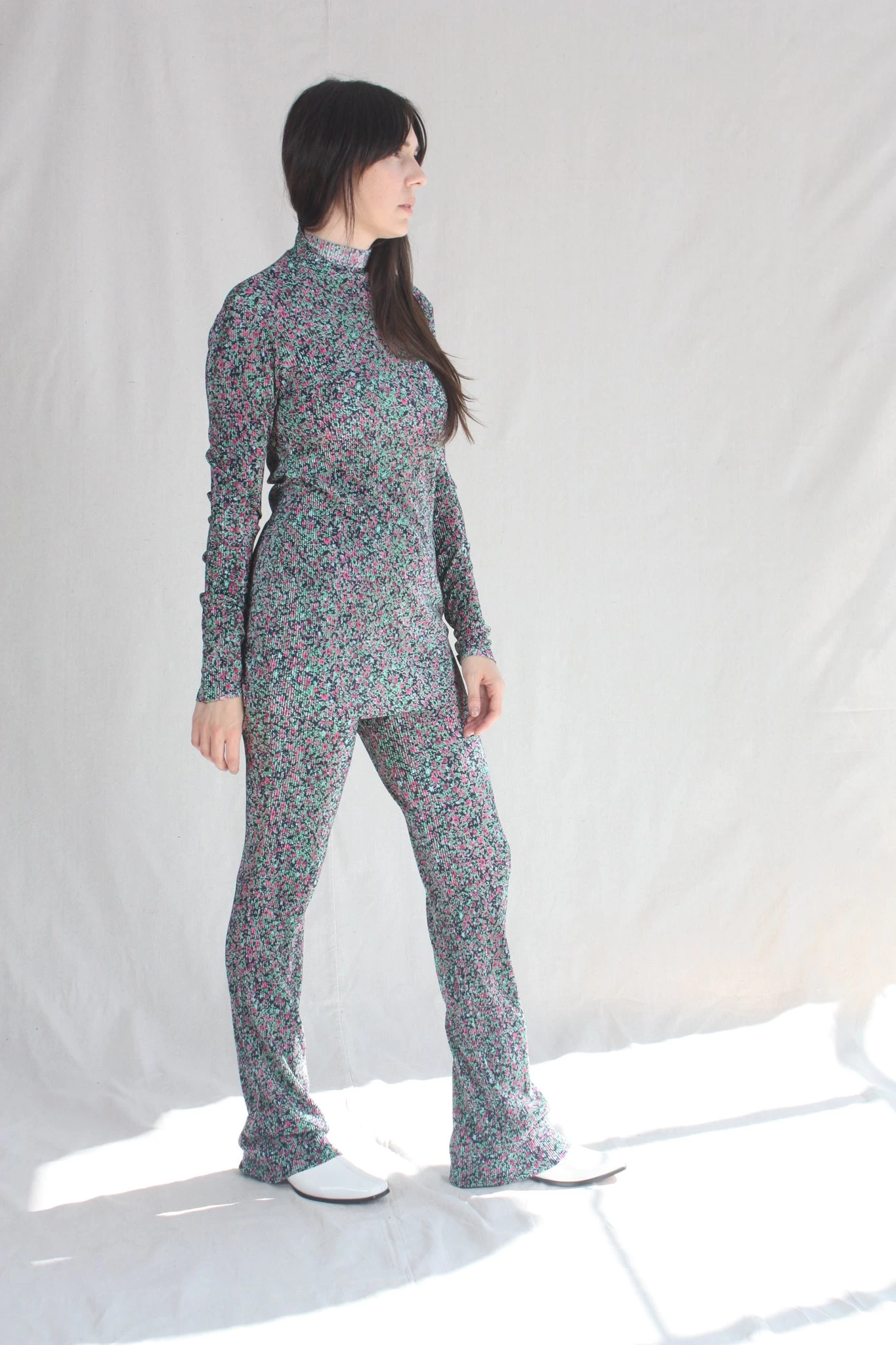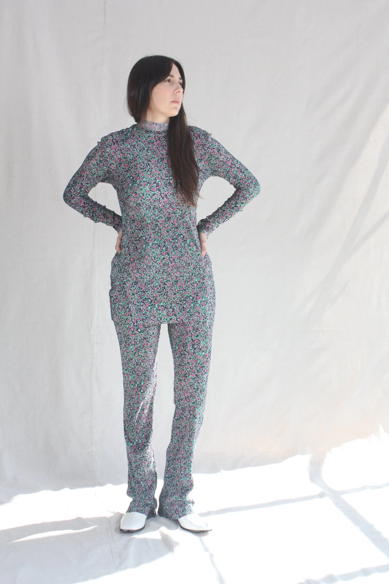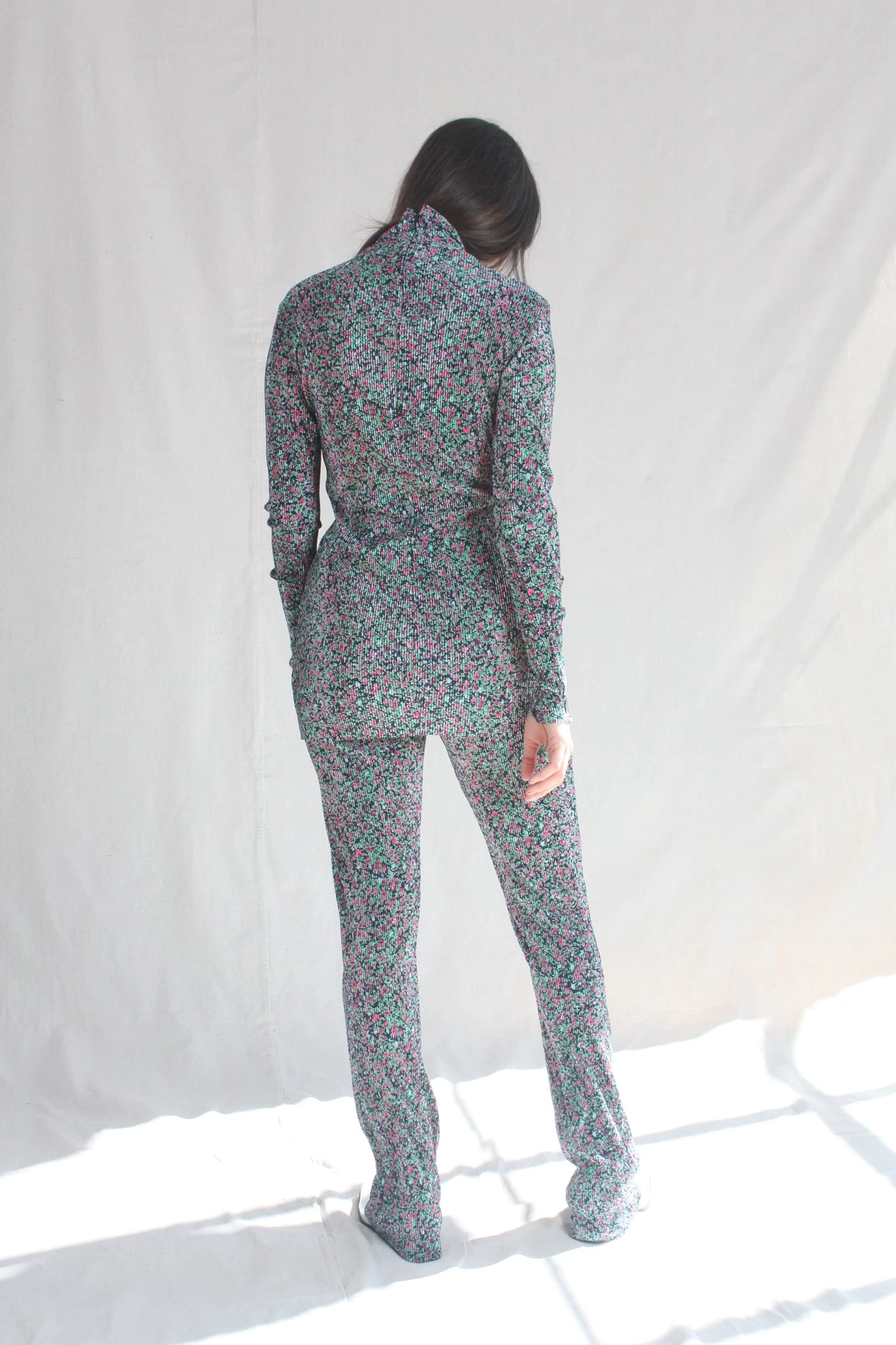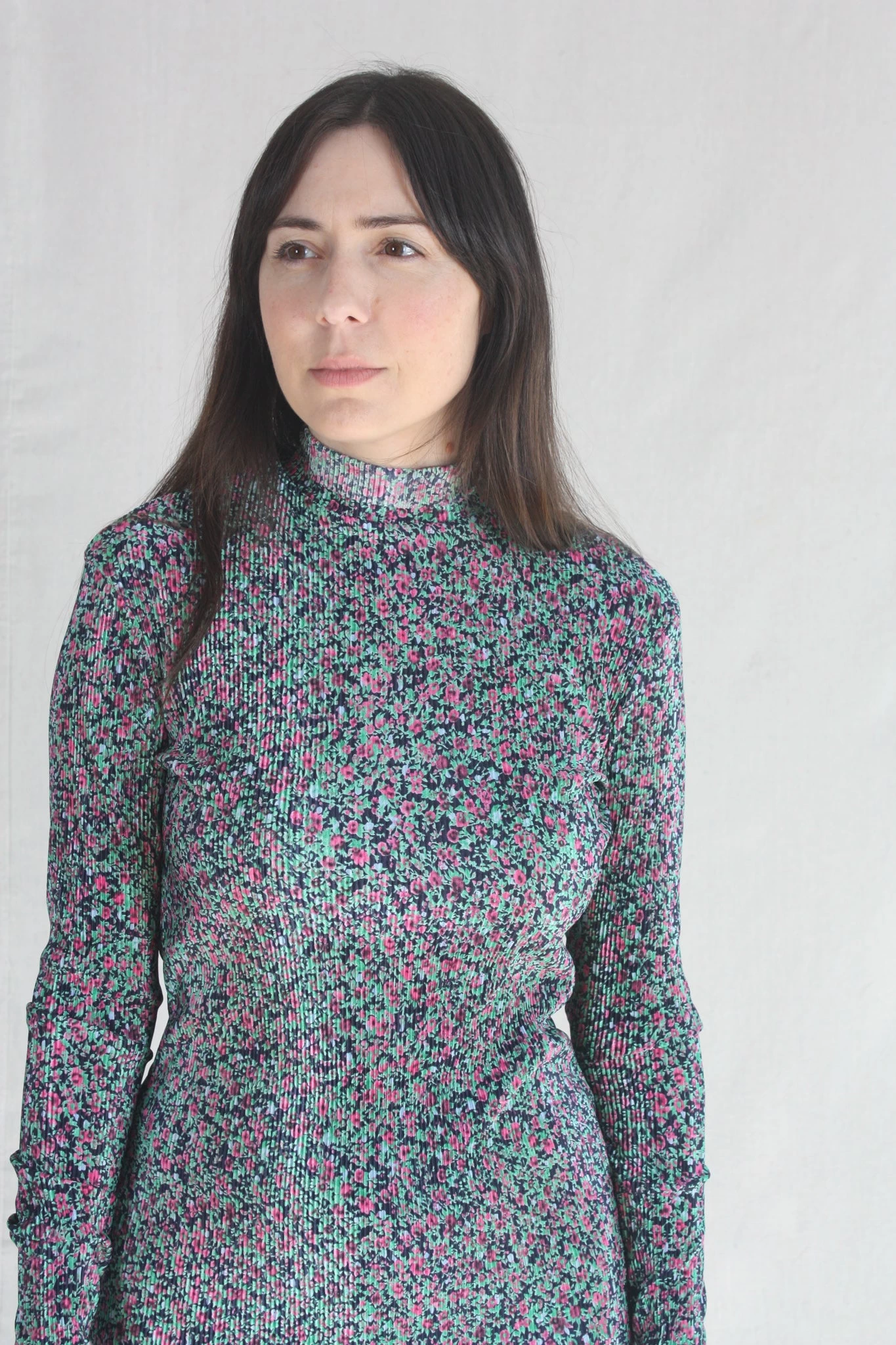 Long sleeve tunic with mock neck and center back zipper. Pleated floral print.
