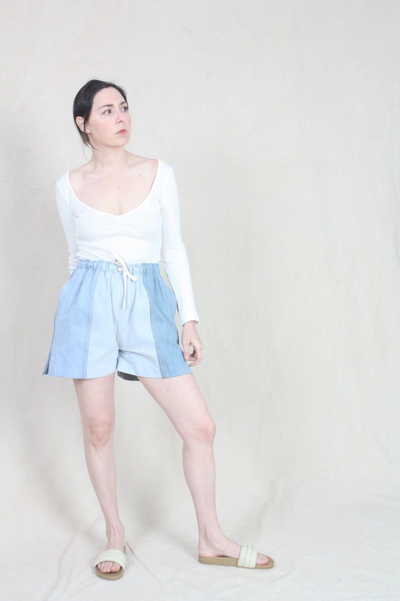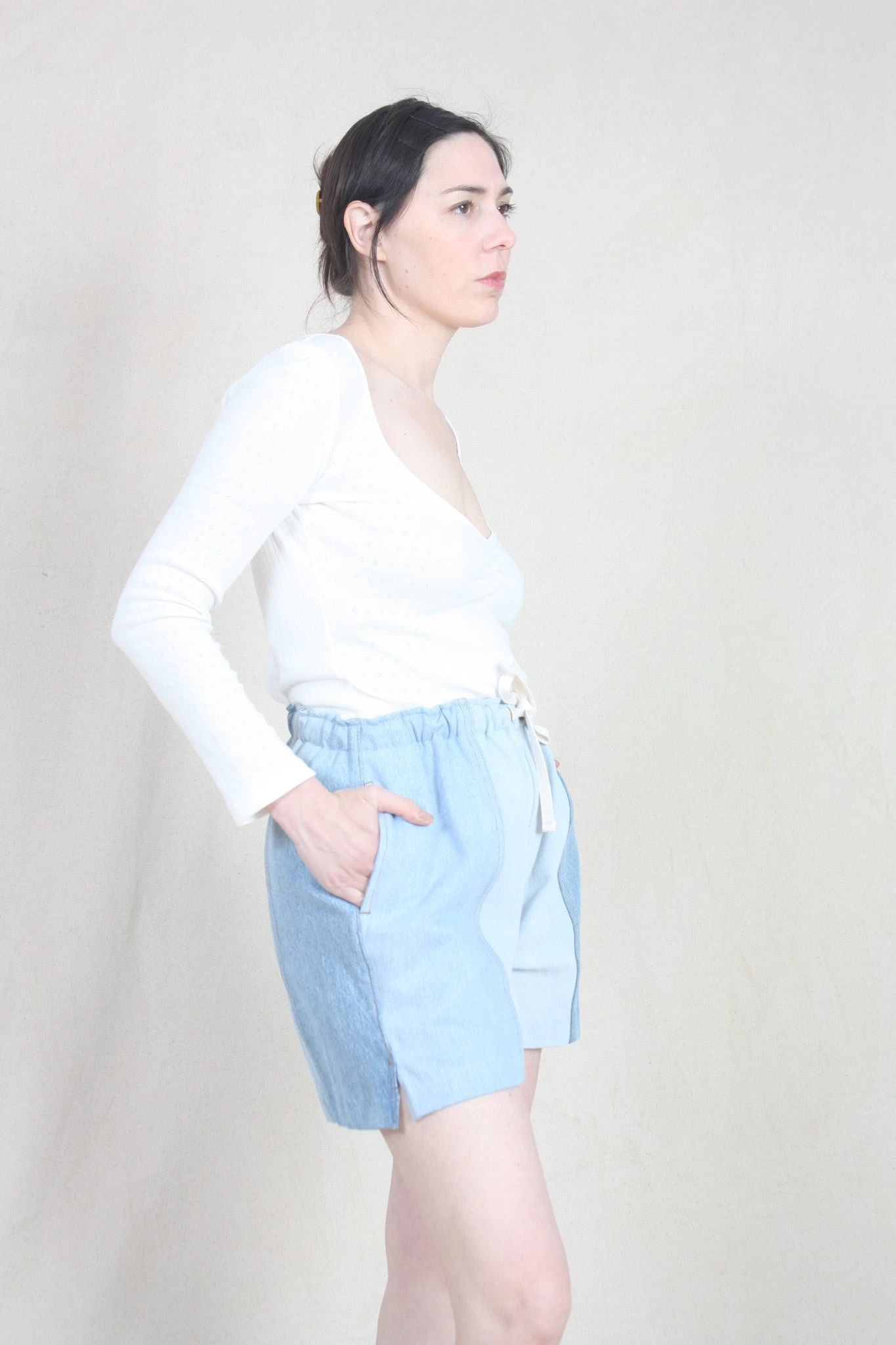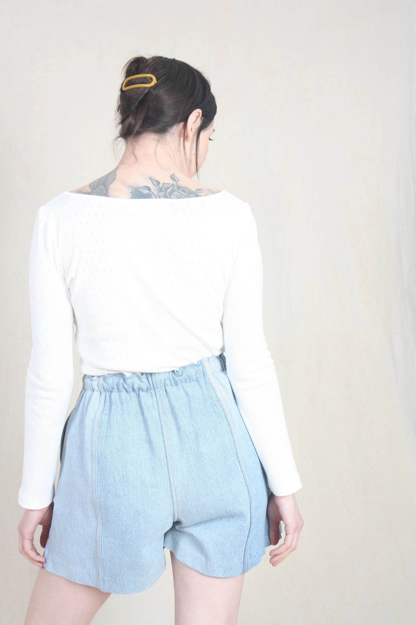 A delightful long sleeve scoop neck shirt made from an extremely soft deadstock cotton pointelle.