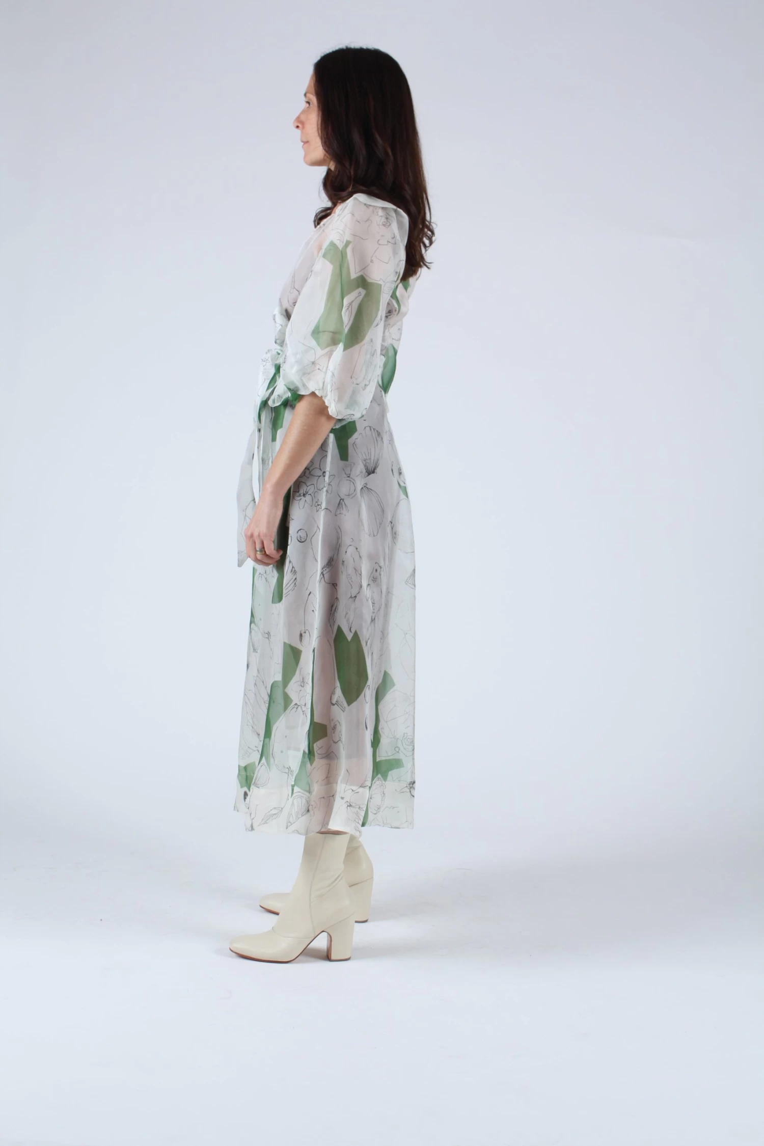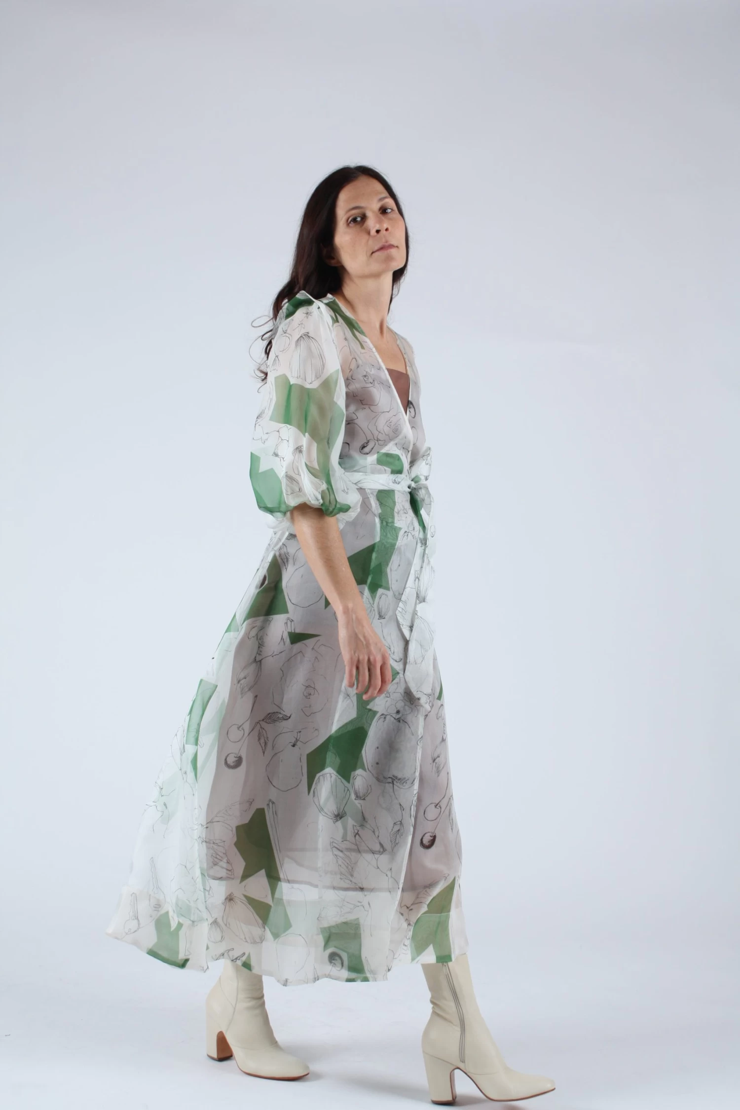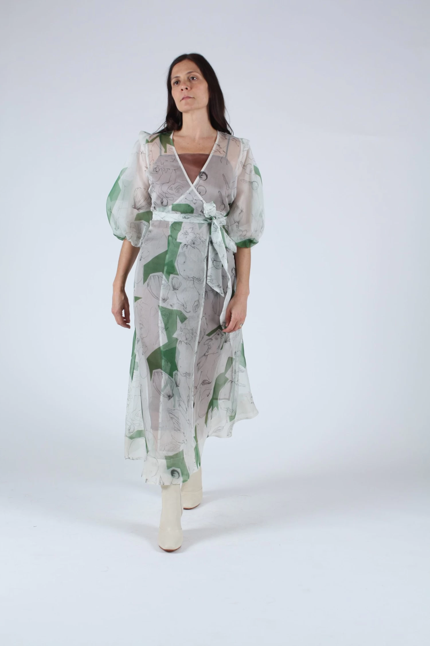 Silk organza wrap dress features full, elbow length sleeves with subtle ruffle detail at each shoulder. Wraps at the natural waist with self belt and wide hem. Print inspired by designers childhood memories.
