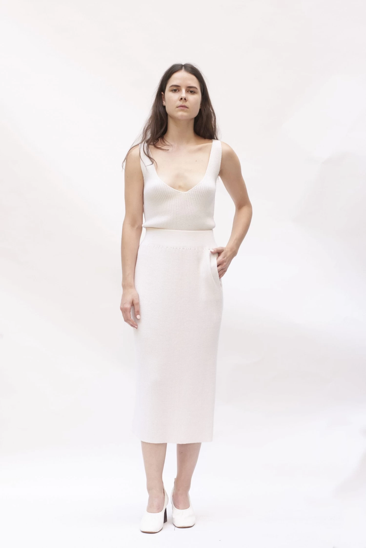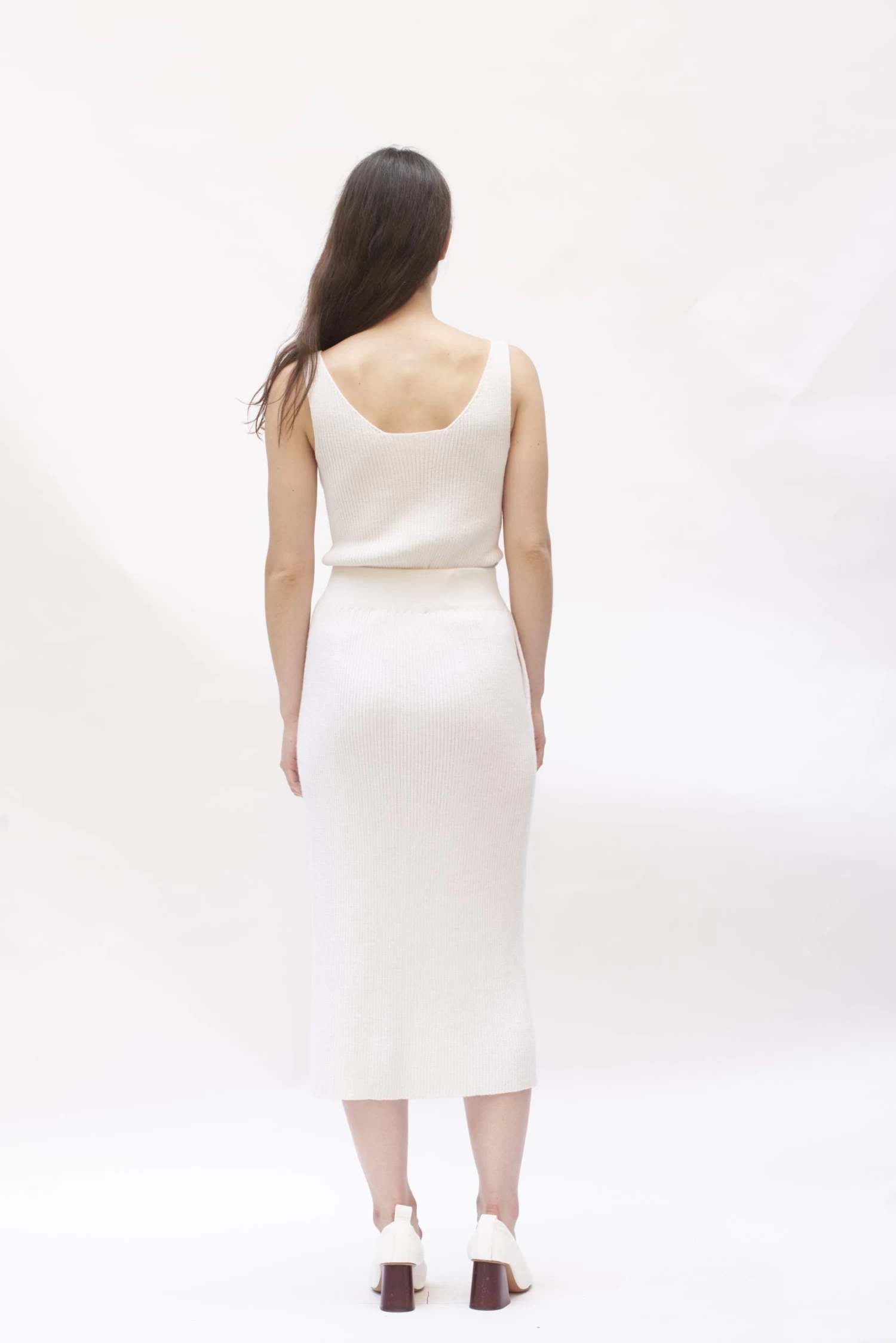 Fitted, ribbed knit tank, can be worn with low V in front or back.Â