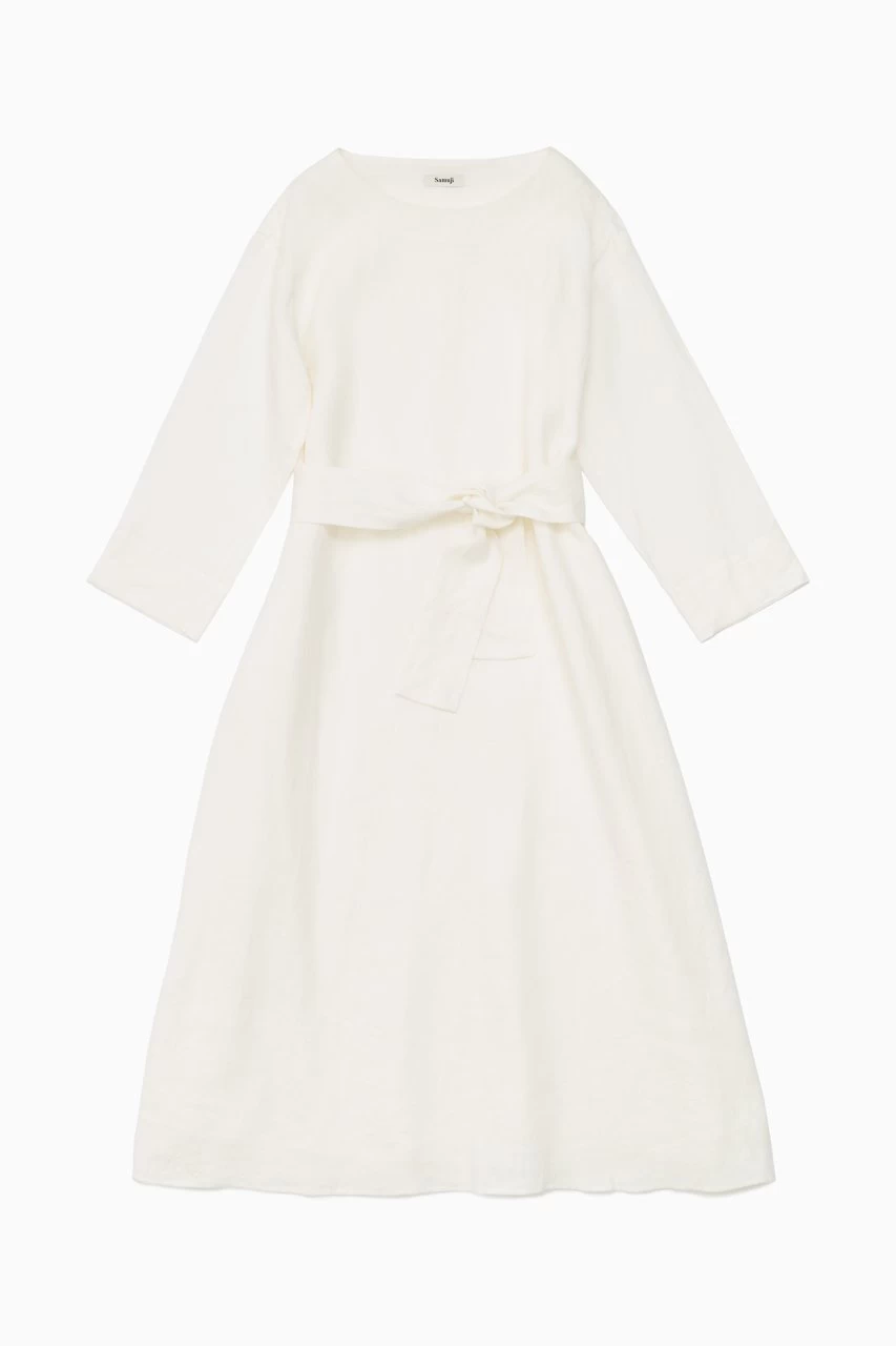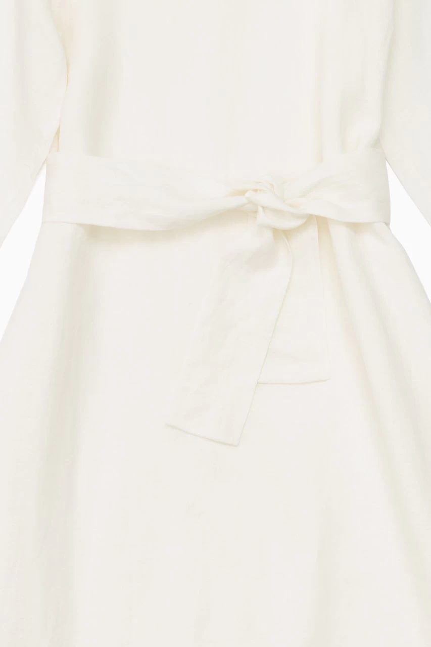 The Lucius Dress is made from ecru linen. The dress has a full A-lined hem and a boat neckline. It has slightly cropped sleeves with turnups and comes with a belt in the same material. The body is lined.