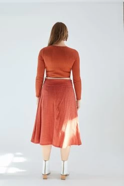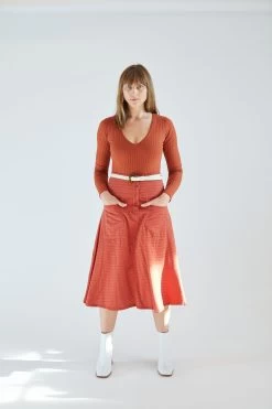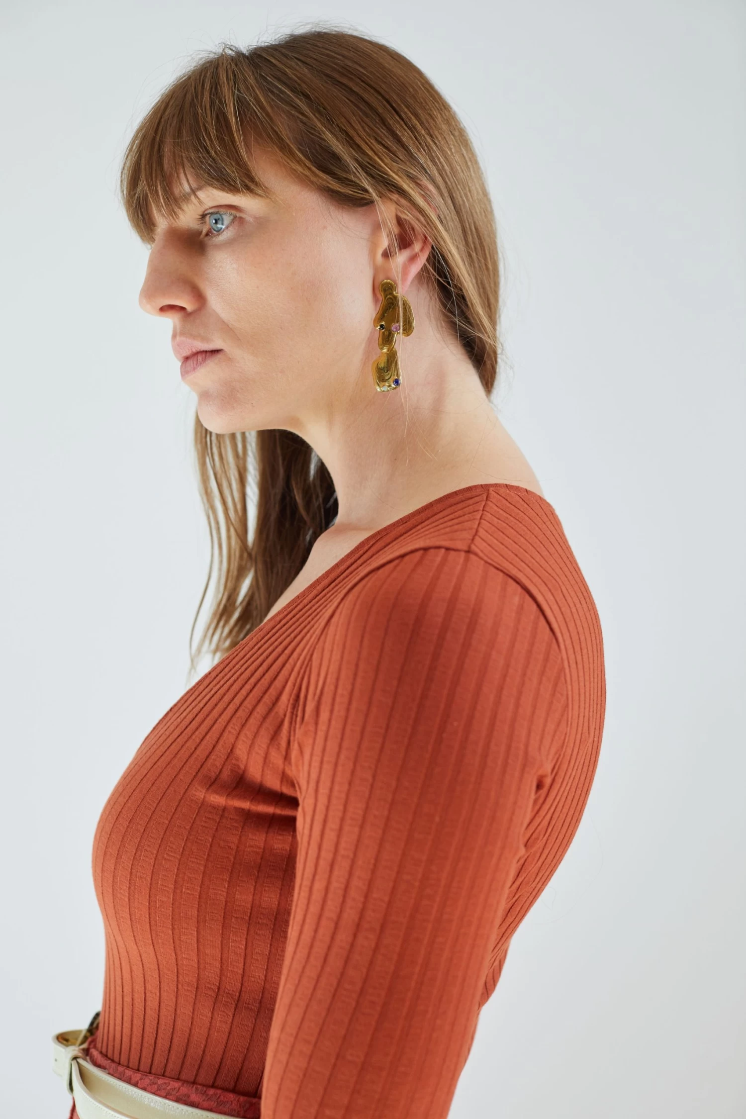 Fitted bodysuit in rich ribbed stretch Pima cotton. Flattering terracotta color, v neckline and snap closures for easy off and on.