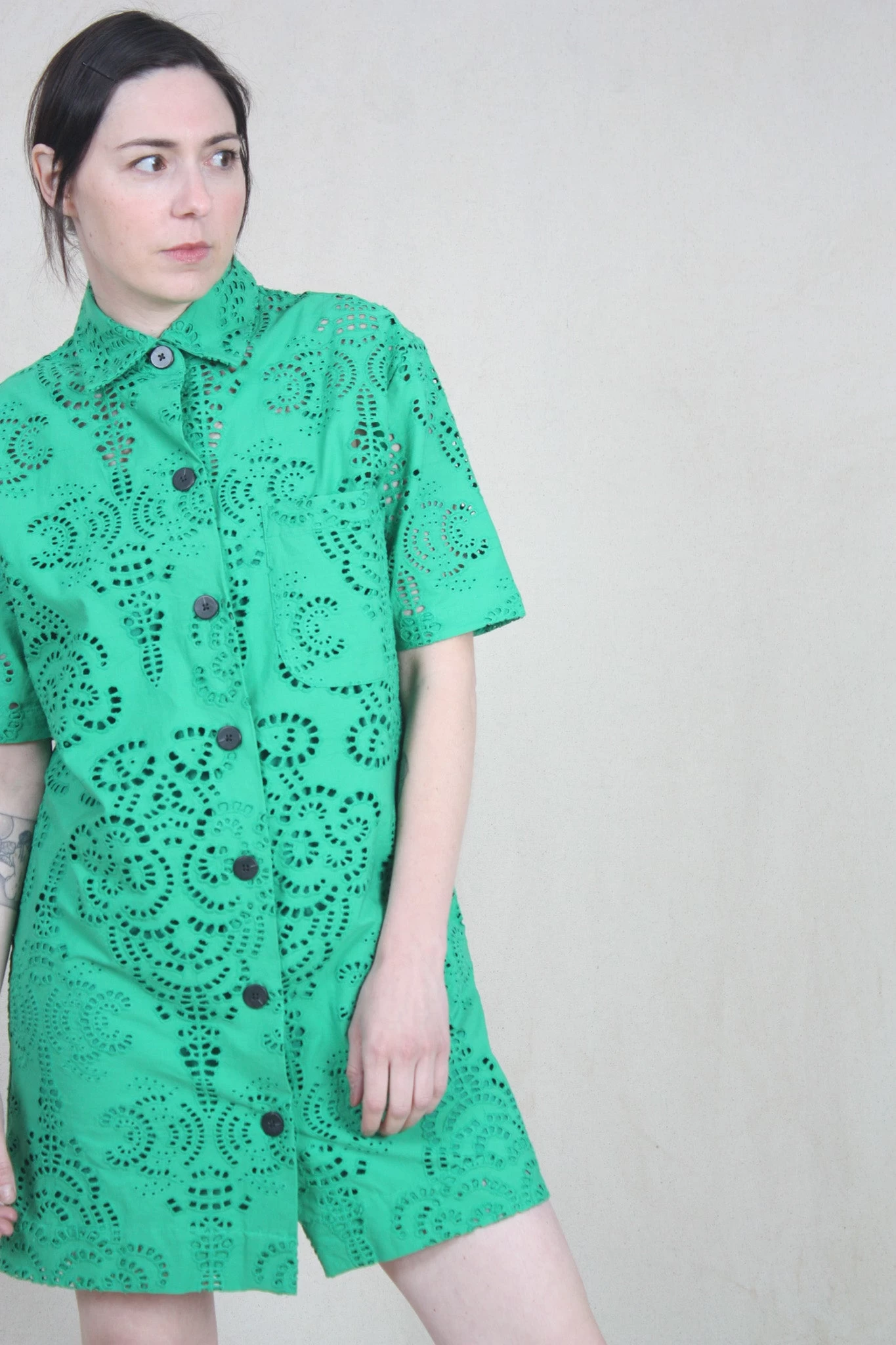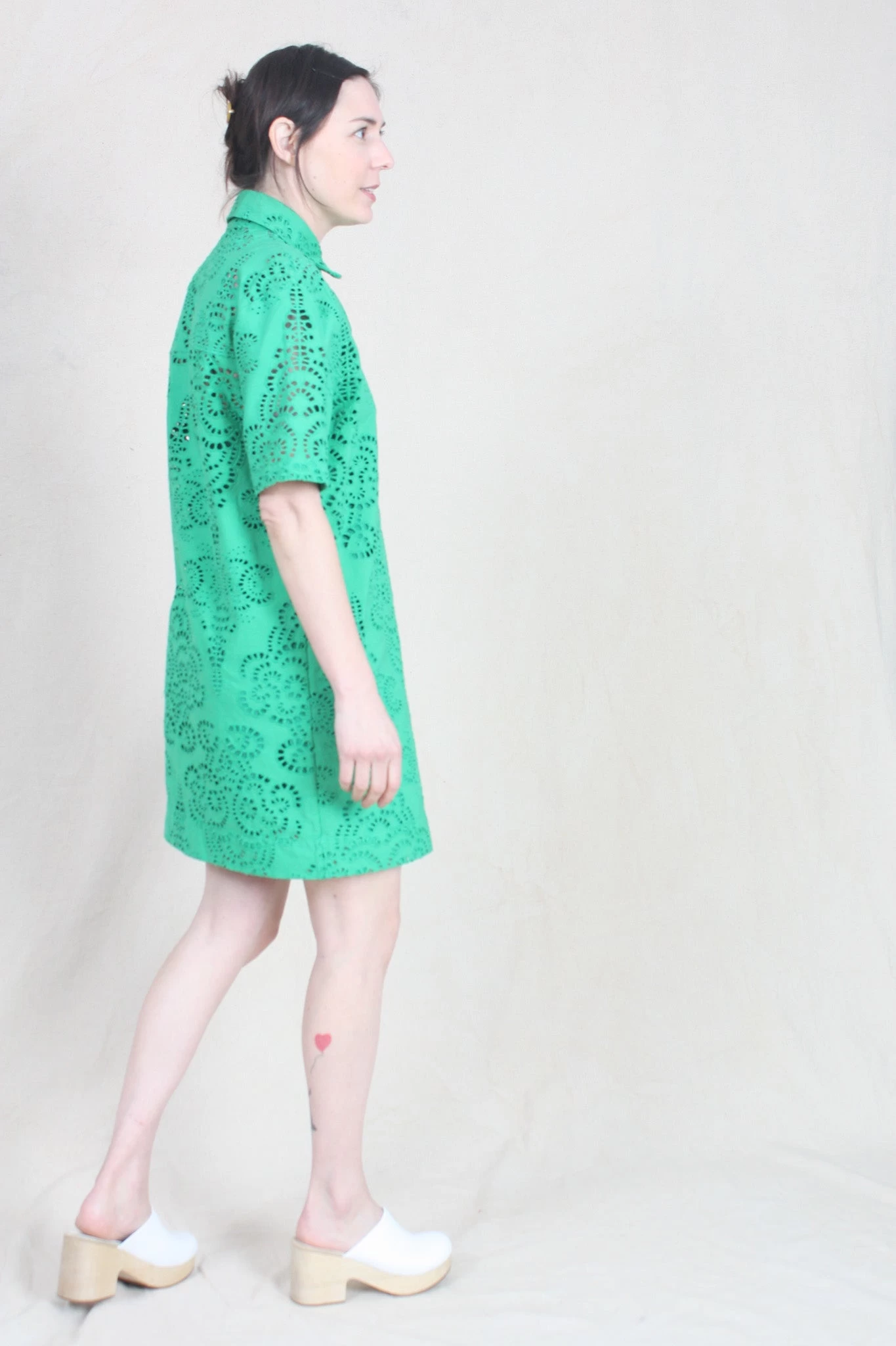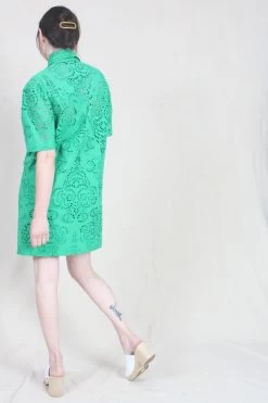 Classic oversized collared shirt dress in an intricate open-work cotton lace. Button down front with patch pocket. Semi sheer with slip dress lining.