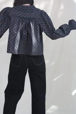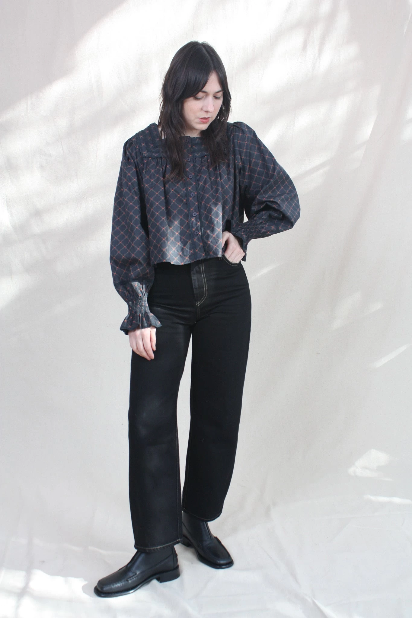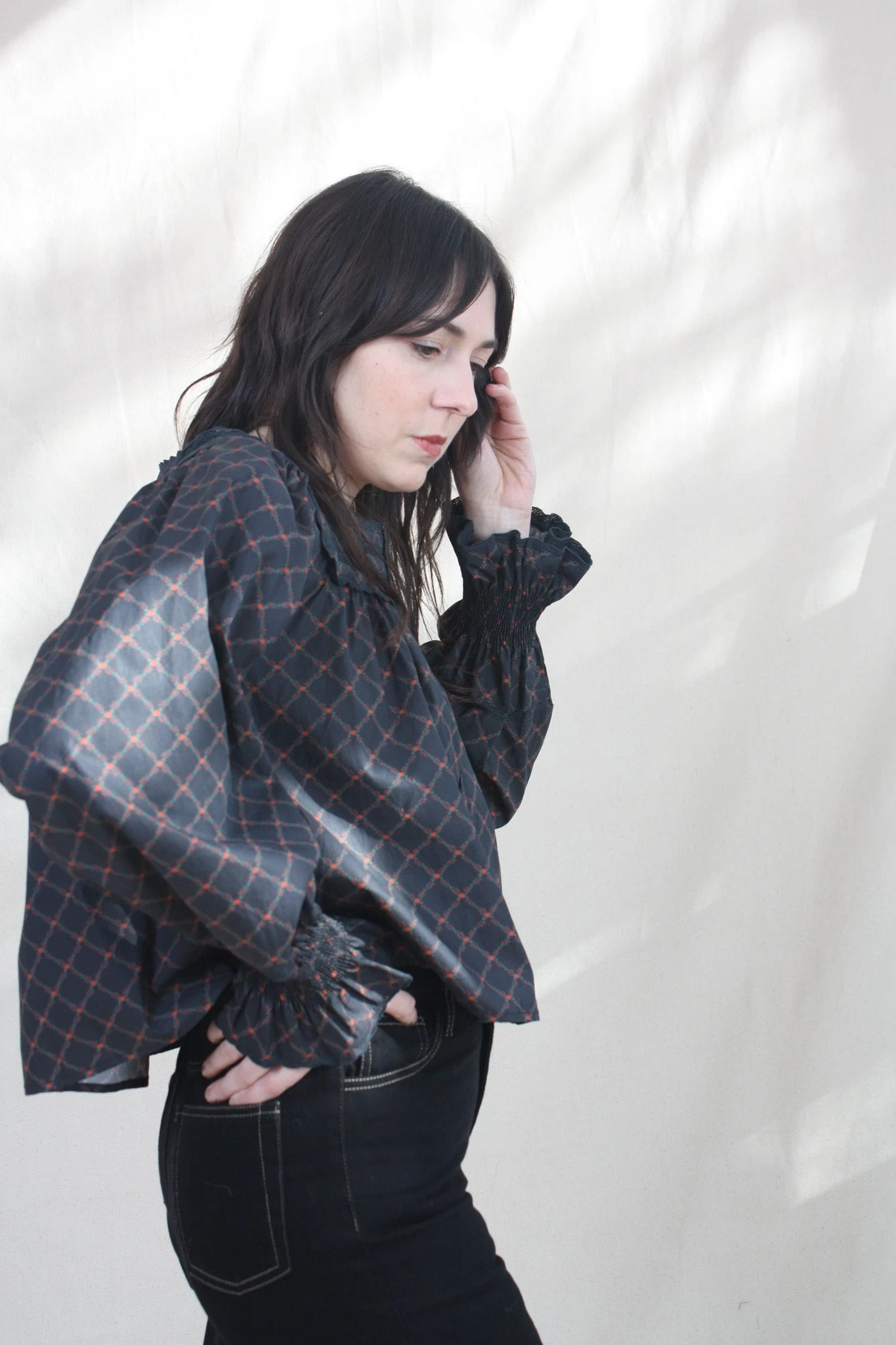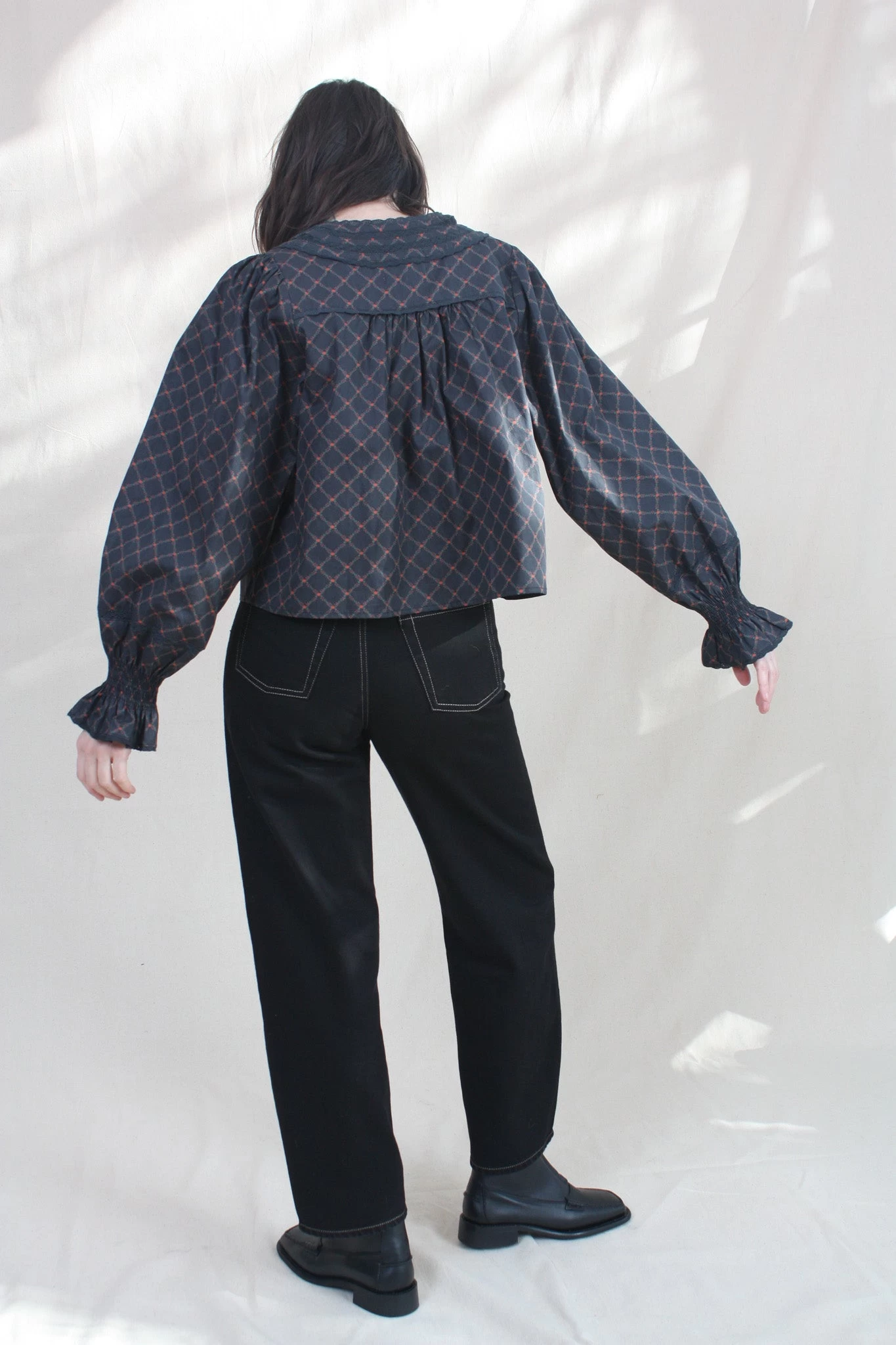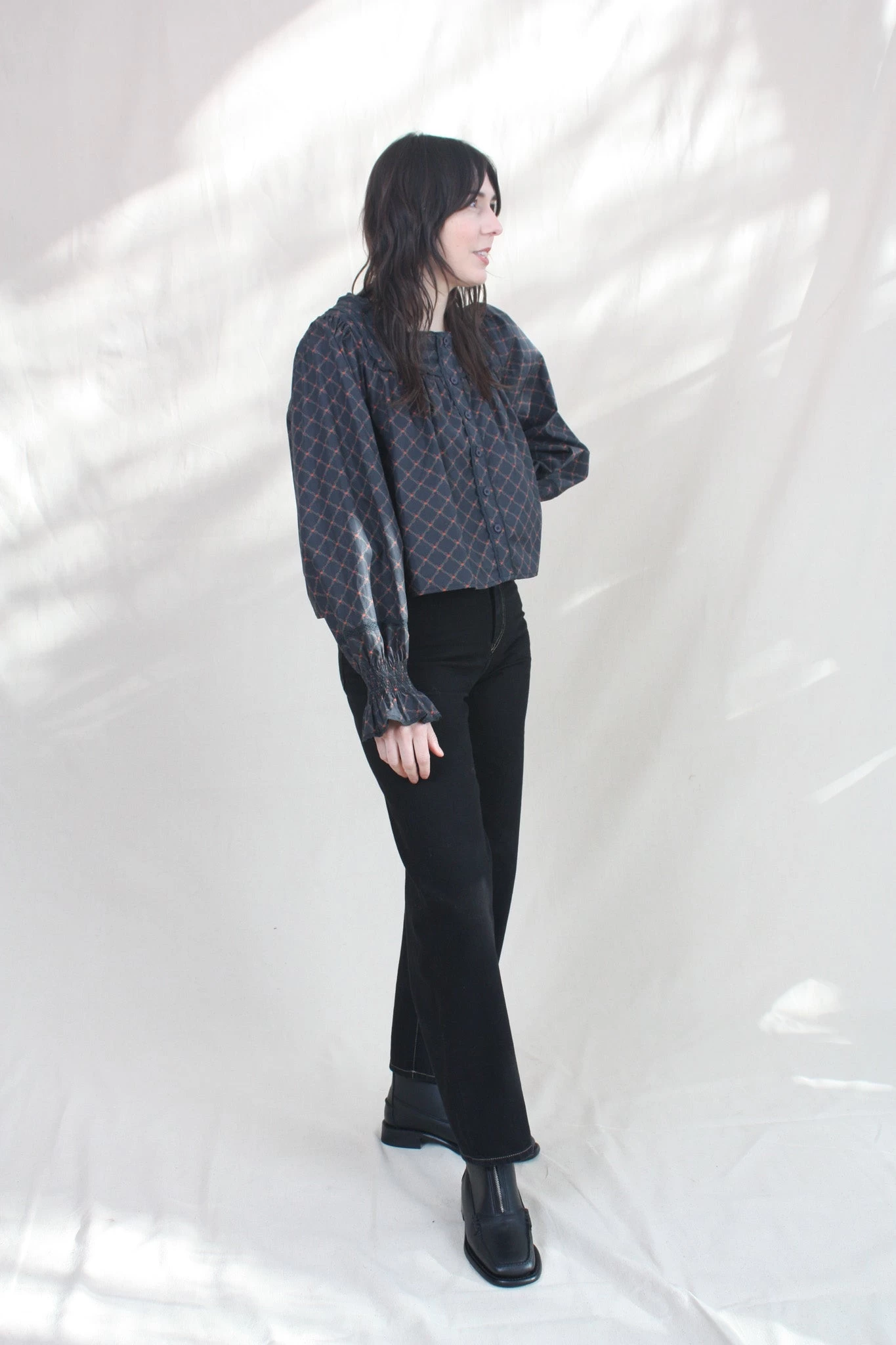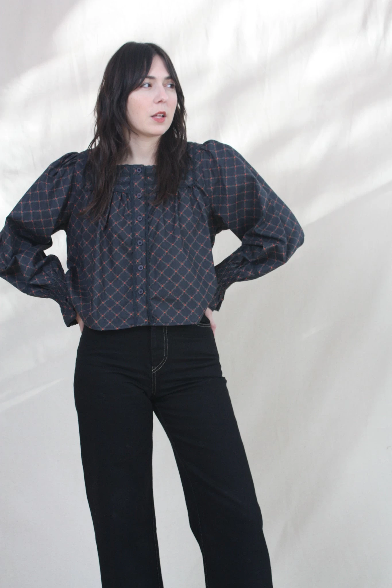The Maltese Top is a cotton poplin long sleeve top with a square neck reinforced by lace, subtle gathered shoulders and shirred cuffs. The Cross Floral Print features miniature floral lattices set on deep navy. Crafted from soft cotton.