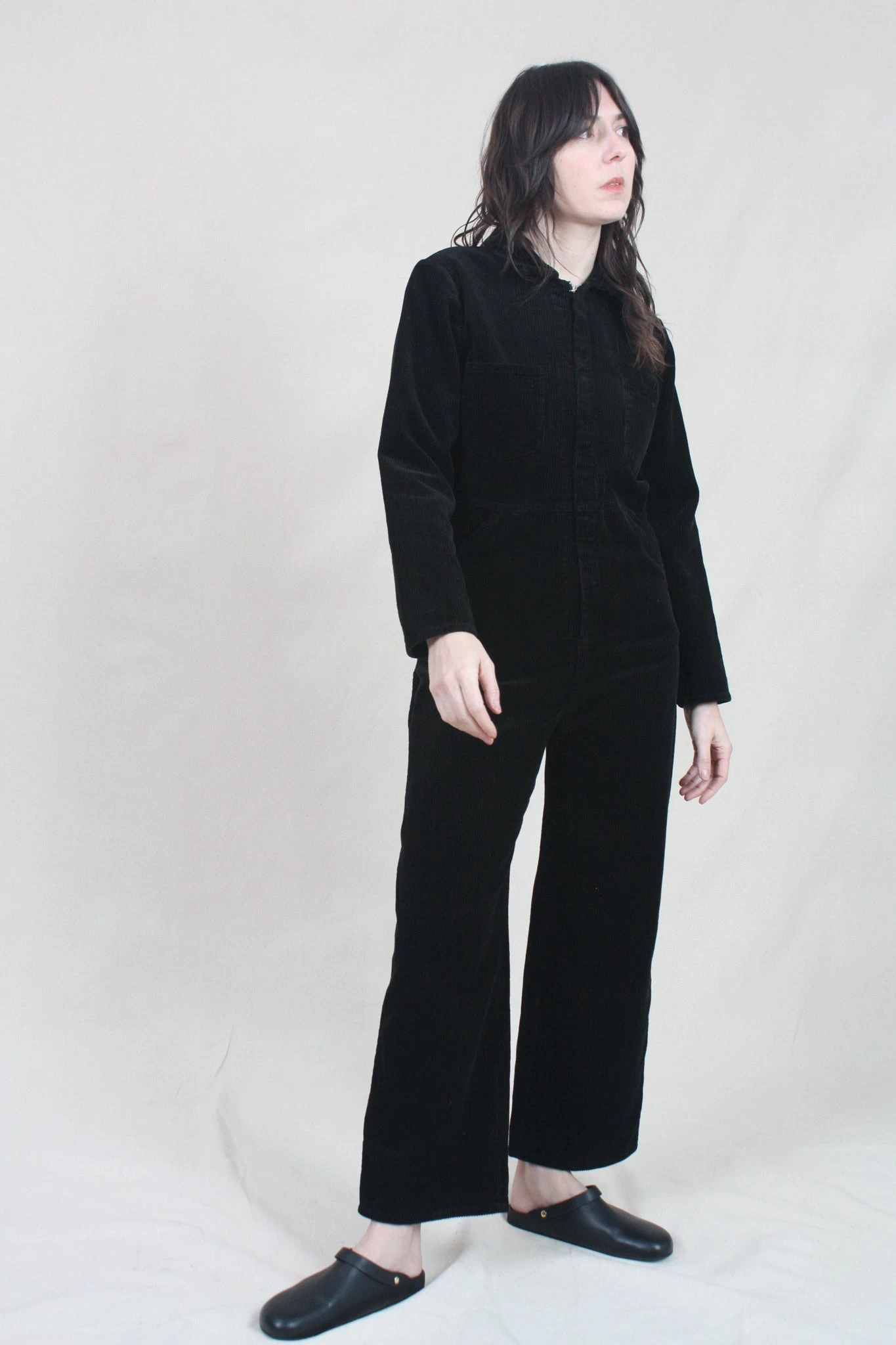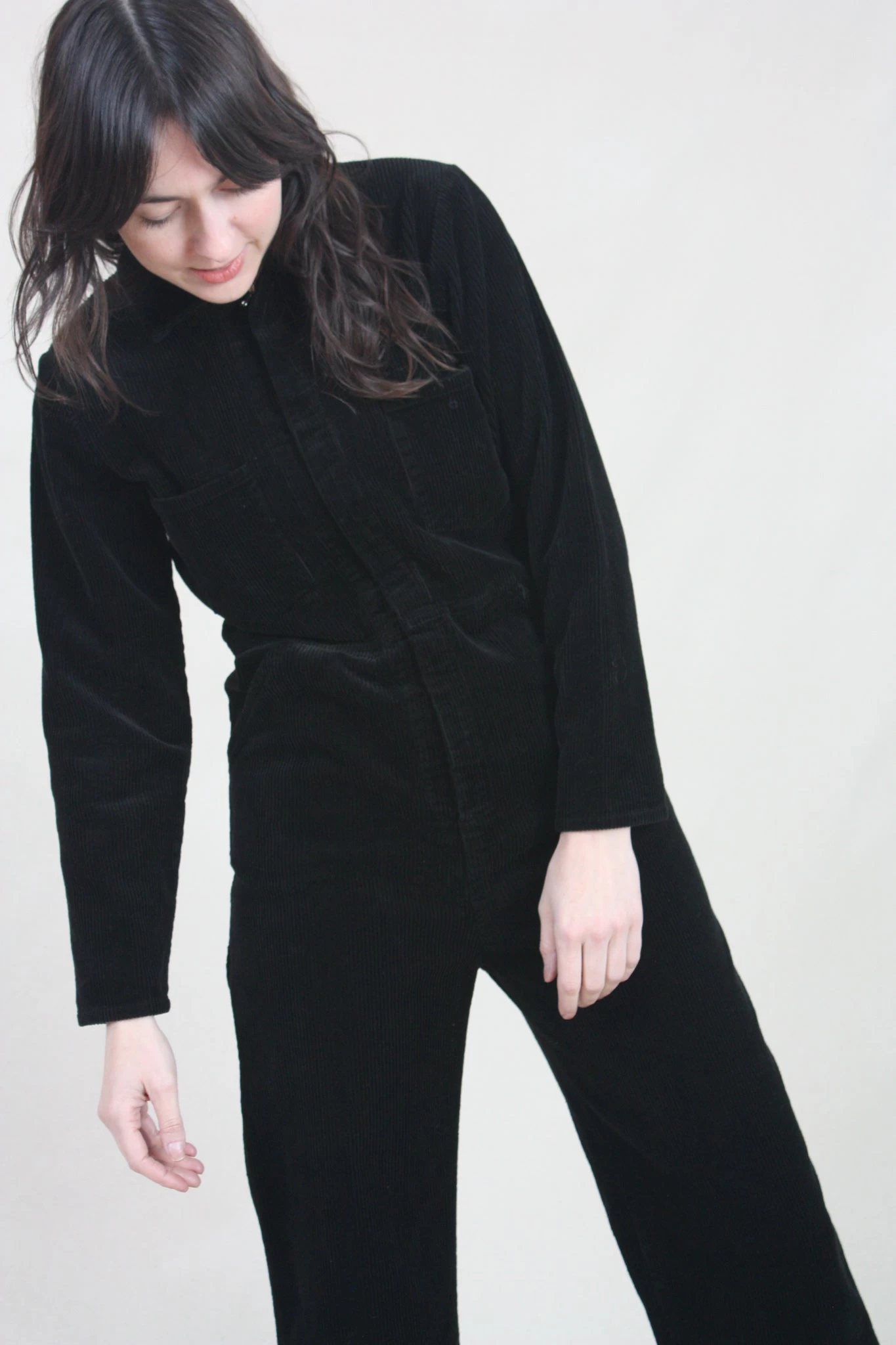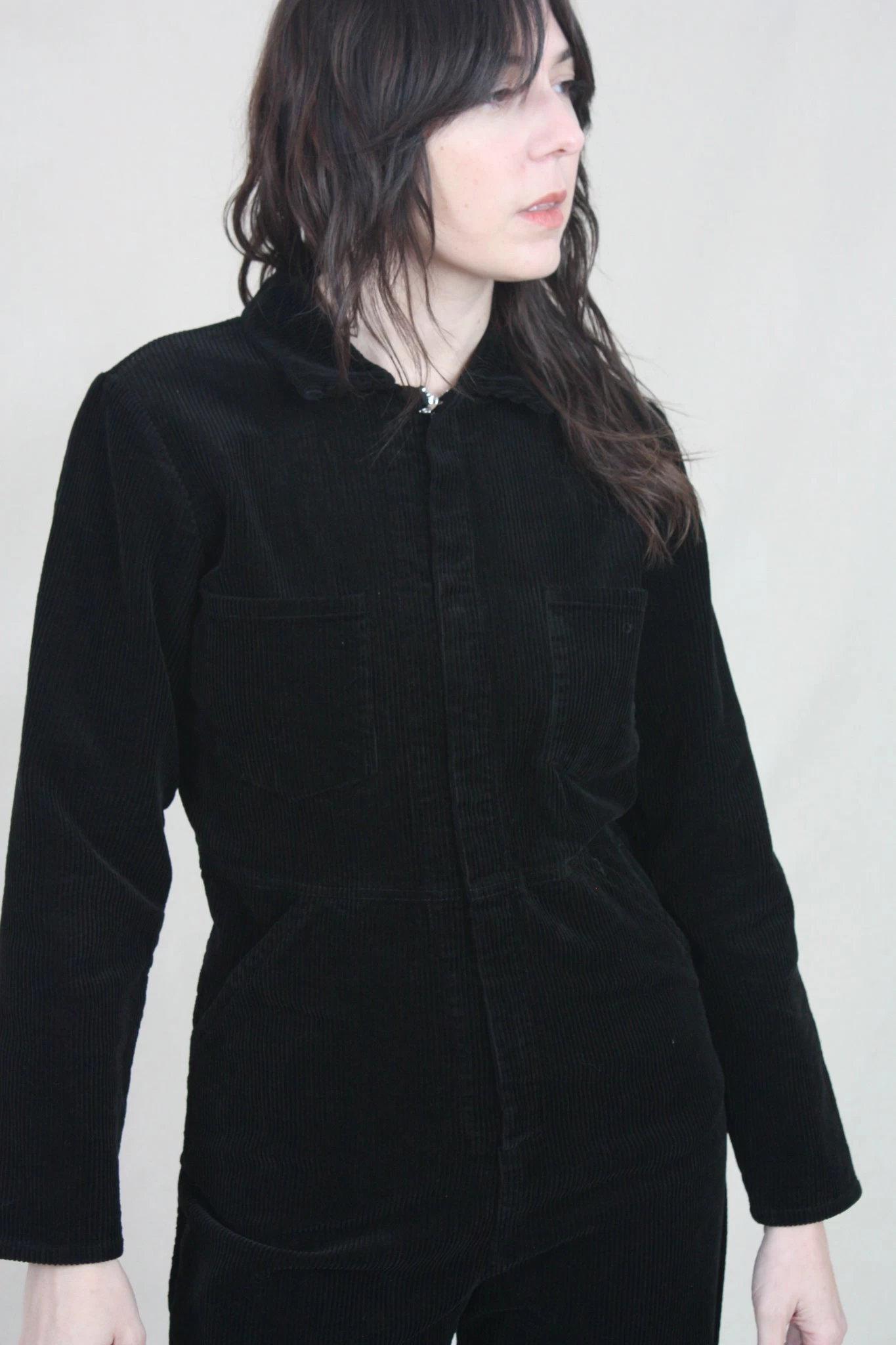 A modern, workwear-inspired coverall. Made from a midnight blue mid-weight cotton corduroy. Two front pockets and two side pockets. Hidden front zipper closure.