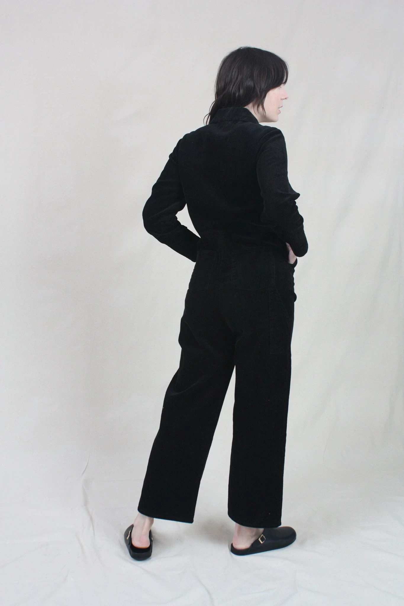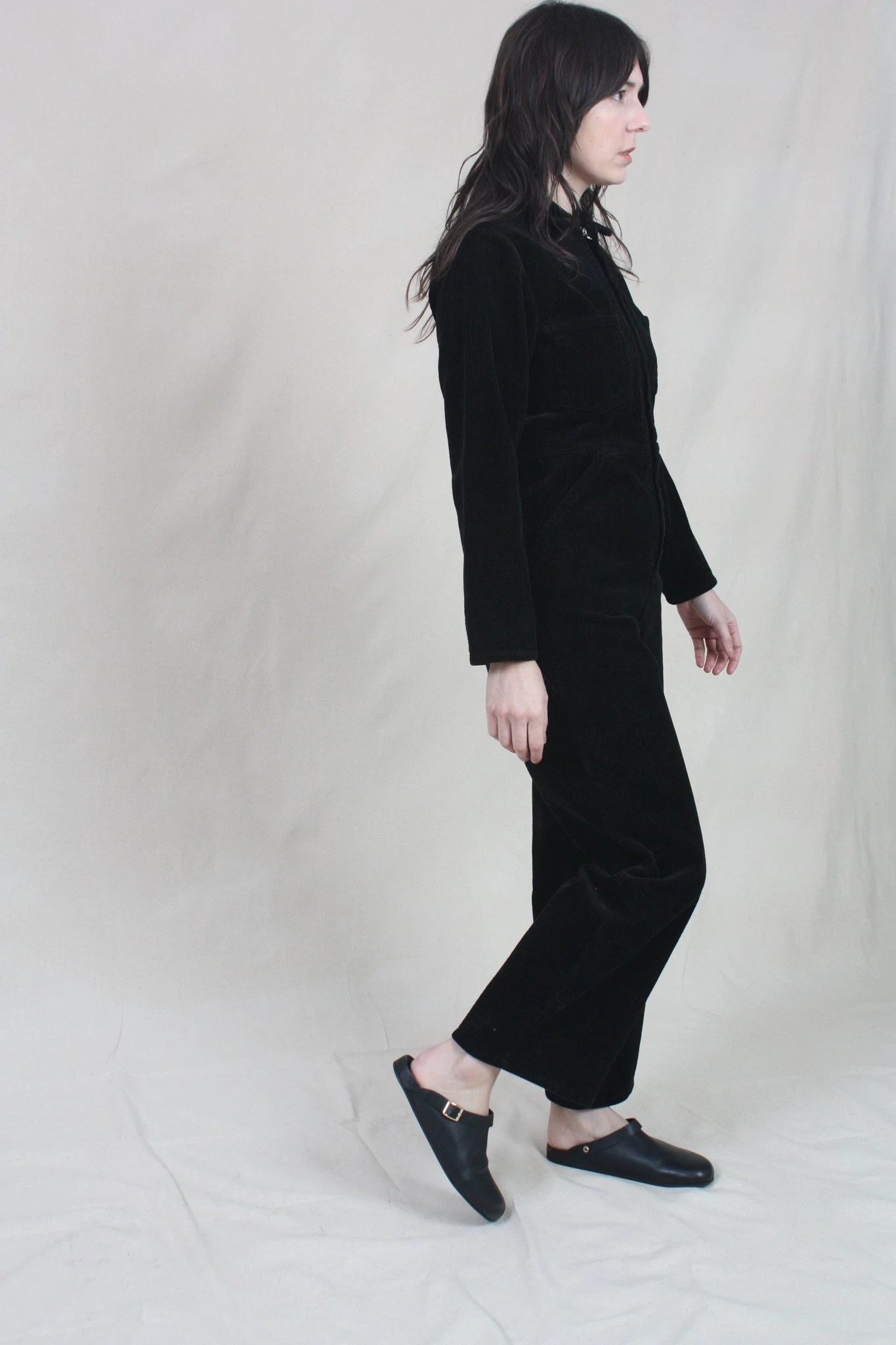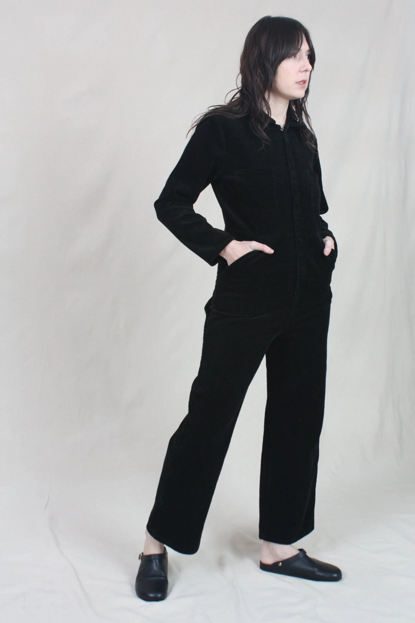 A modern, workwear-inspired coverall. Made from a midnight blue mid-weight cotton corduroy. Two front pockets and two side pockets. Hidden front zipper closure.
