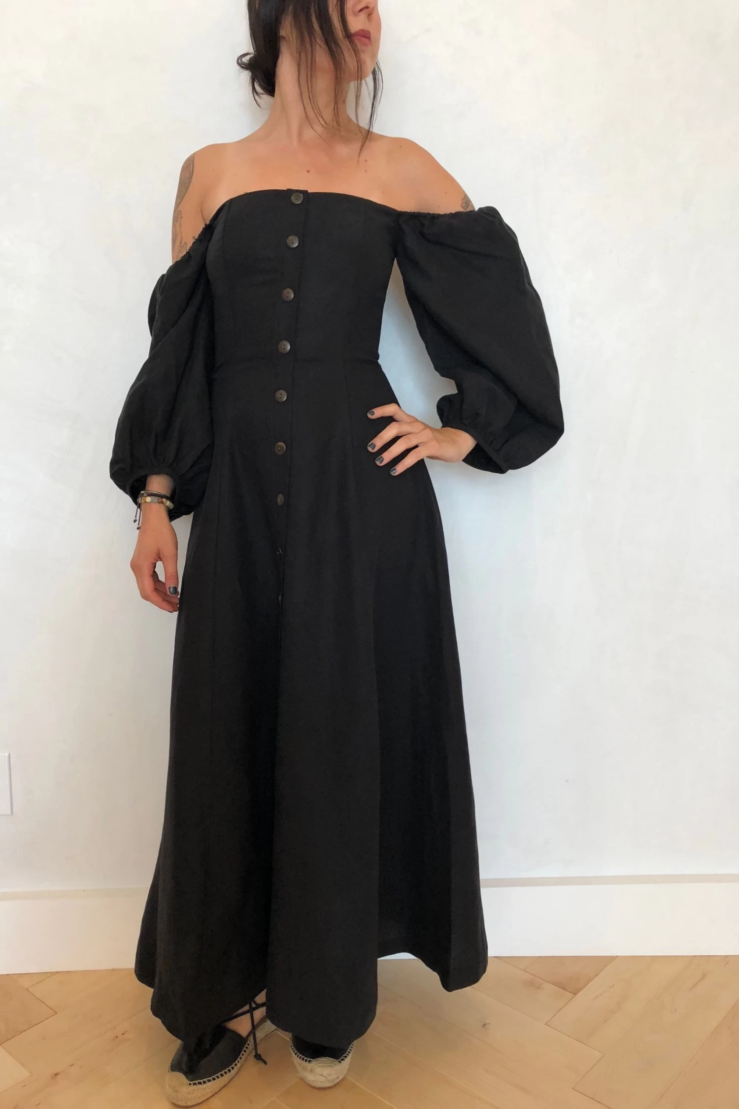 Marlow midi dress in black. Fitted bodice with boning and full 3/4 sleeves, which can be worn on or off the shoulders. Zipper at back. Bodice lined.