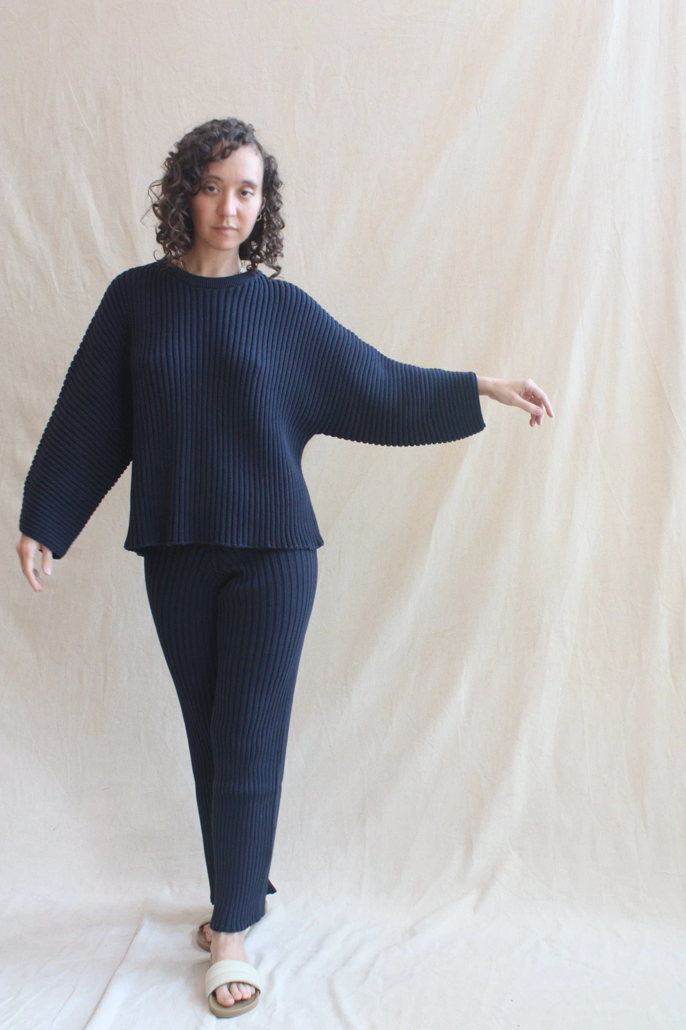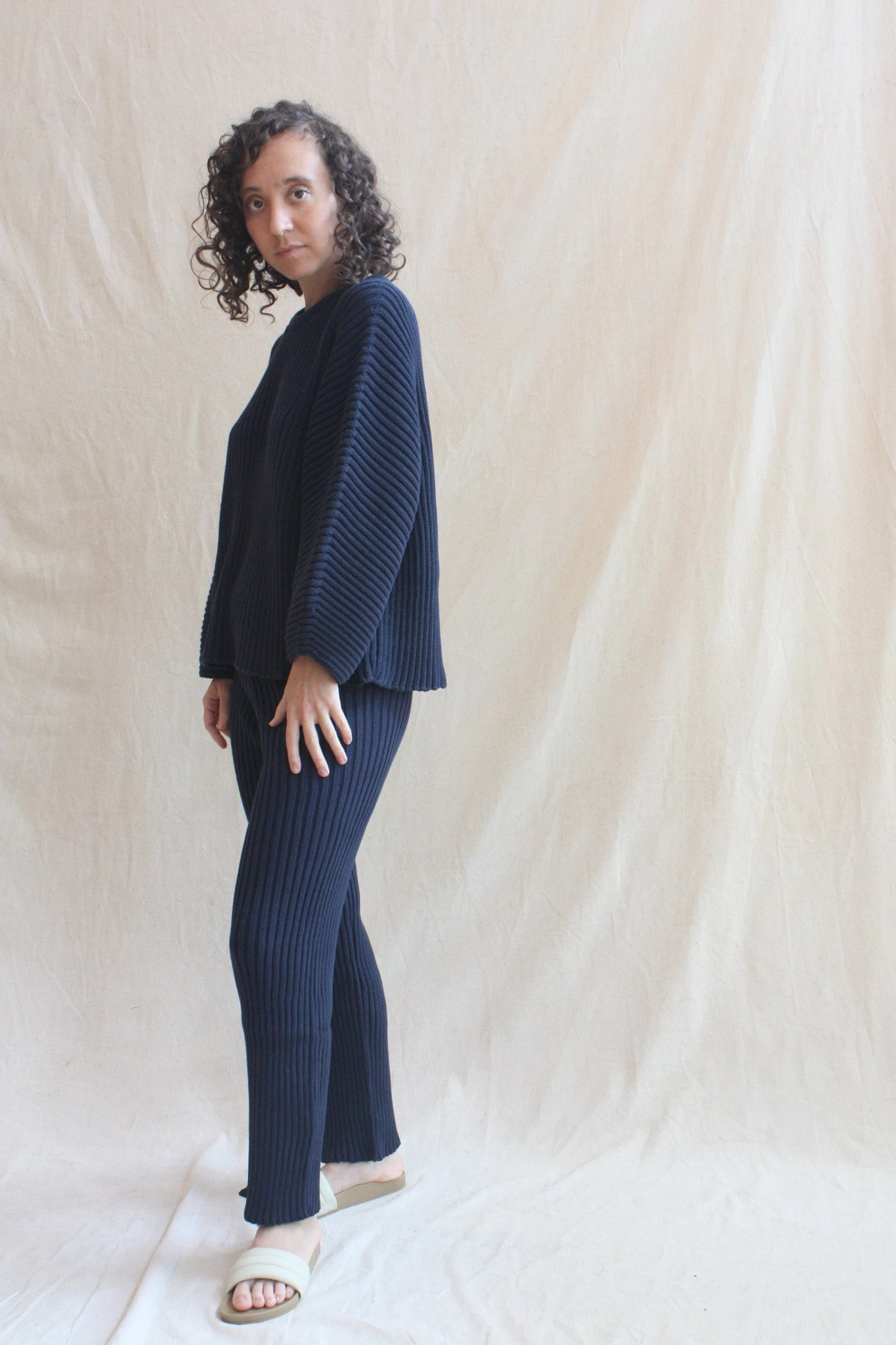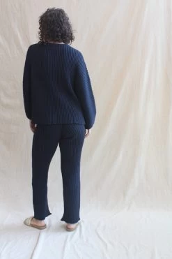 Organic cotton ribbed knit pant with an elastic waistband and cropped leg. Pair with the coordinating Baserange Kai Sweater. GOTS, Oeko-Tex, OCS 100 certified cotton from Brazil, India, and Egypt.