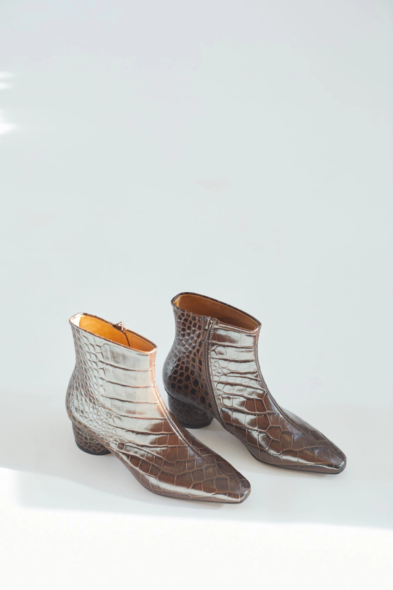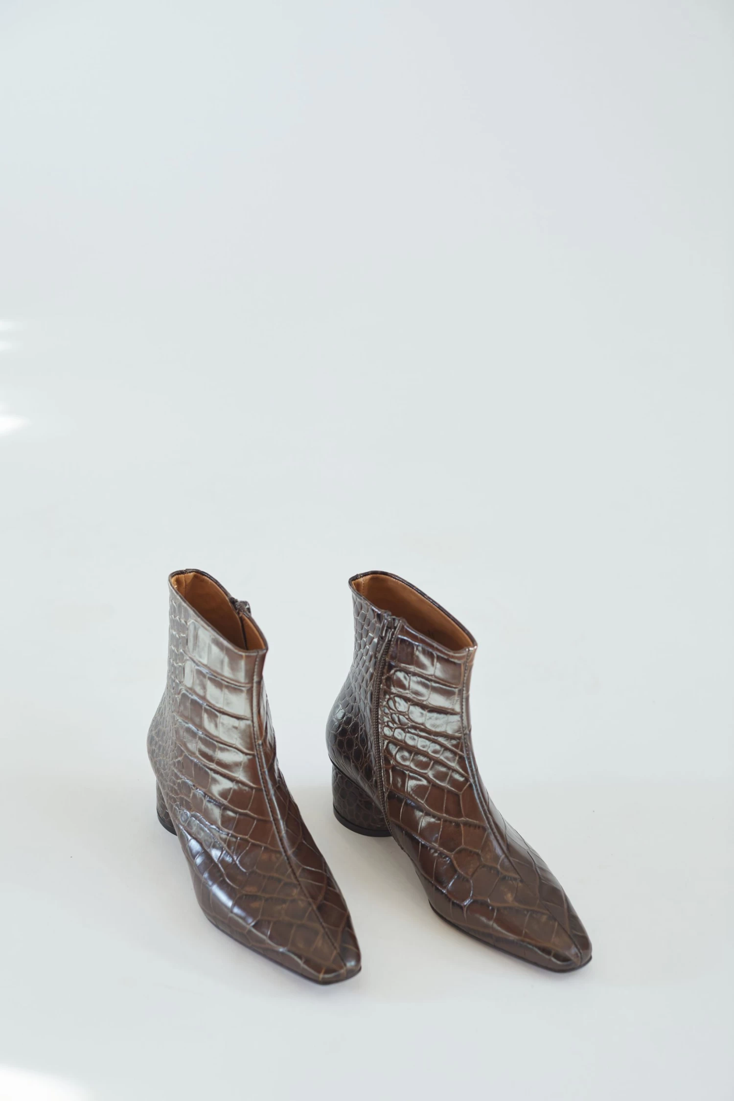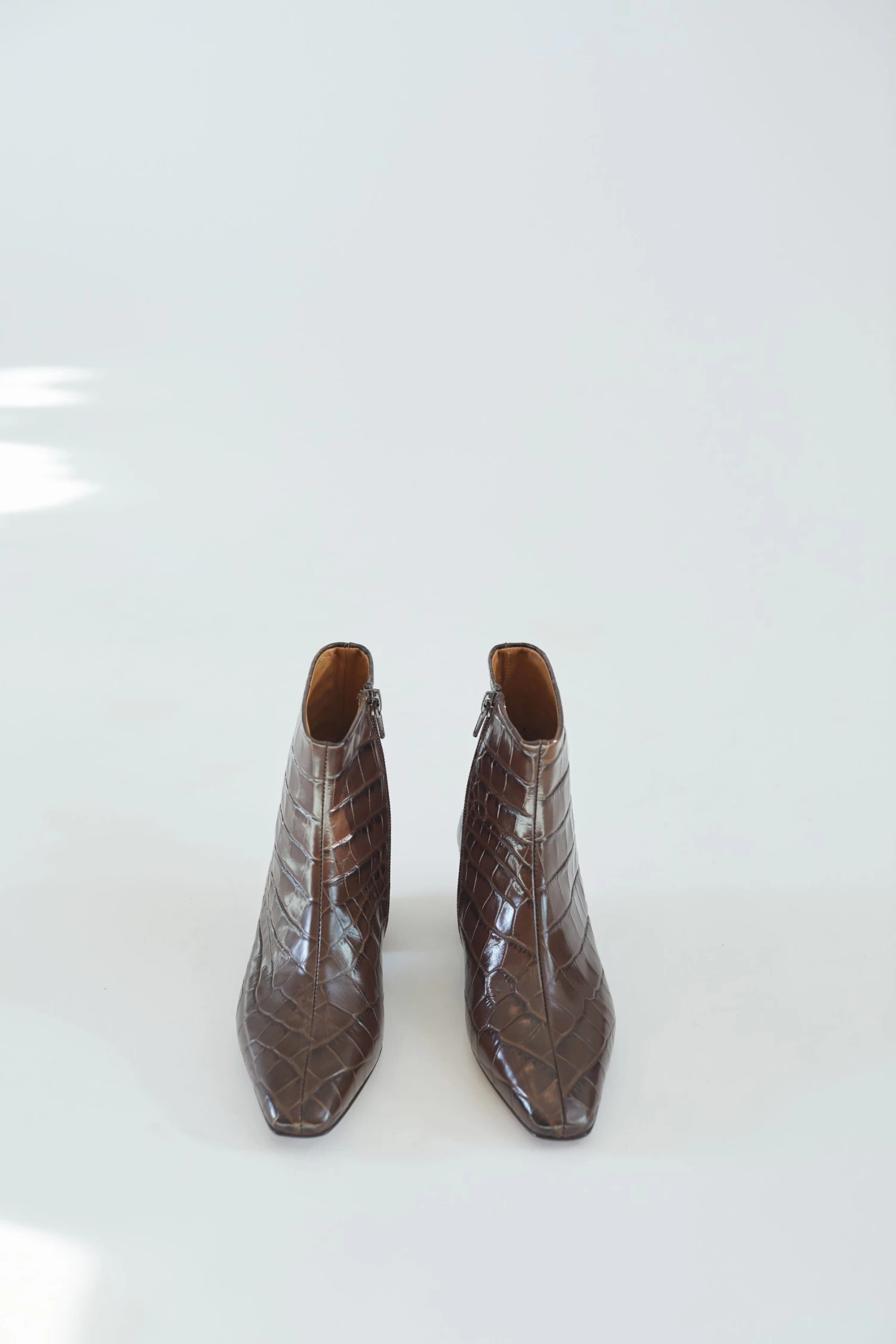 The Matea is an ankle boot in embossed聽brown leather with an almond toe. Oval heel covered in leather