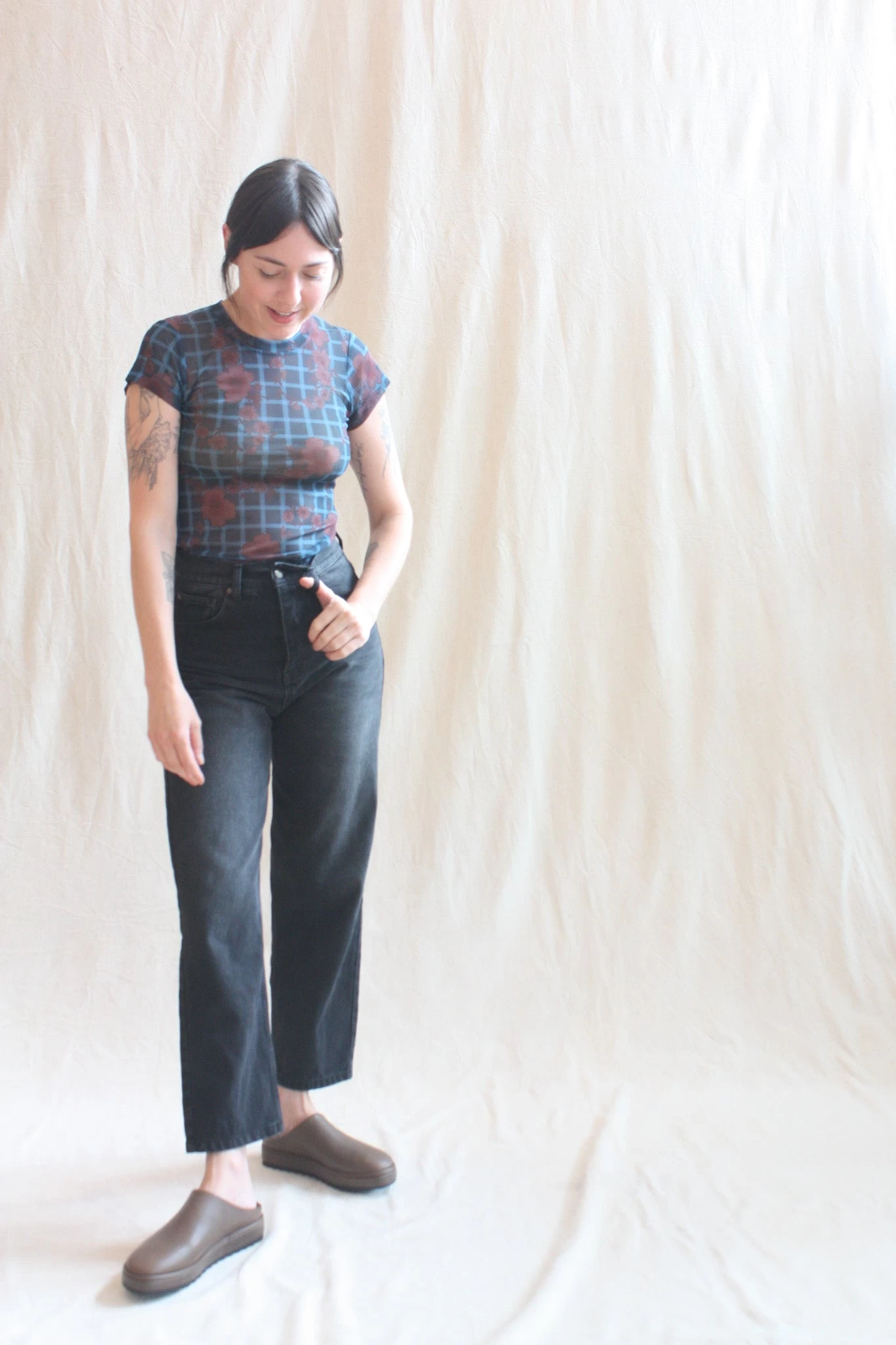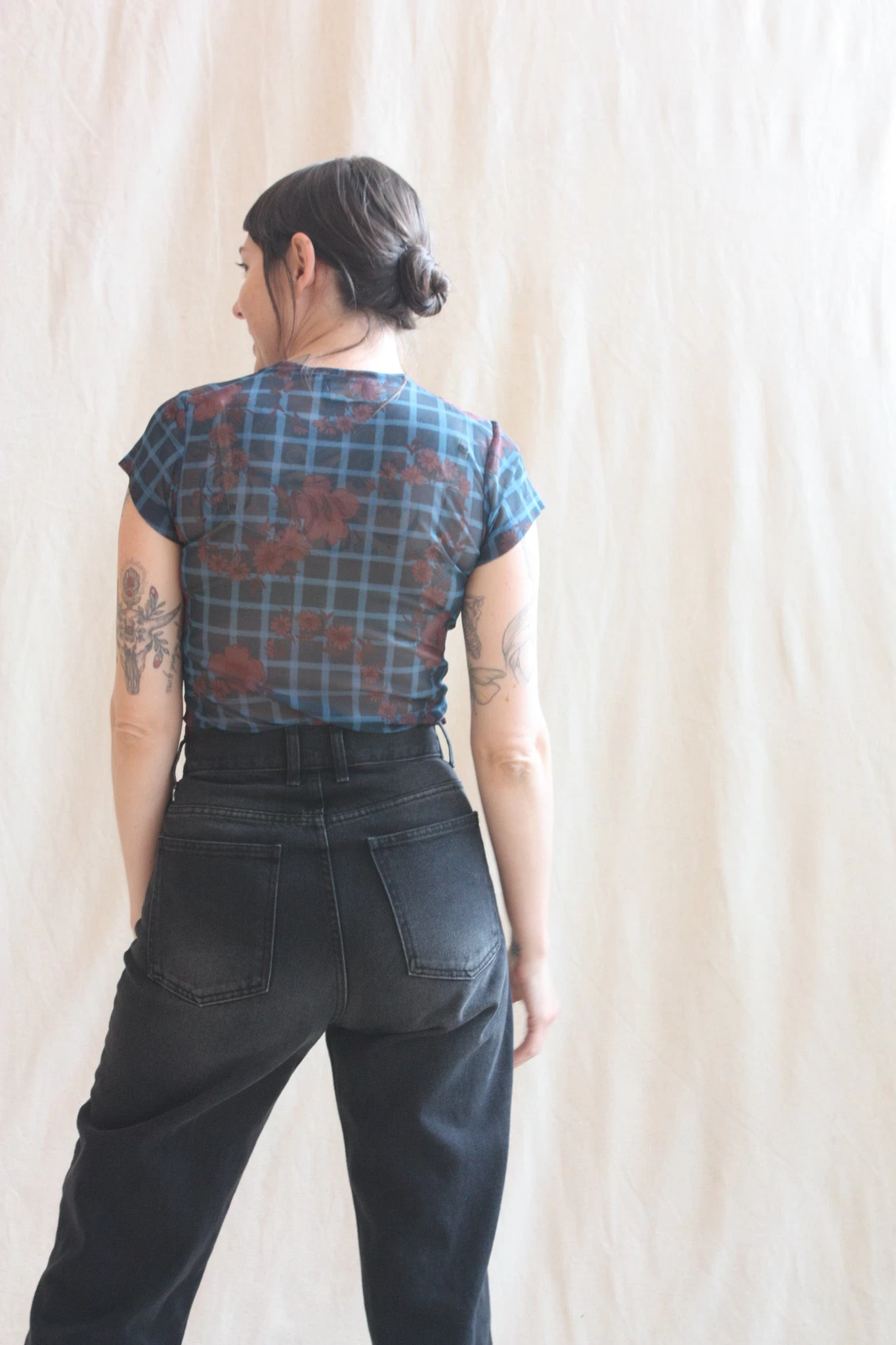 Fitted, cap sleeve, semi-sheer T-shirt in stretchy Flower Check Mesh.