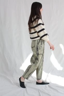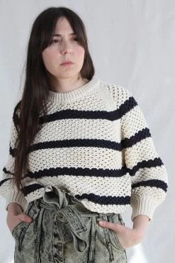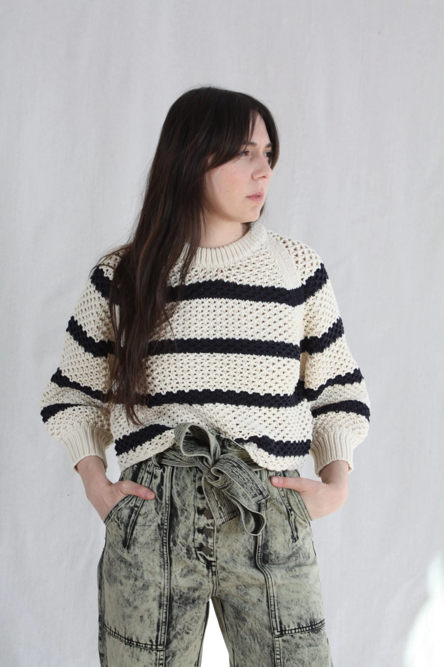 The Merel Funnel Neck Sweater is knit from a lightweight cotton blend with an easy, open weave and classic navy stripe. Cropped length with slight puff sleeve that pushes just past the elbow. Ribbed cuff and neck.