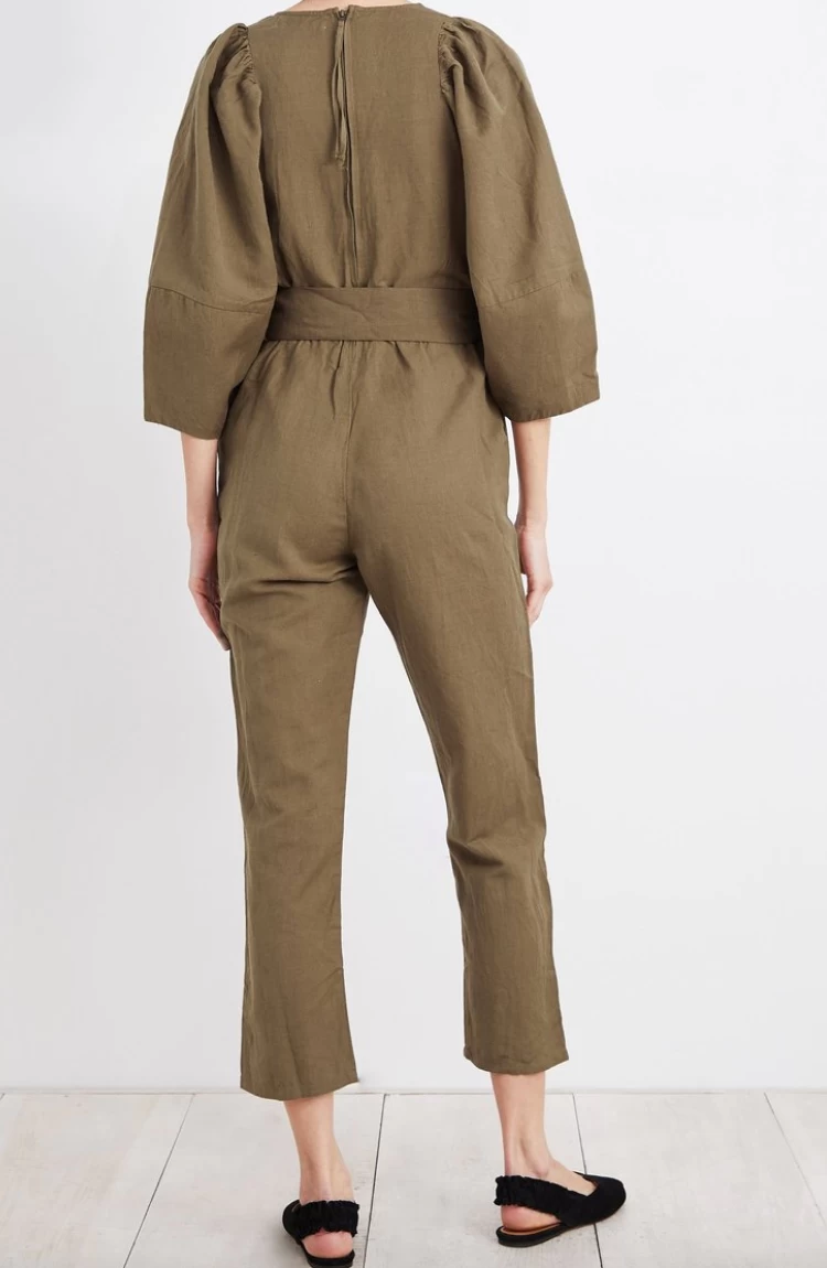 The Meru Wrap Jumpsuit is a linen blend and features a V-neckline, faux wrap tie waist, kimono sleeves, slim cropped leg, and a relaxed fit.