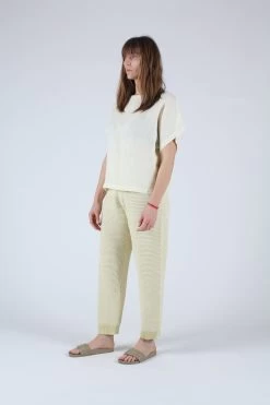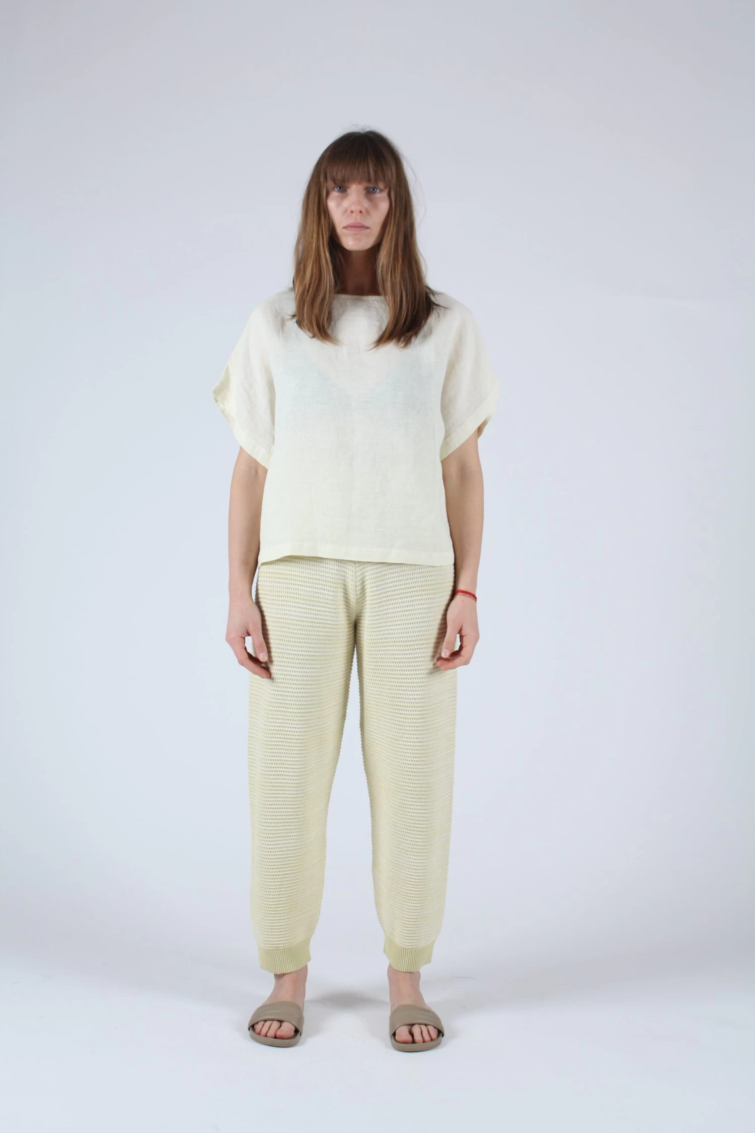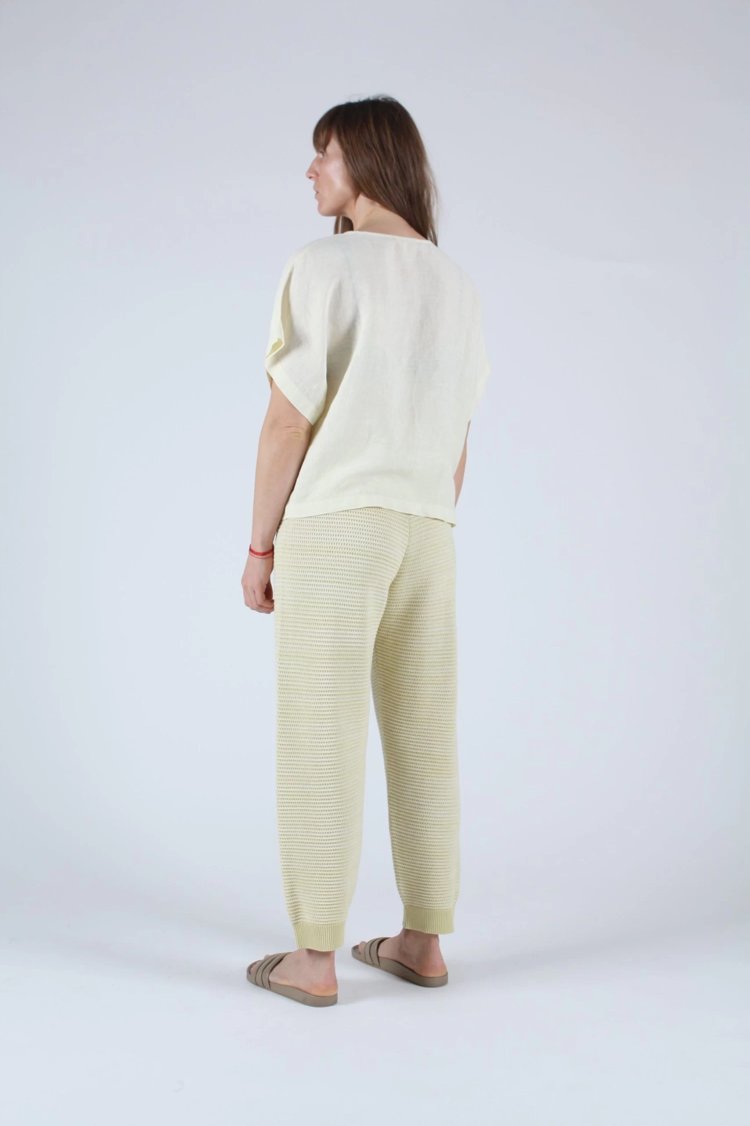Elastic waist jogger pant with a tiny mesh, crochet like stitch. This is made with a mid weight organic, color grown cotton. 50% of the yarn is the natural cotton color and 50% is dyed creating a marled affect.