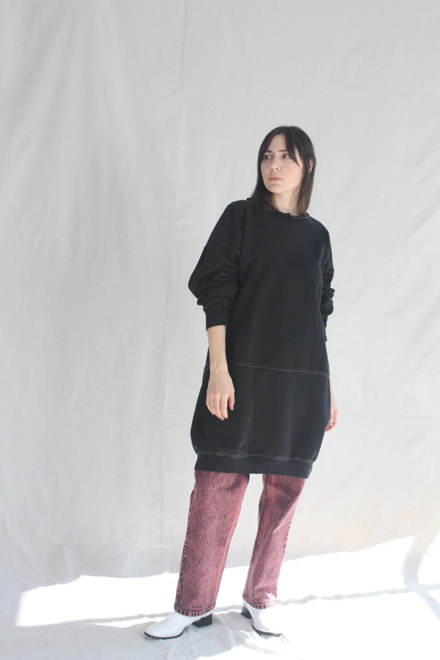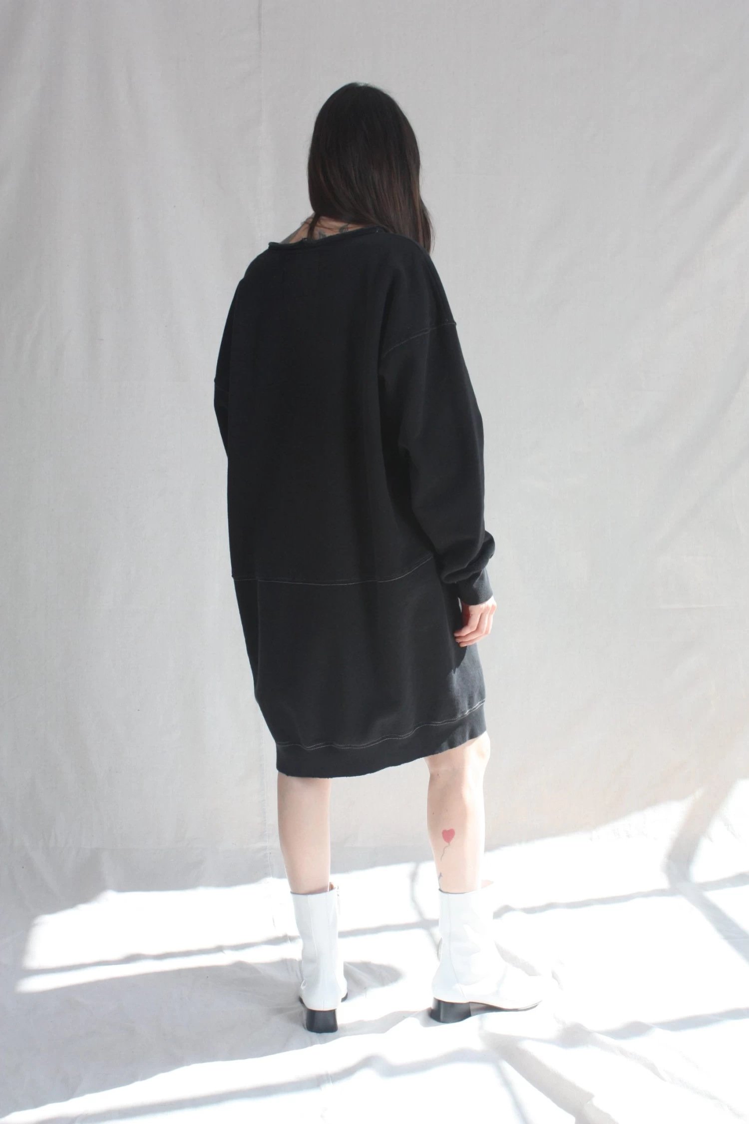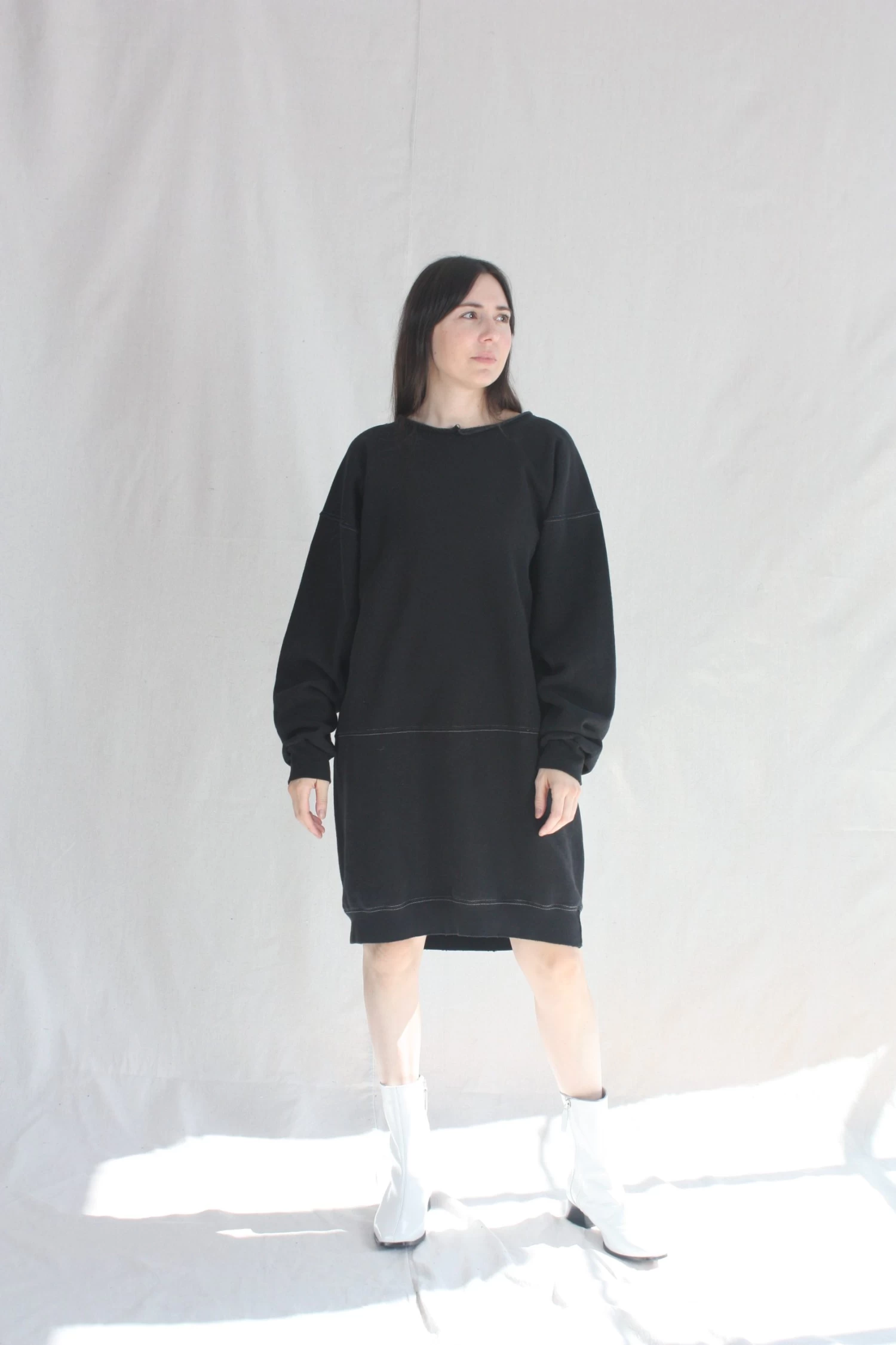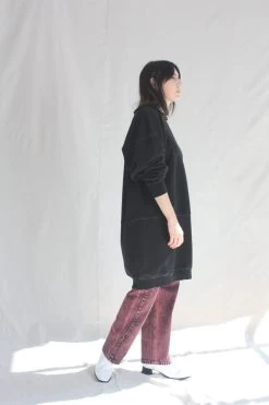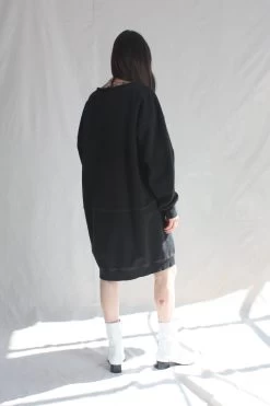 A knee-length dress version of a favorite, vintage-inspired RC sweatshirt, with wide raw-edge neckline, drop shoulders, voluminous sleeves, and unique distressing throughout.